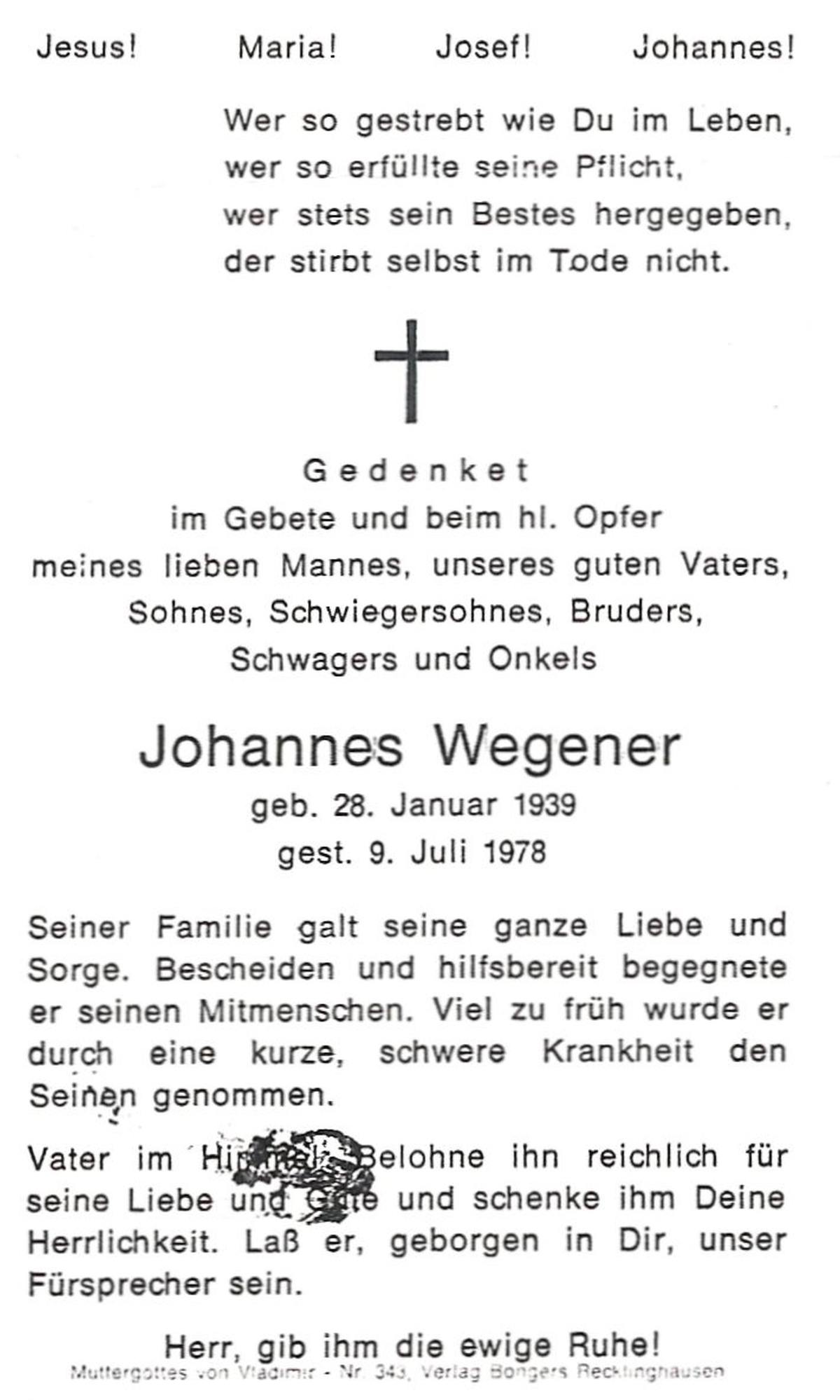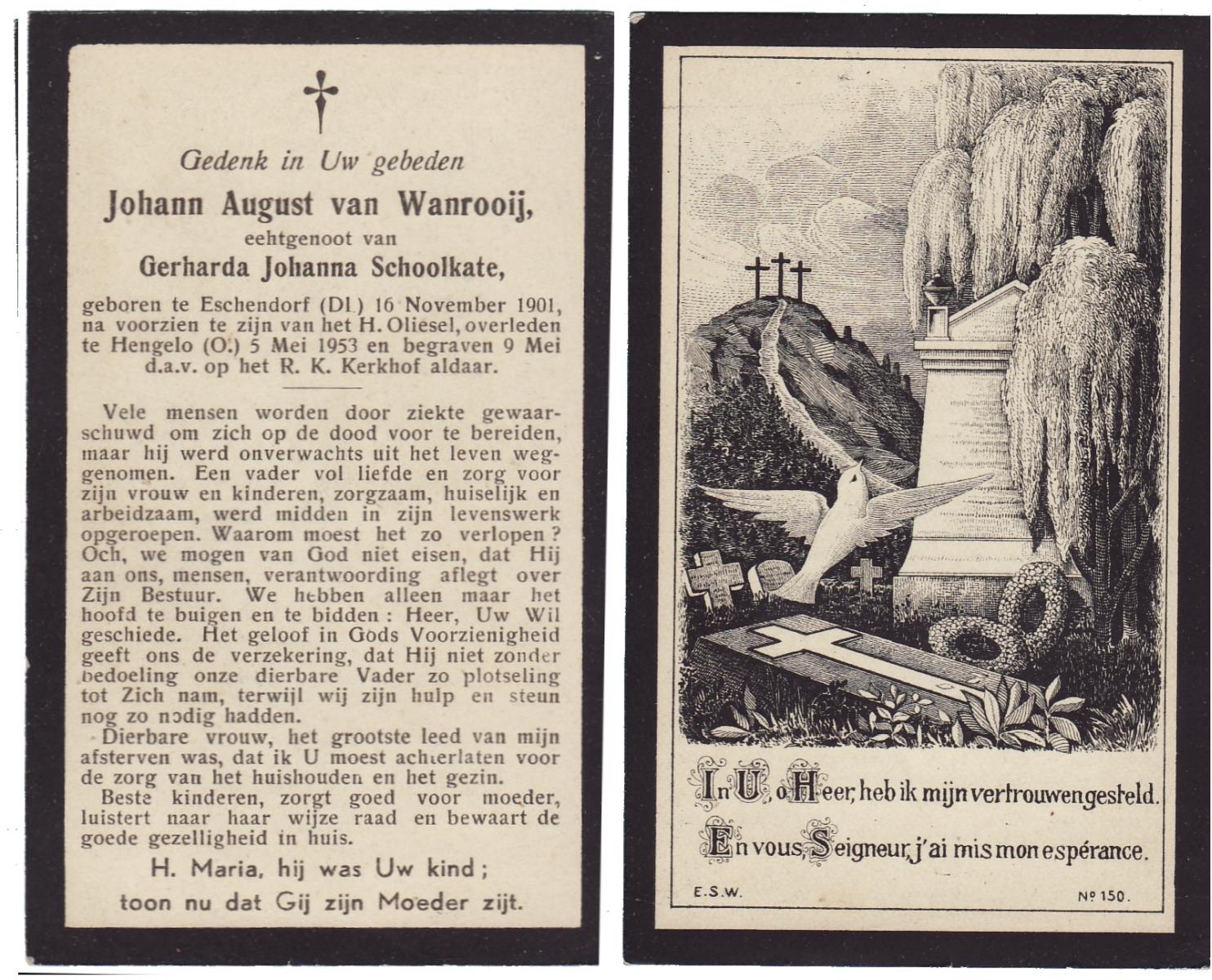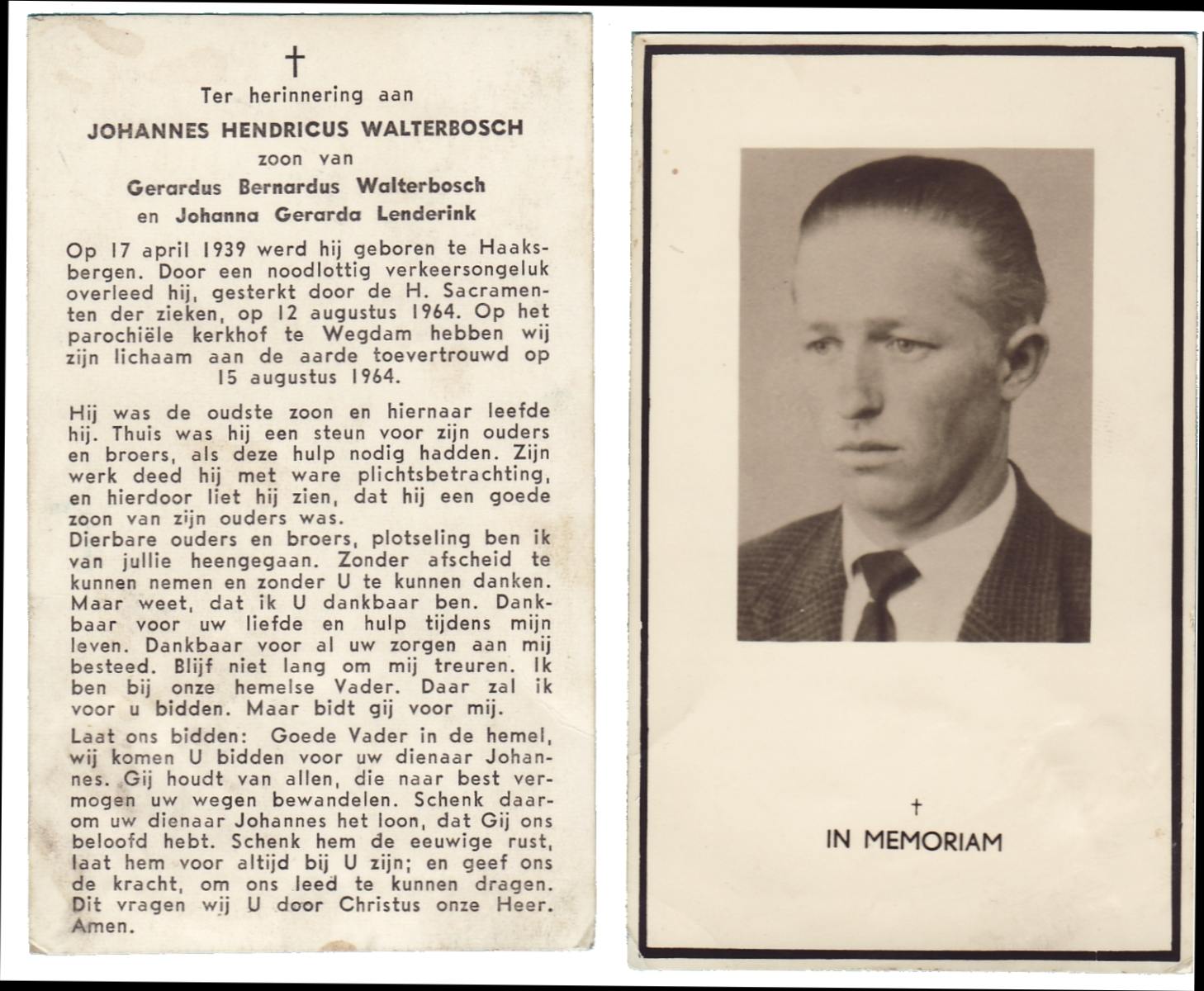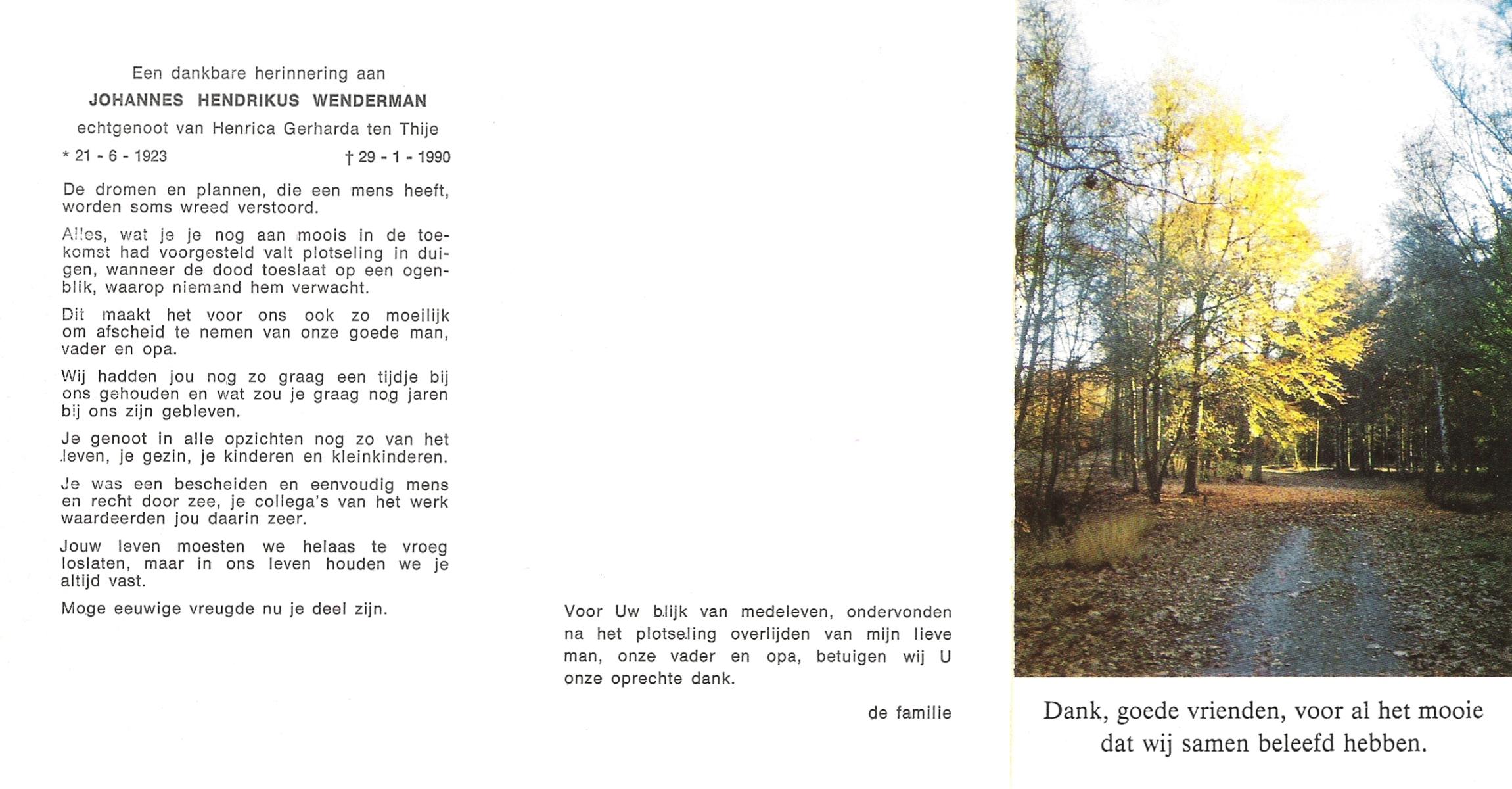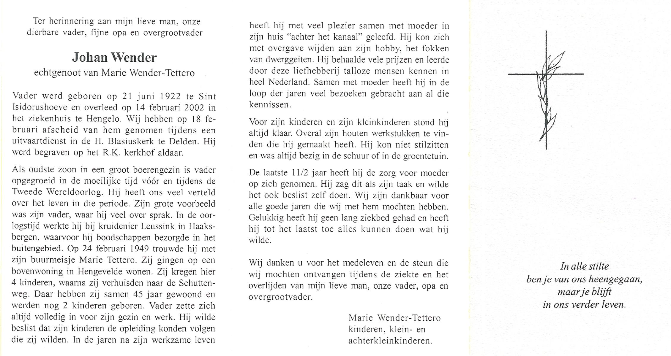 WENDER, Johan, geboren op 21-6-1922 te St. Isidorushoeve (gemeente Haaksbergen), overleden op 14-2-2002 te Hengelo (Ov.) op 79-jarige leeftijd, begraven op 18-2-2002 te Delden parochie-kerkhof H.Blasius.
