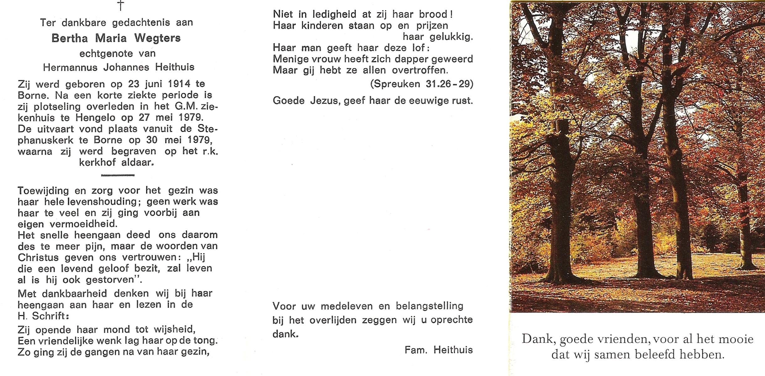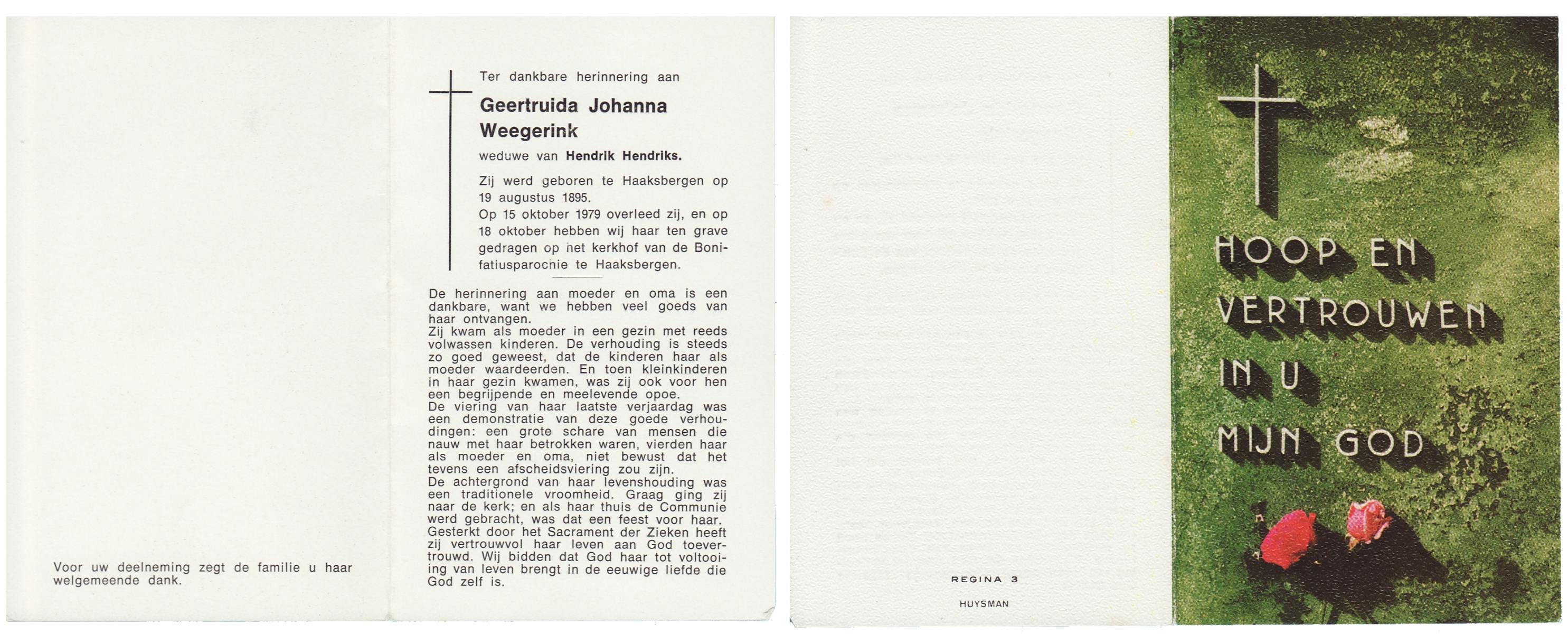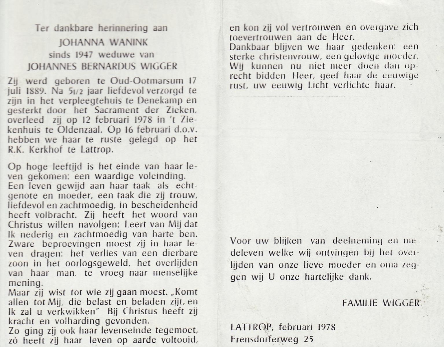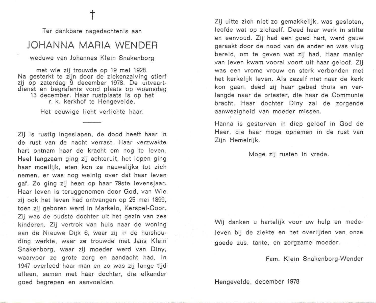 WENDER, Johanna Maria, geboren op 25-05-1899 te Markelo, overleden op 9-12-1978 op 79-jarige leeftijd, begraven op 13-12-1978 te Hengevelde.