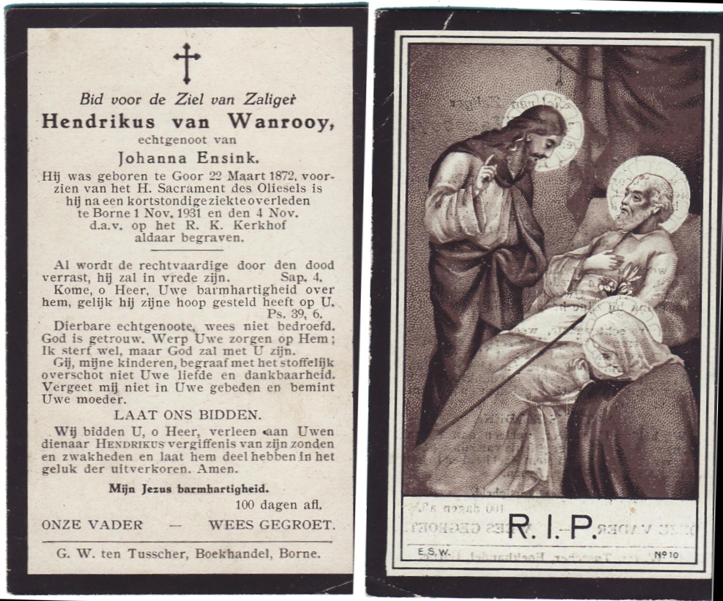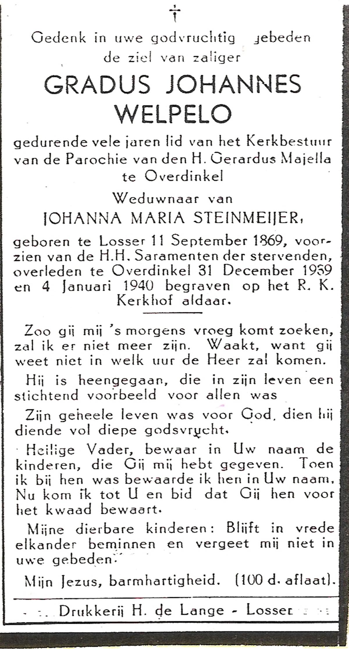 WELPELO, Gradus Johannes, geboren op 11-09-1869 te Losser, overleden op 31-12-1939 te Overdinkel op 70-jarige leeftijd, begraven op 4-1-1940 te Overdinkel.