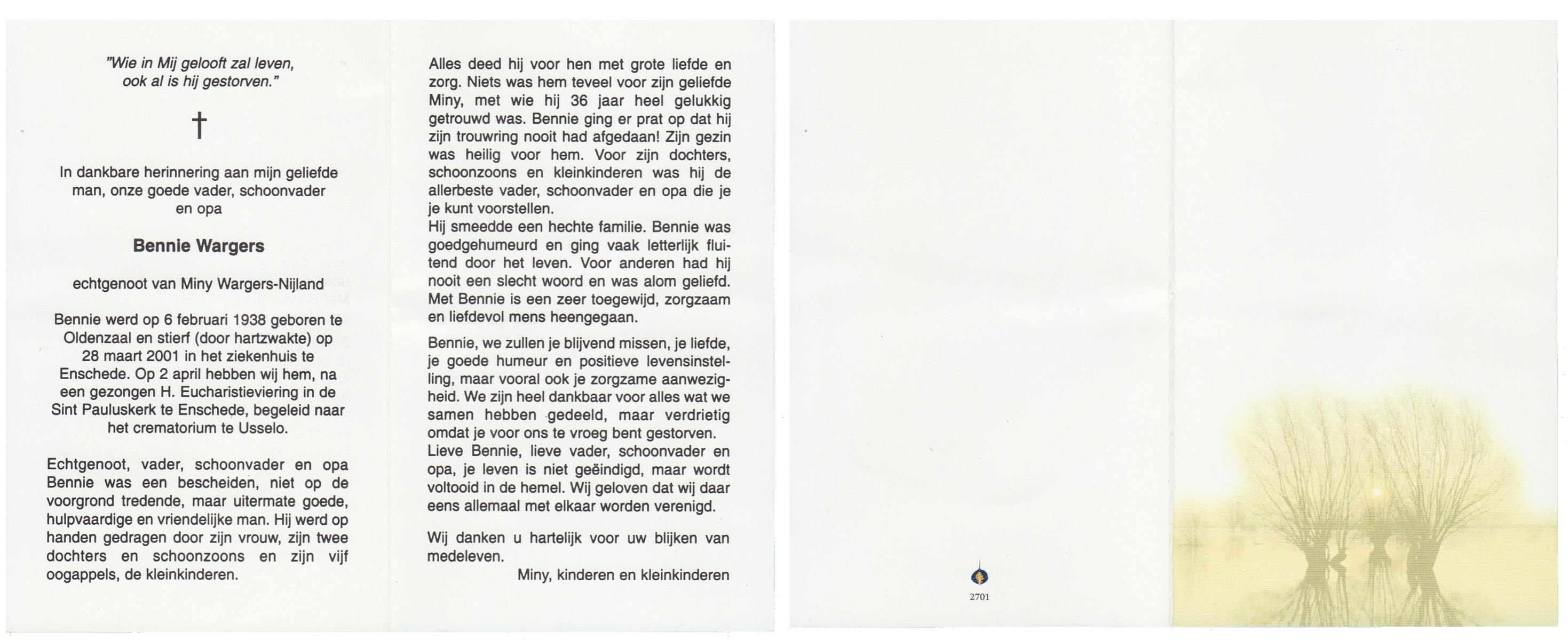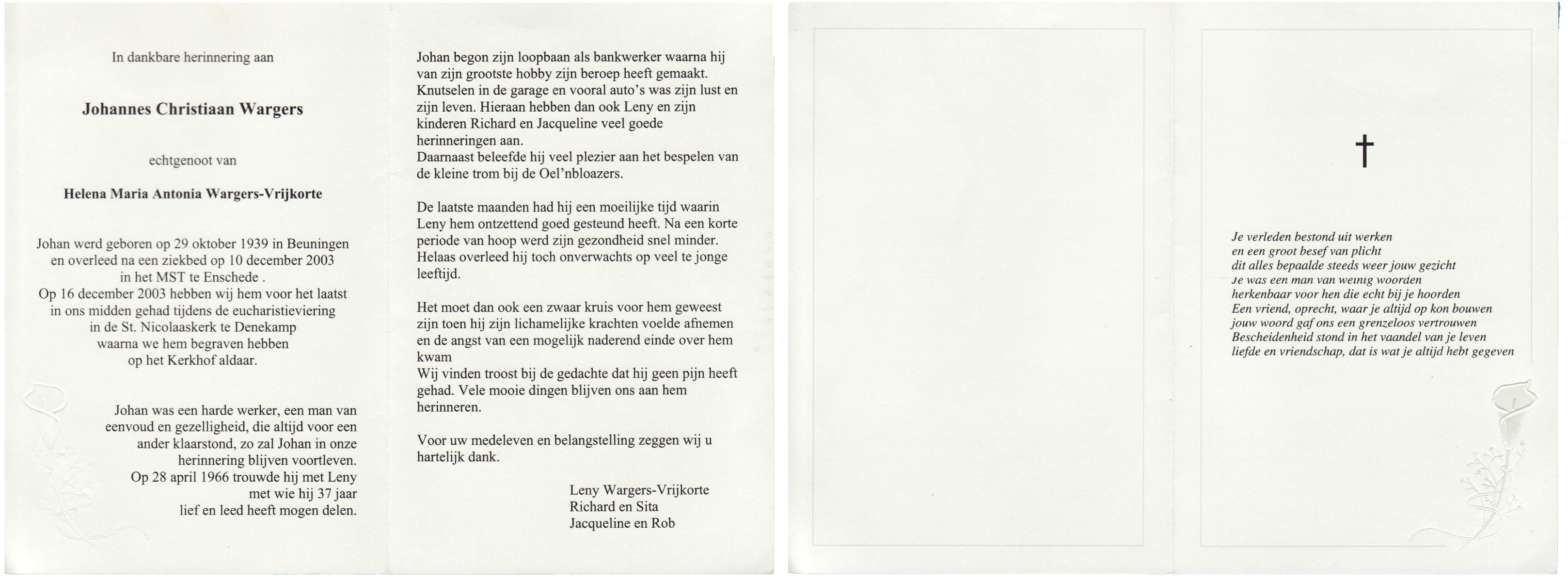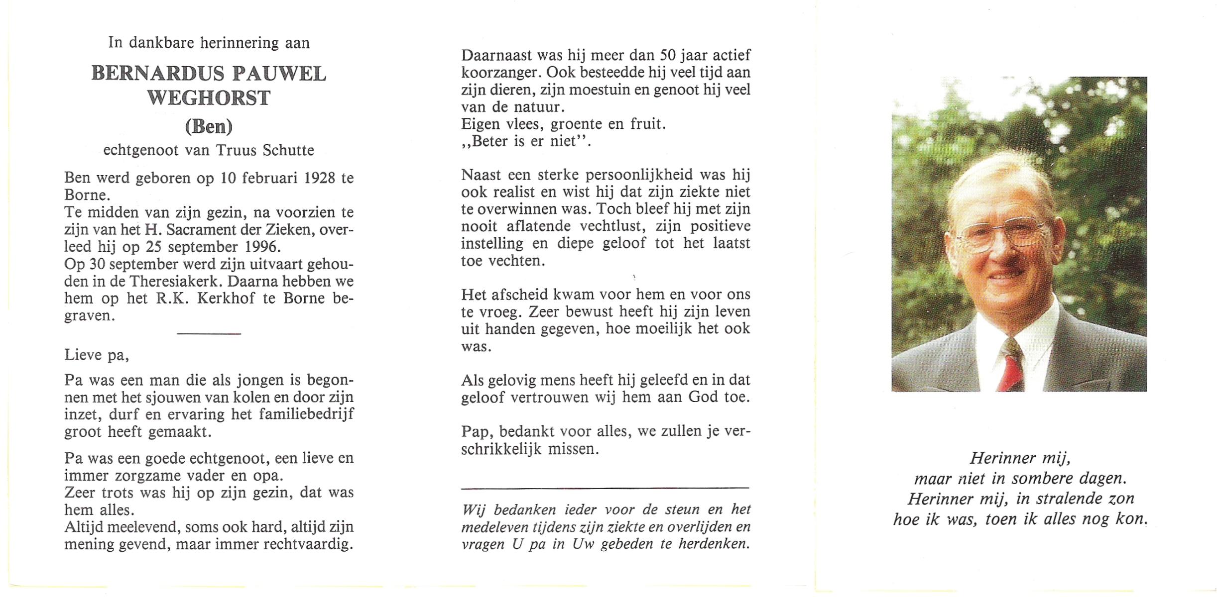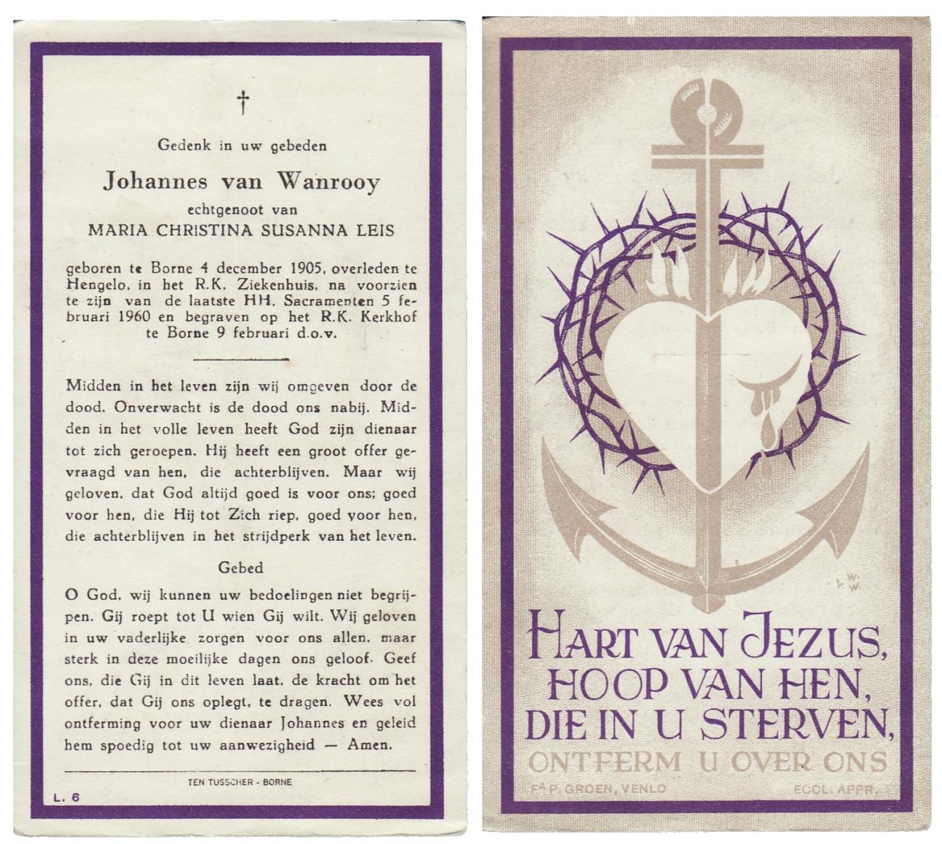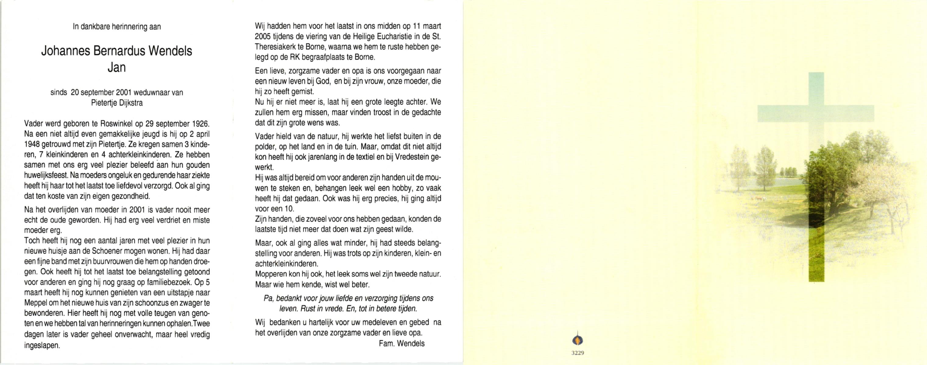 WENDELS, , Johannes Bernardus (Jan), geboren op 29-9-1926 te Roswinkel, overleden op 7-3-2005 op 78-jarige leeftijd, begraven op 11-3-2005 te Borne.