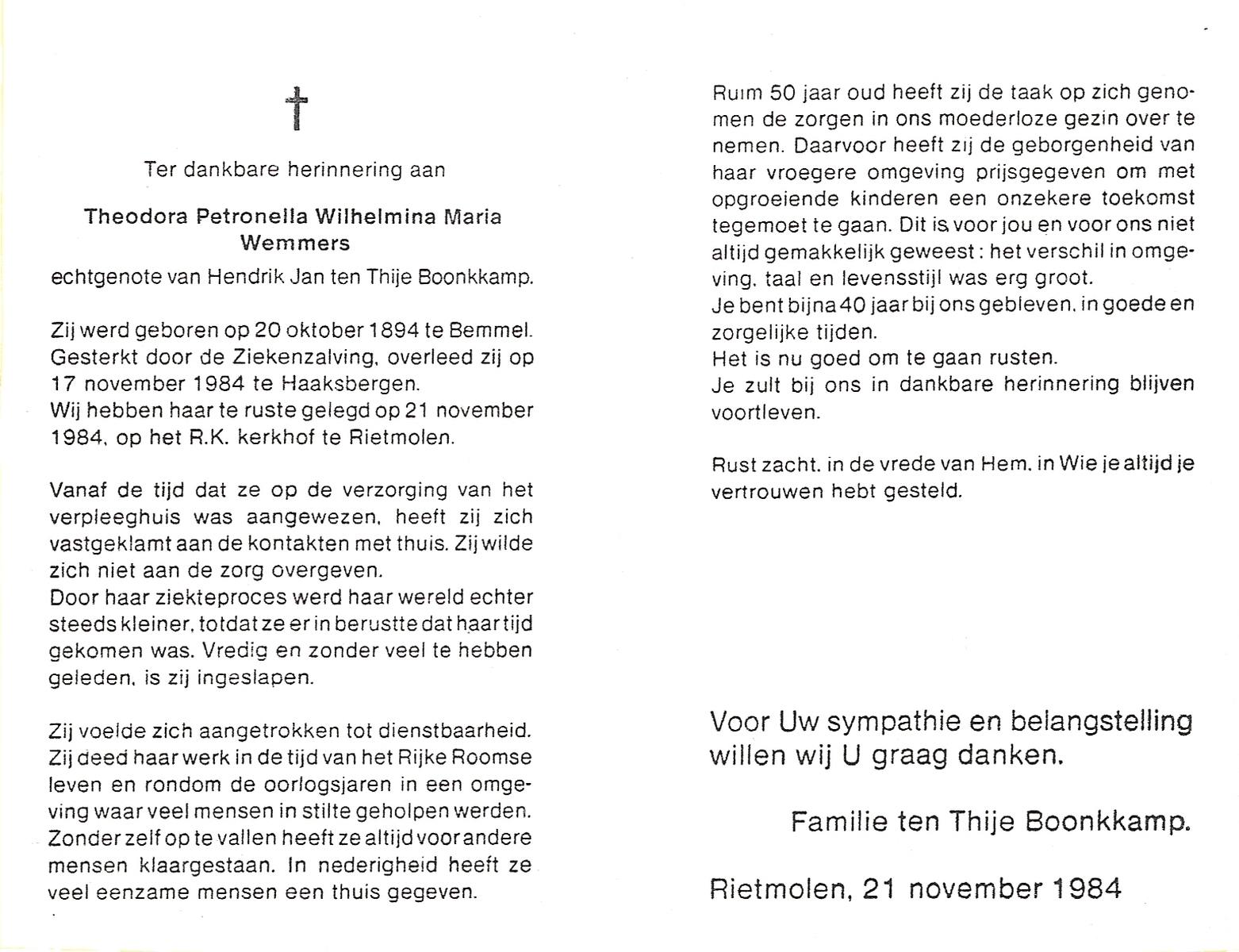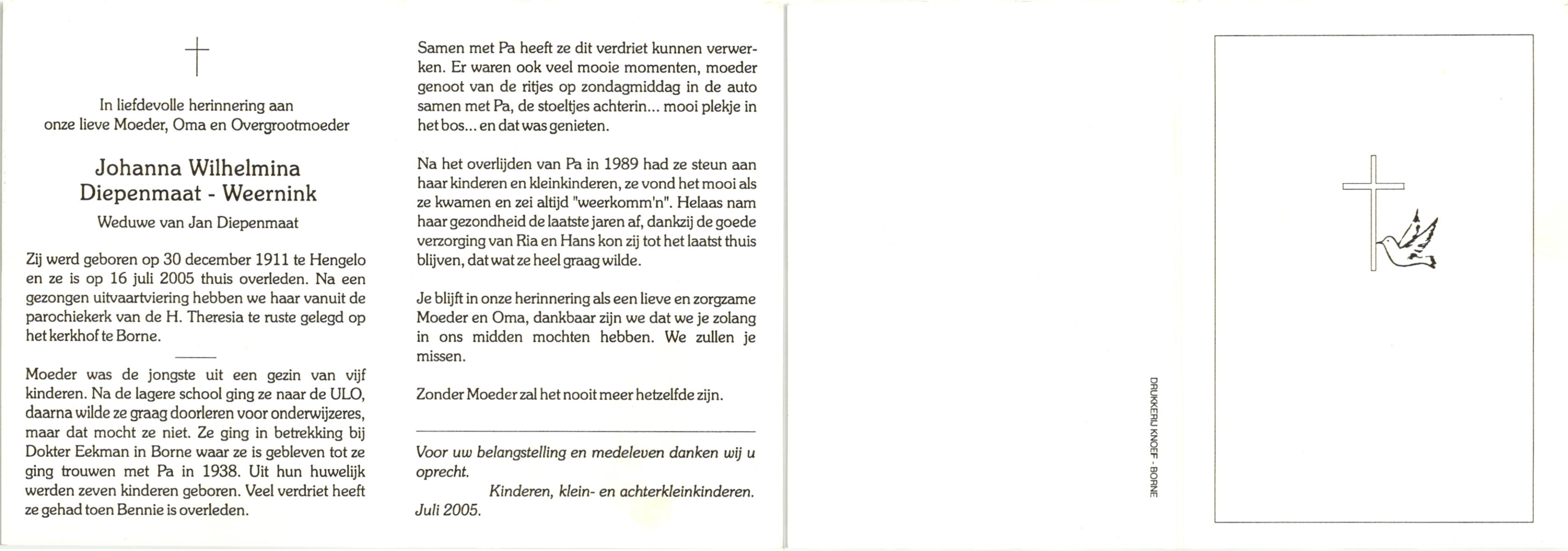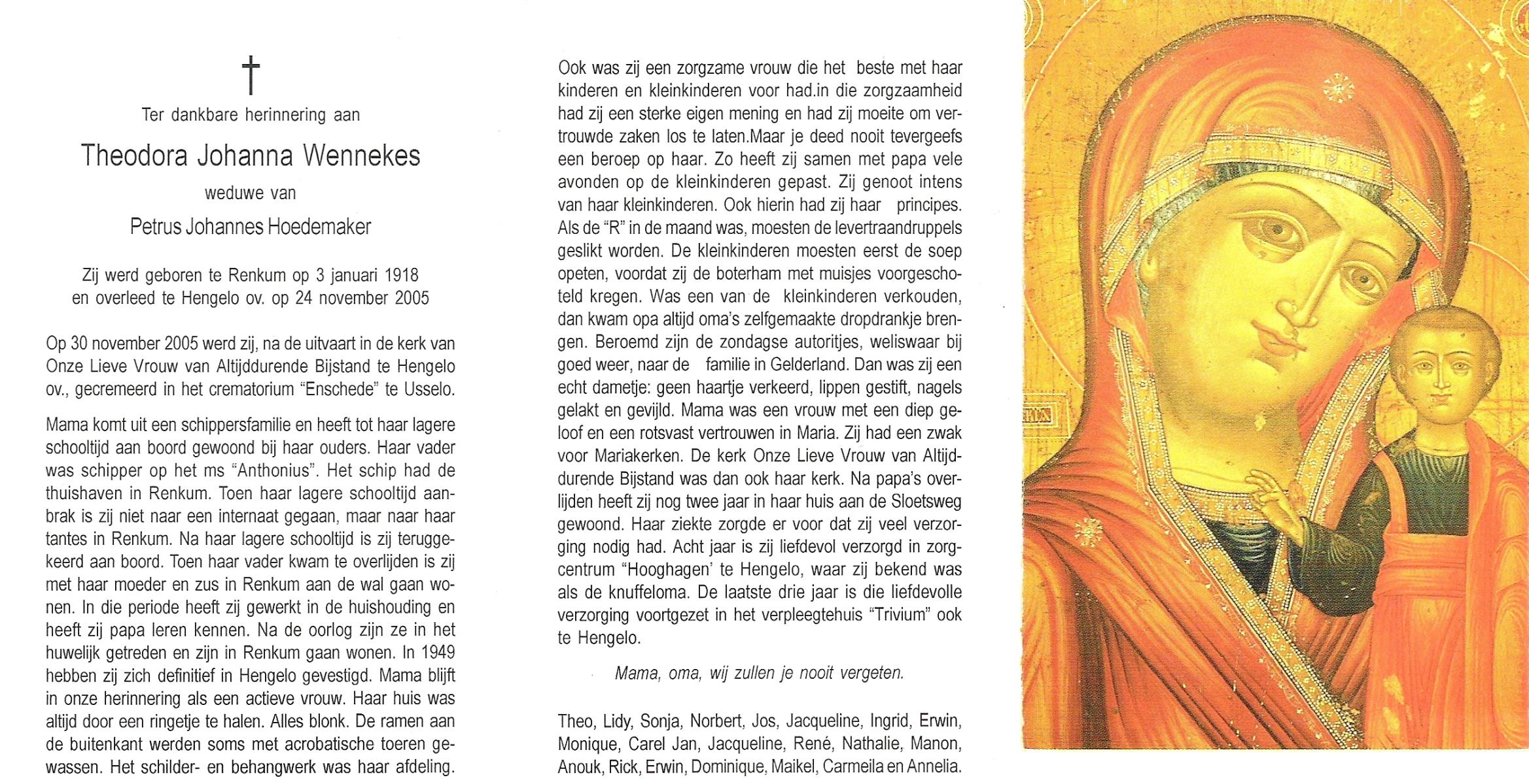 WENNEKES, Theodora Johanna, geboren op 3-1-1918 te Renkum, overleden op 24-11-2005 te Hengelo (Ov.) op 87-jarige leeftijd, gecremeerd op 30-11-2005 te Usselo.
