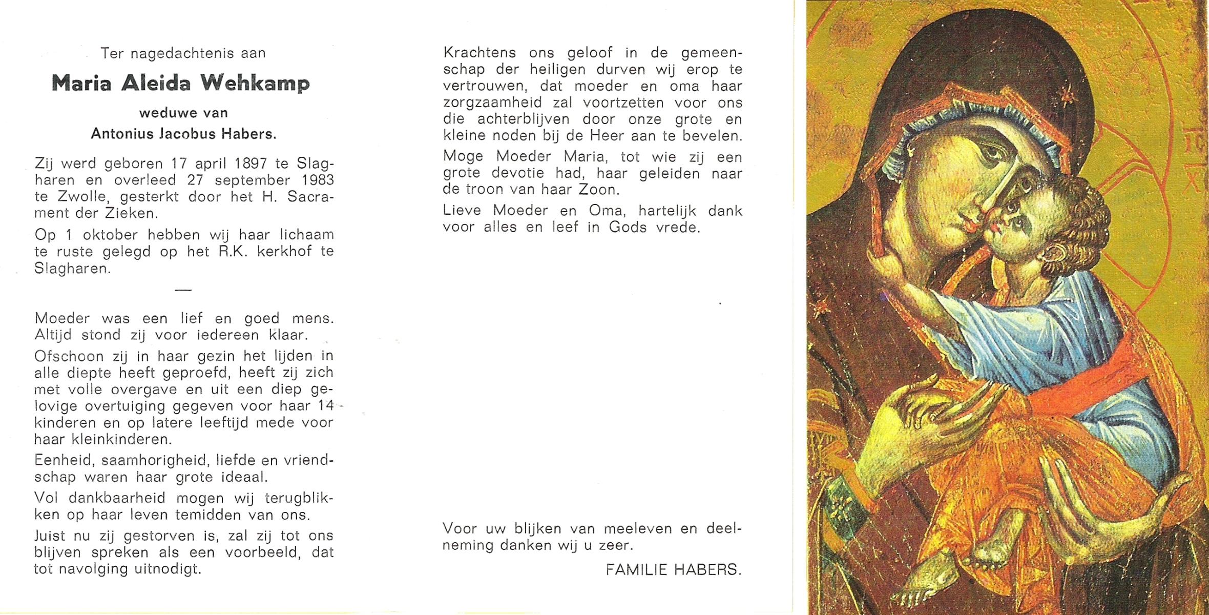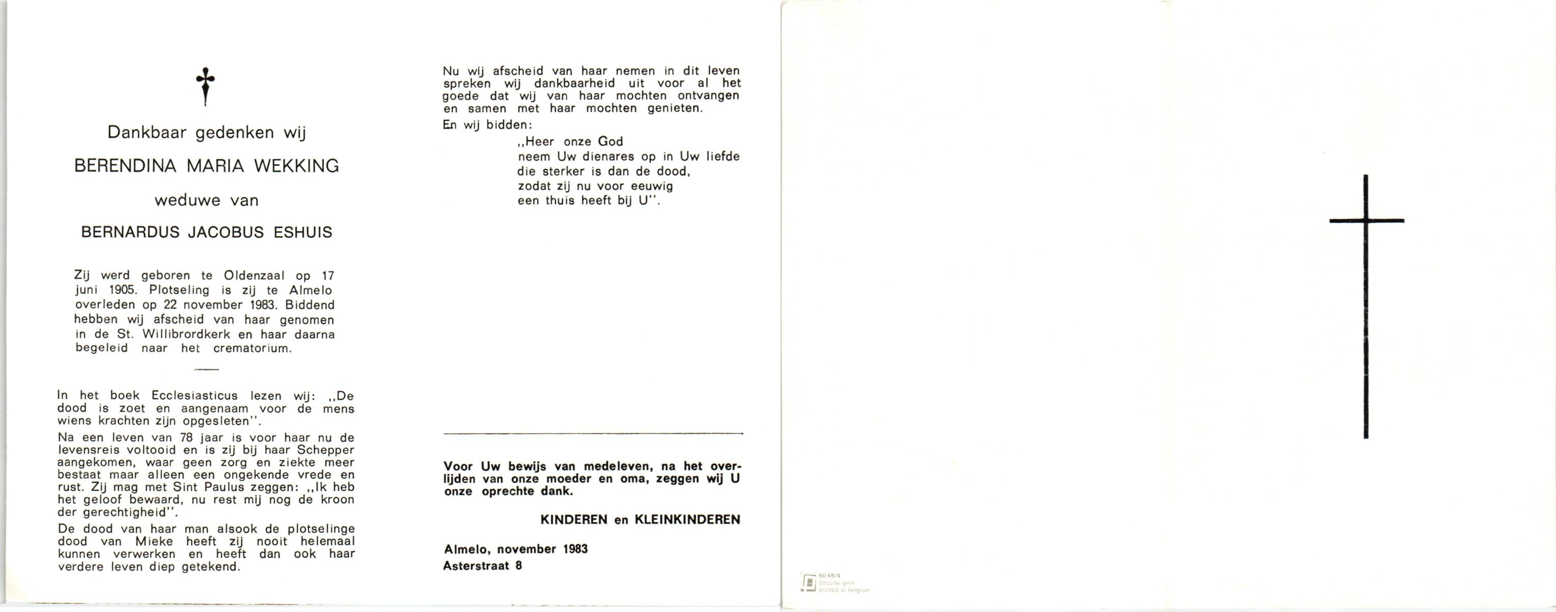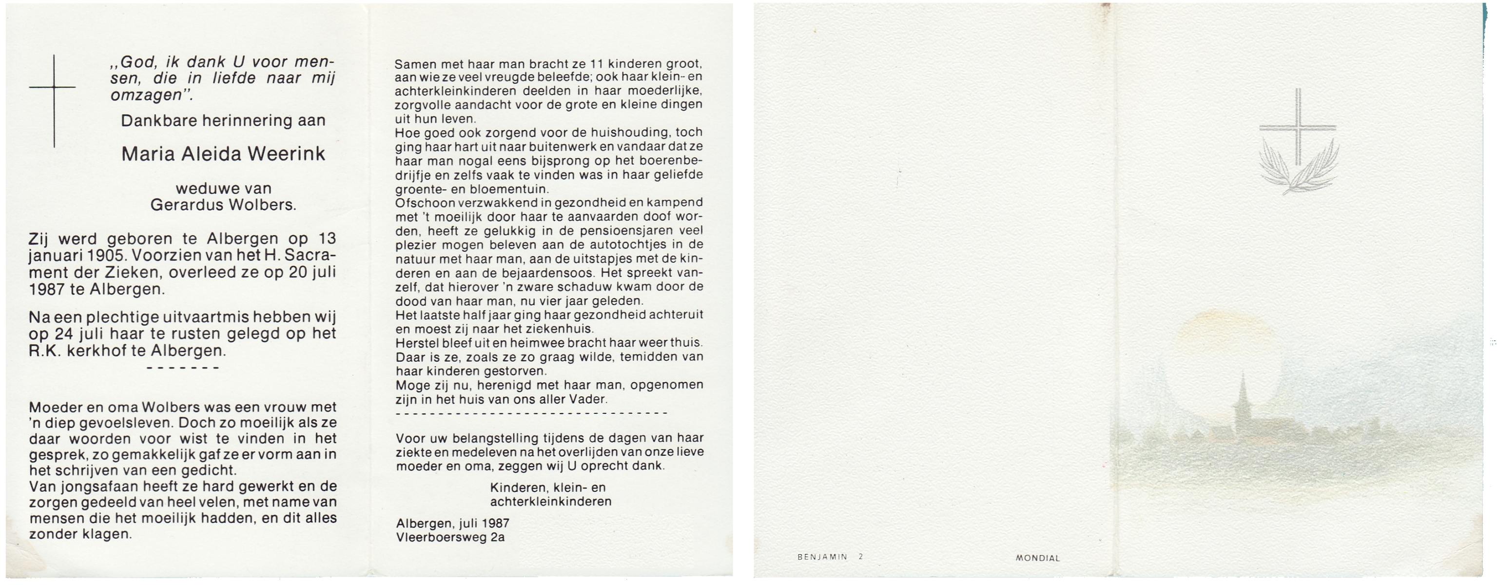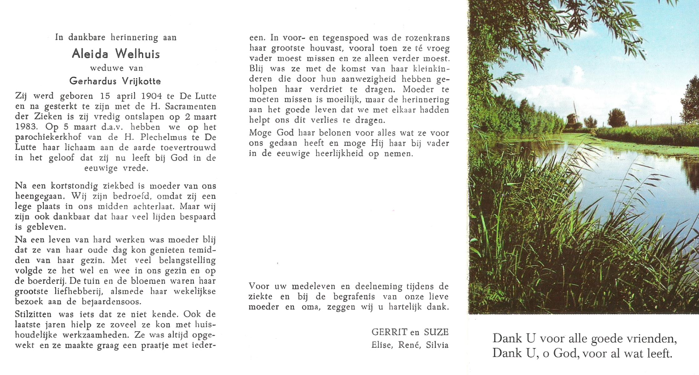 WELHUIS, Aleida, geboren op 15-4-1904 te De Lutte, overleden op 2-3-1983 op 78-jarige leeftijd, begraven op 5-3-1983 te De Lutte.