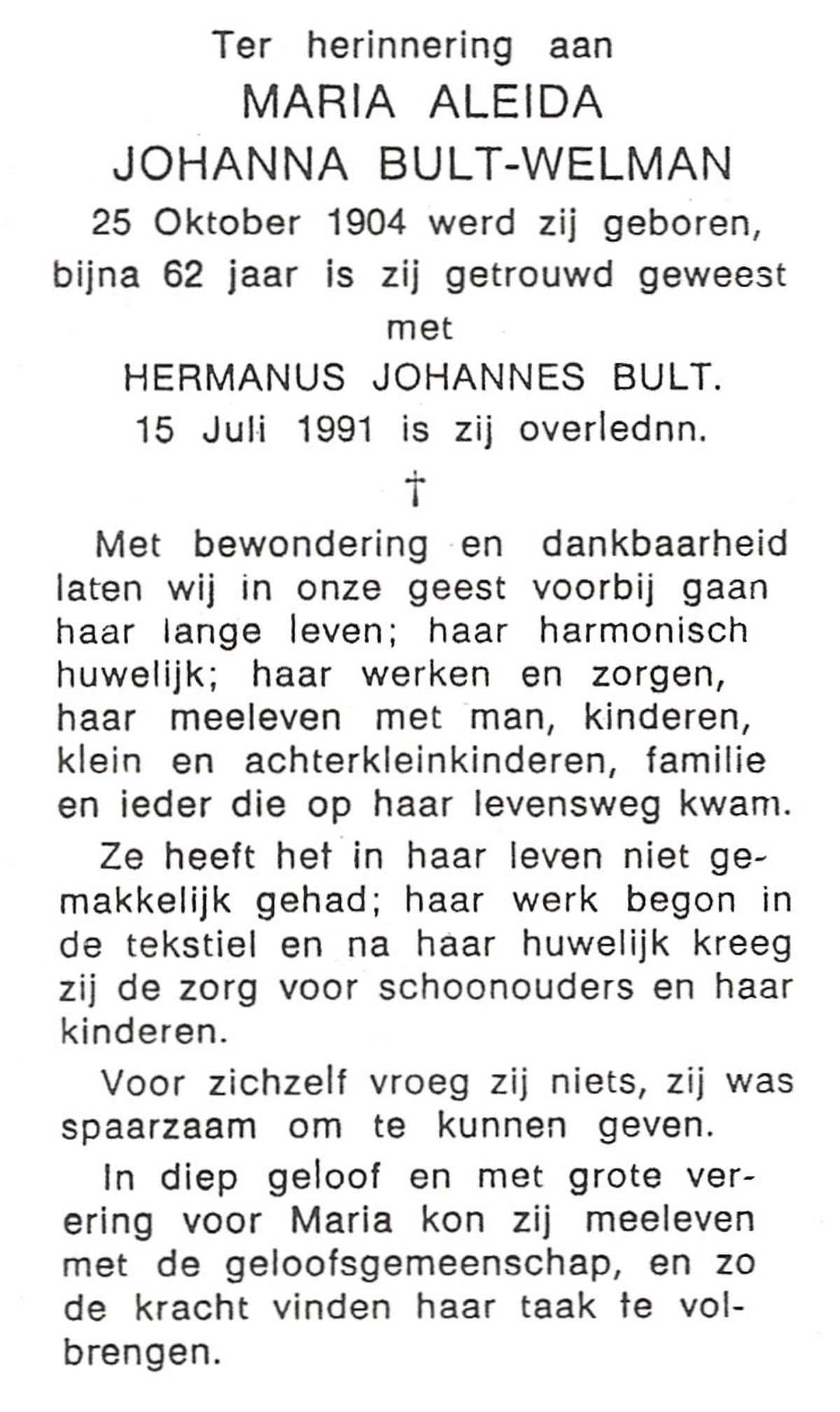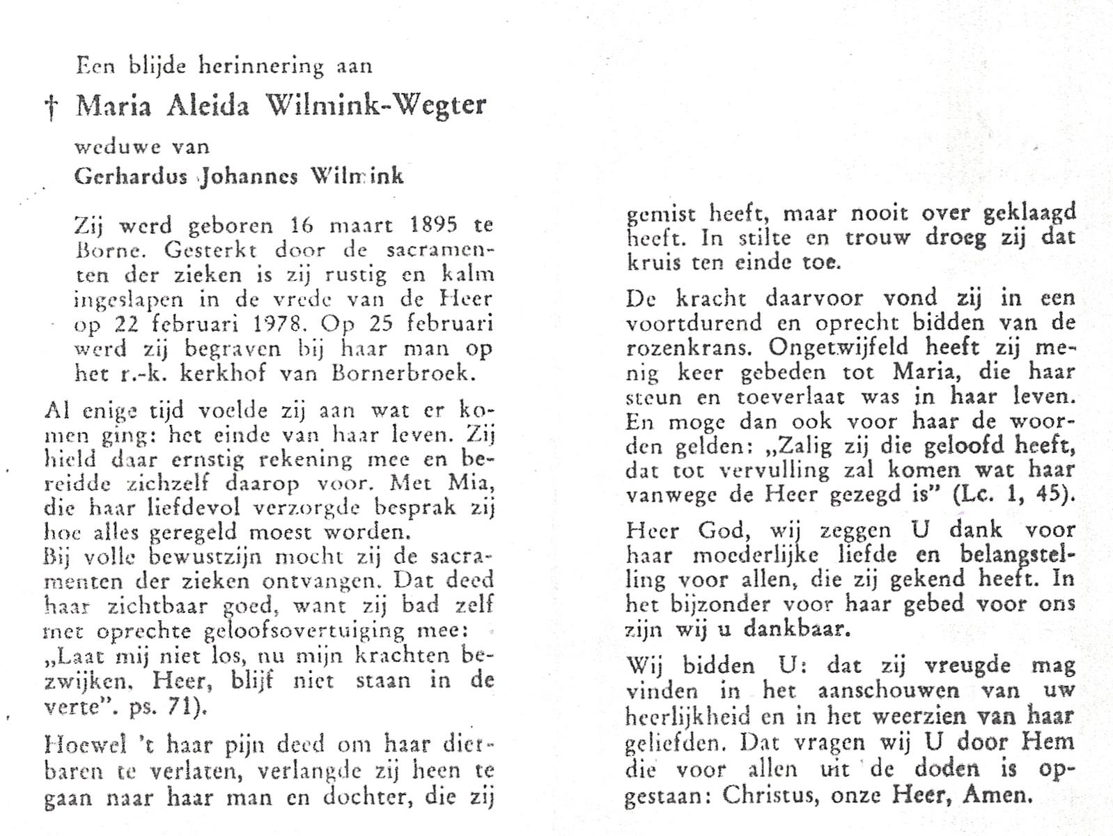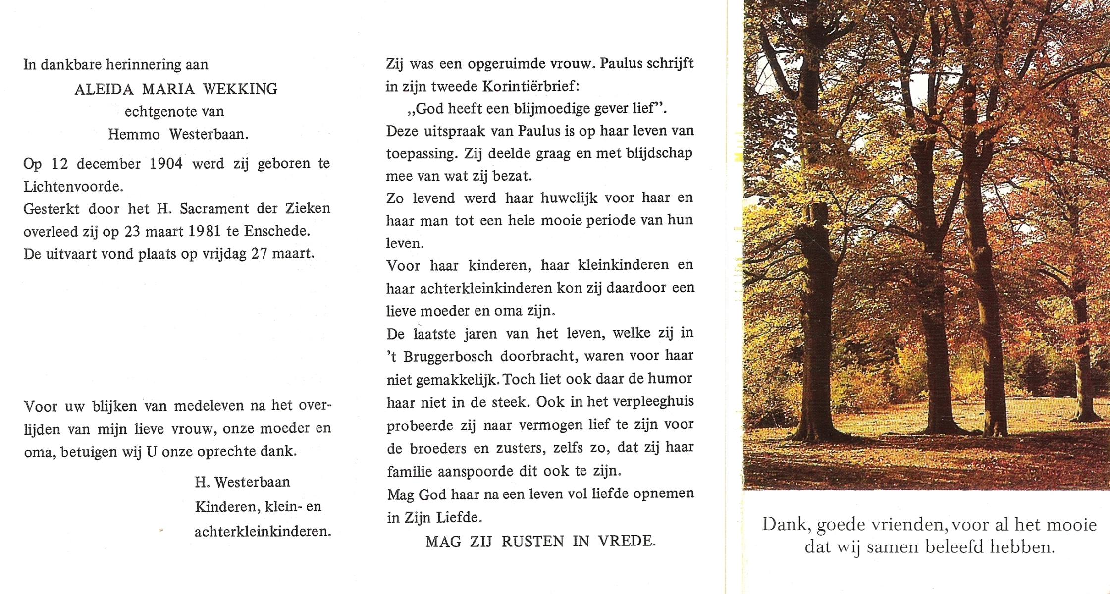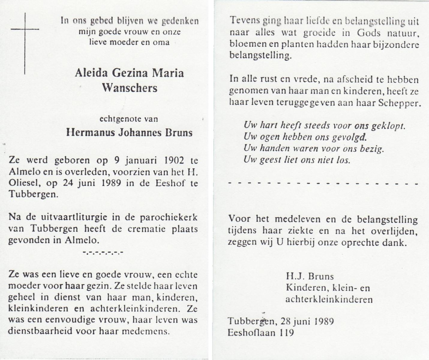 WELHUIS, Aleida, geboren op 15-4-1904 te De Lutte, overleden op 2-3-1983 op 78-jarige leeftijd, begraven op 5-3-1983 te De Lutte.