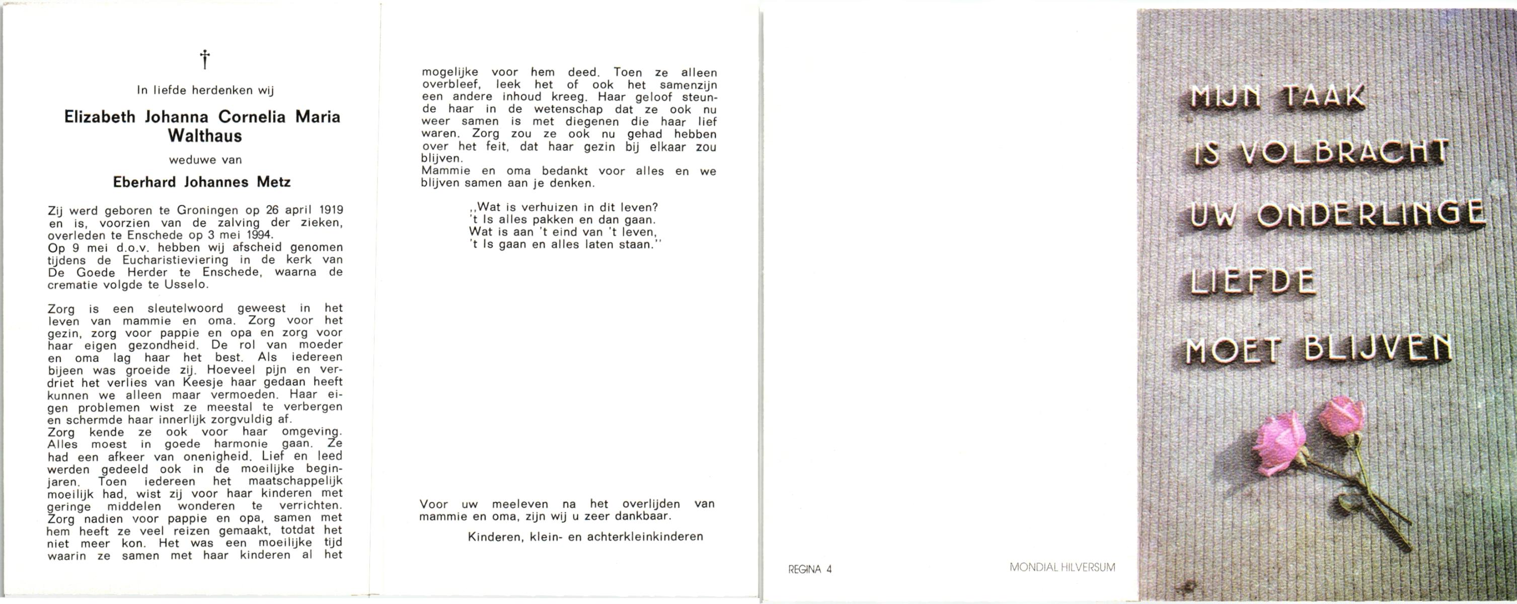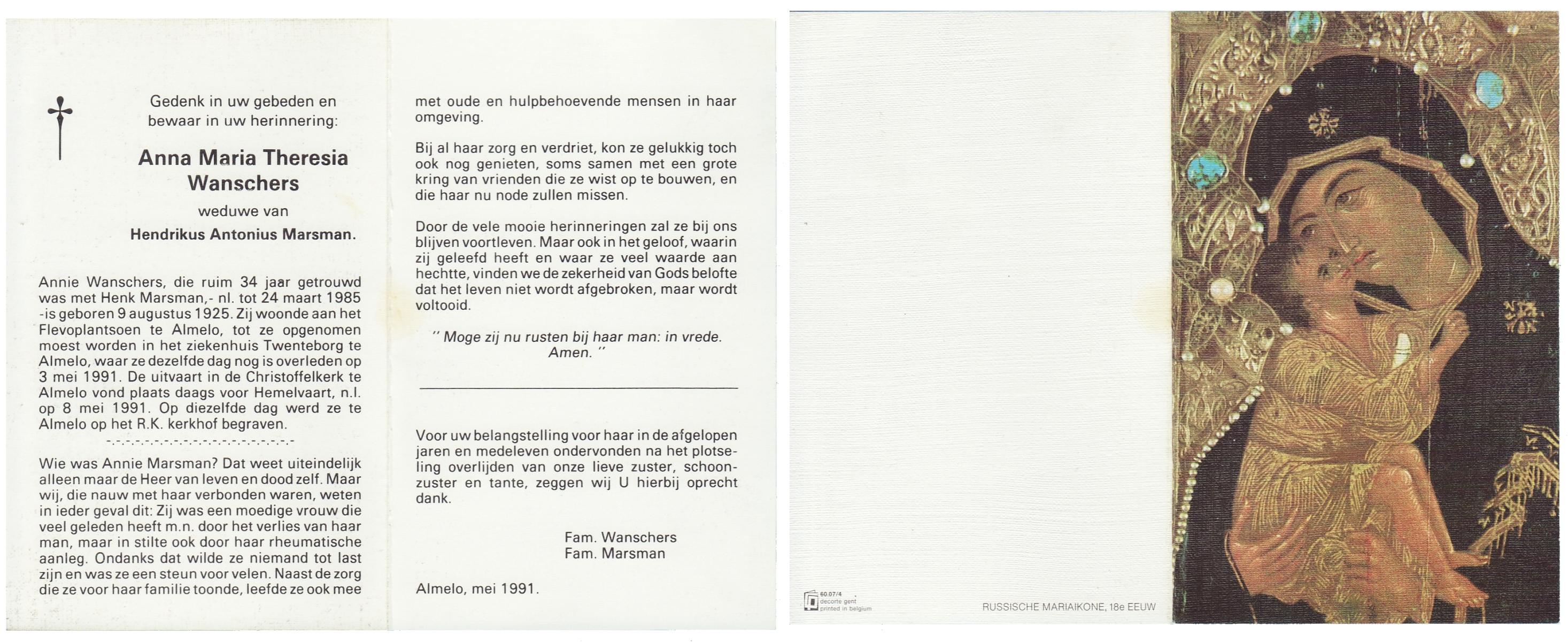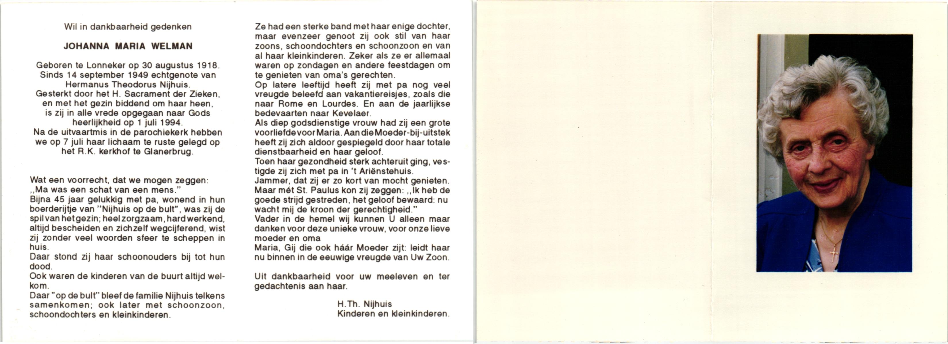 WELMAN, , Johanna Maria, geboren op 30-8-1918 te Lonneker, overleden op 1-7-1994 op 75-jarige leeftijd, begraven op 7-7-1994 te Glanerbrug.