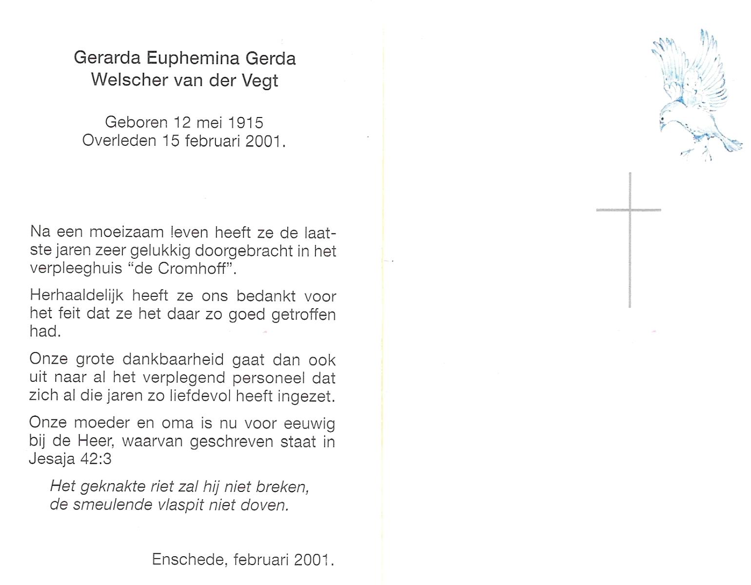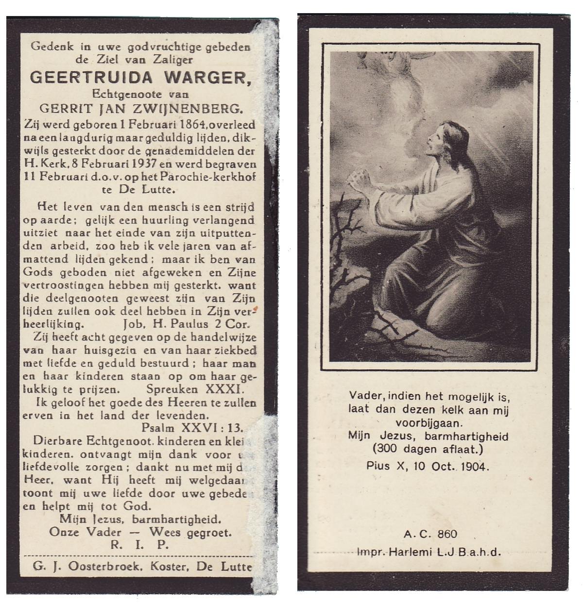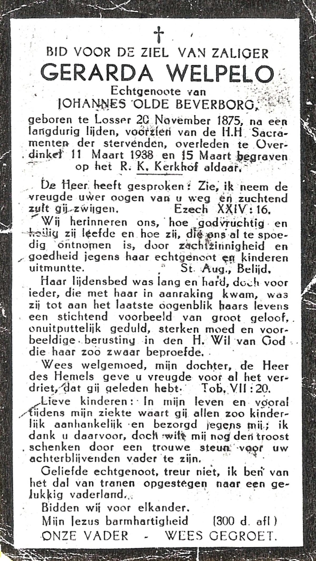 WELPELO, Gerarda, geboren op 20-11-1875 te Losser, overleden op 11-3-1938 te Overdinkel op 62-jarige leeftijd, begraven op 15-3-1938 te Overdinkel.