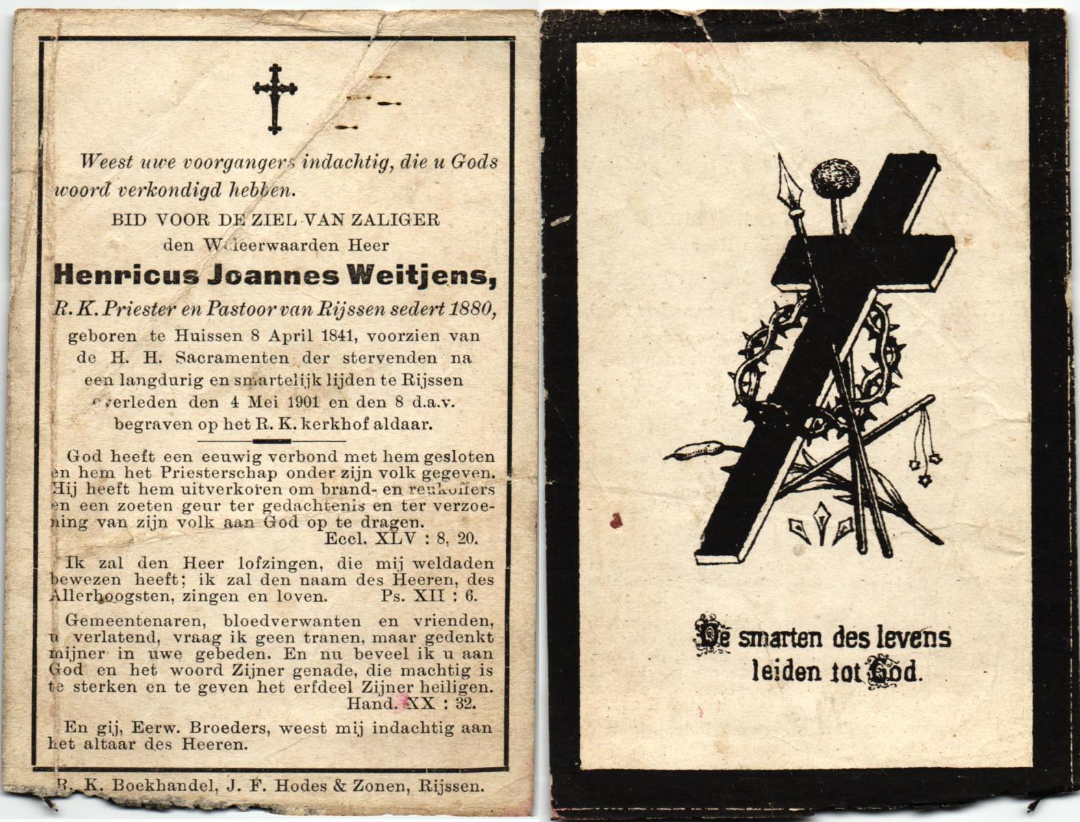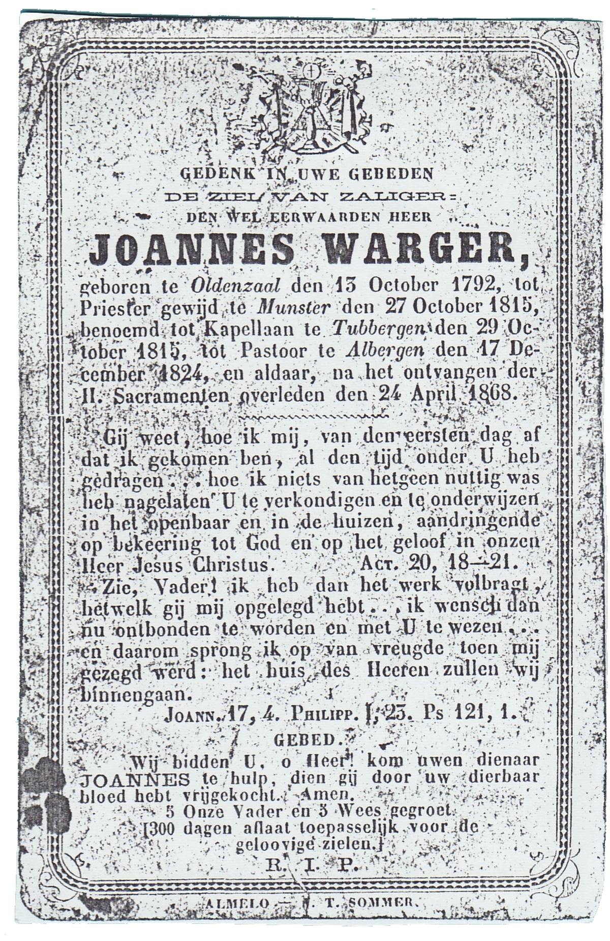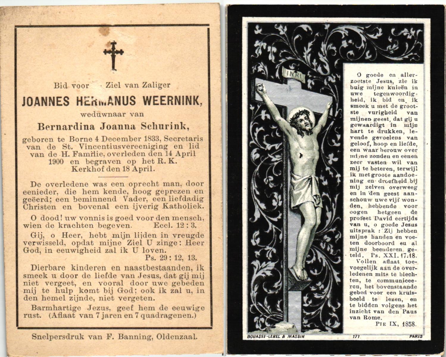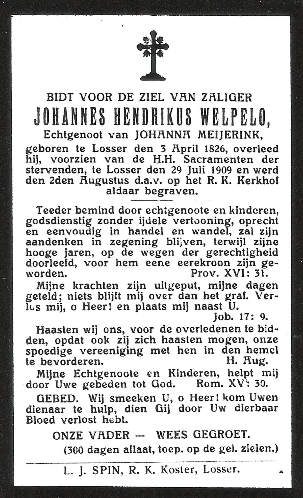 WELPELO, Johannes Hendrikus, geboren op 03-04-1826 te Losser, overleden op 29-7-1909 te Losser op 83-jarige leeftijd, begraven op 2-8-1909 te Losser R.K.Kerkhof.