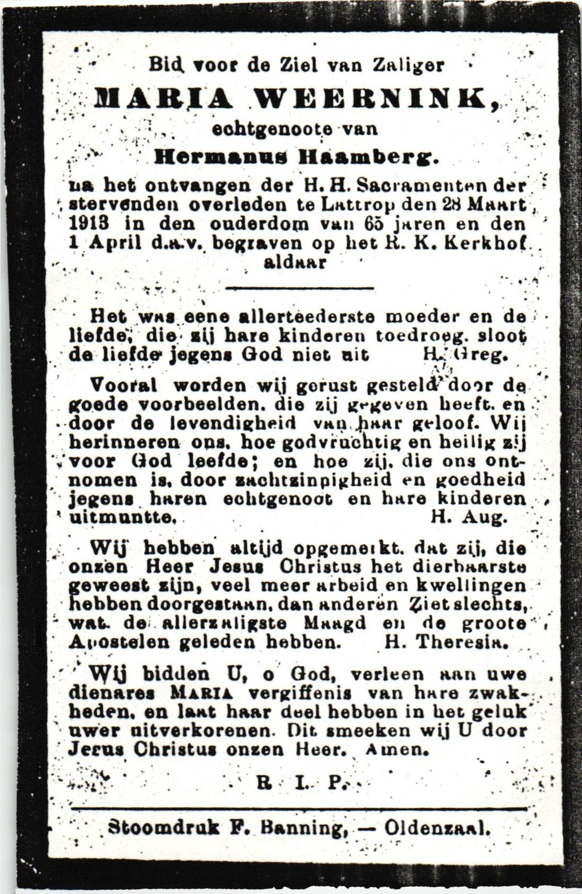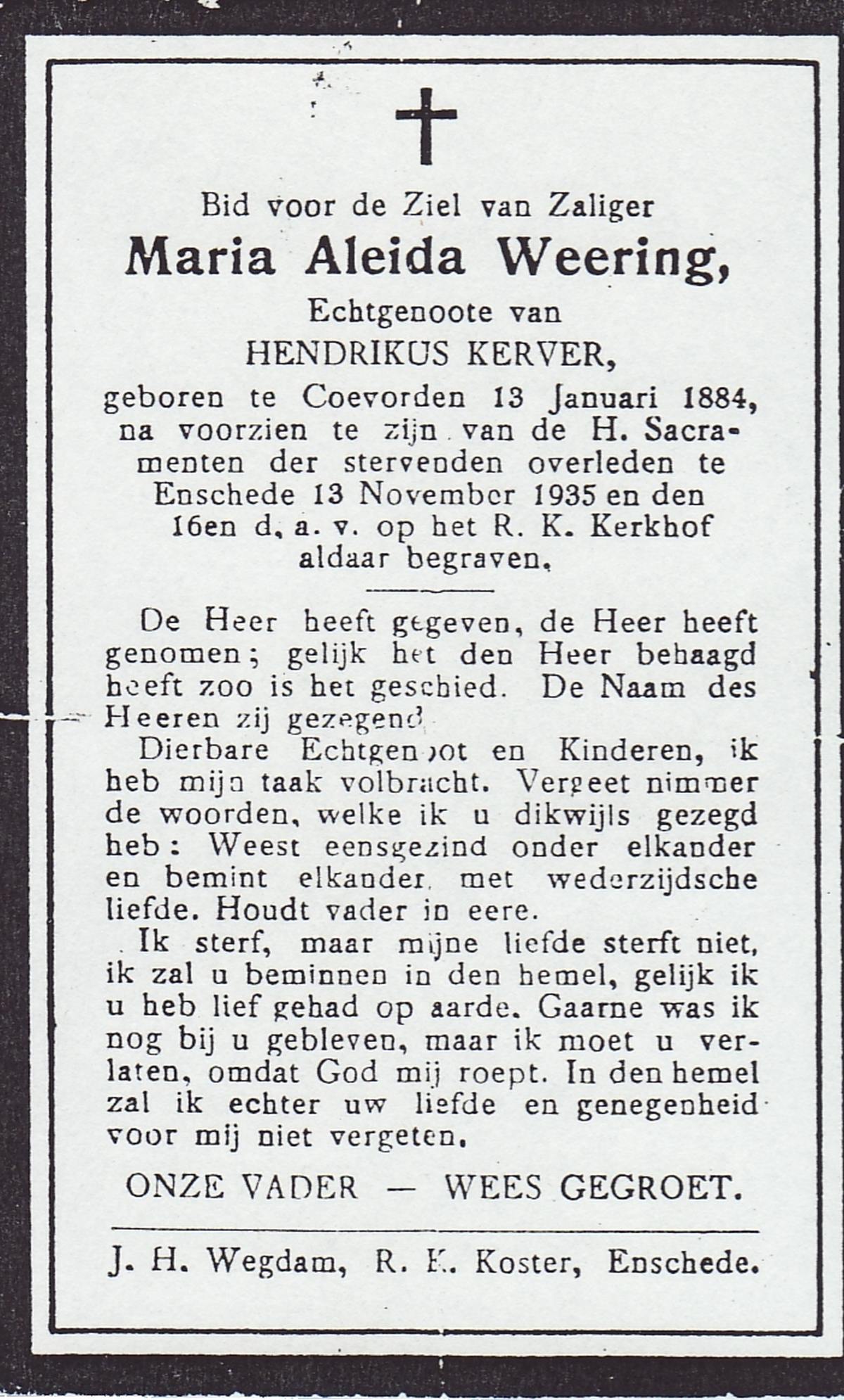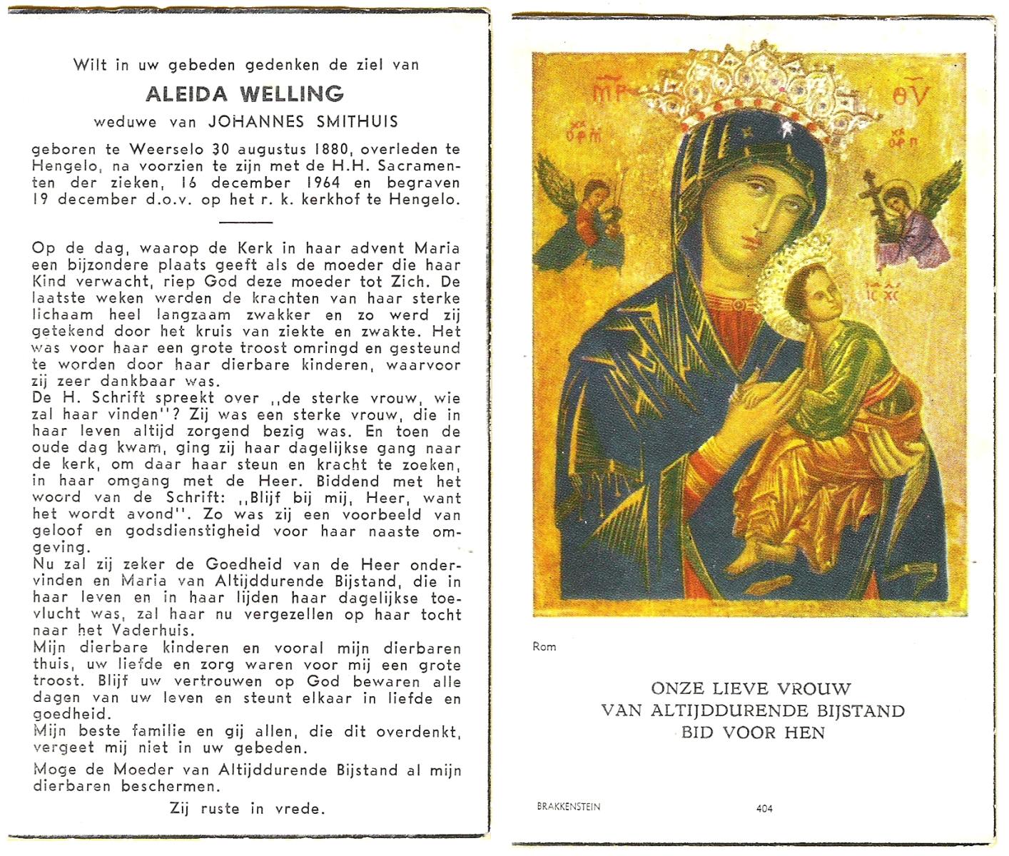 WELLING, Aleida, geboren op 30-08-1880 te Weerselo, overleden op 16-12-1964 te Hengelo (Ov.) op 84-jarige leeftijd, begraven op 19-12-1964 te Hengelo (Ov.).