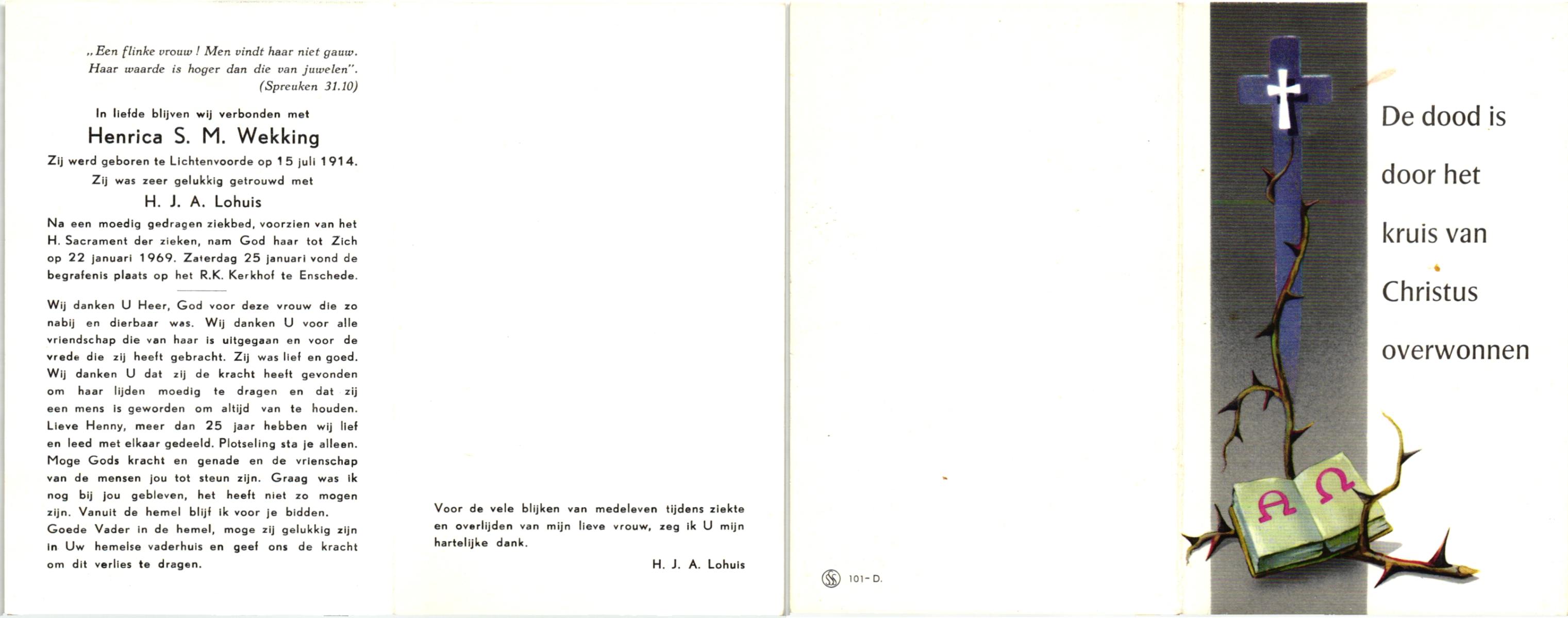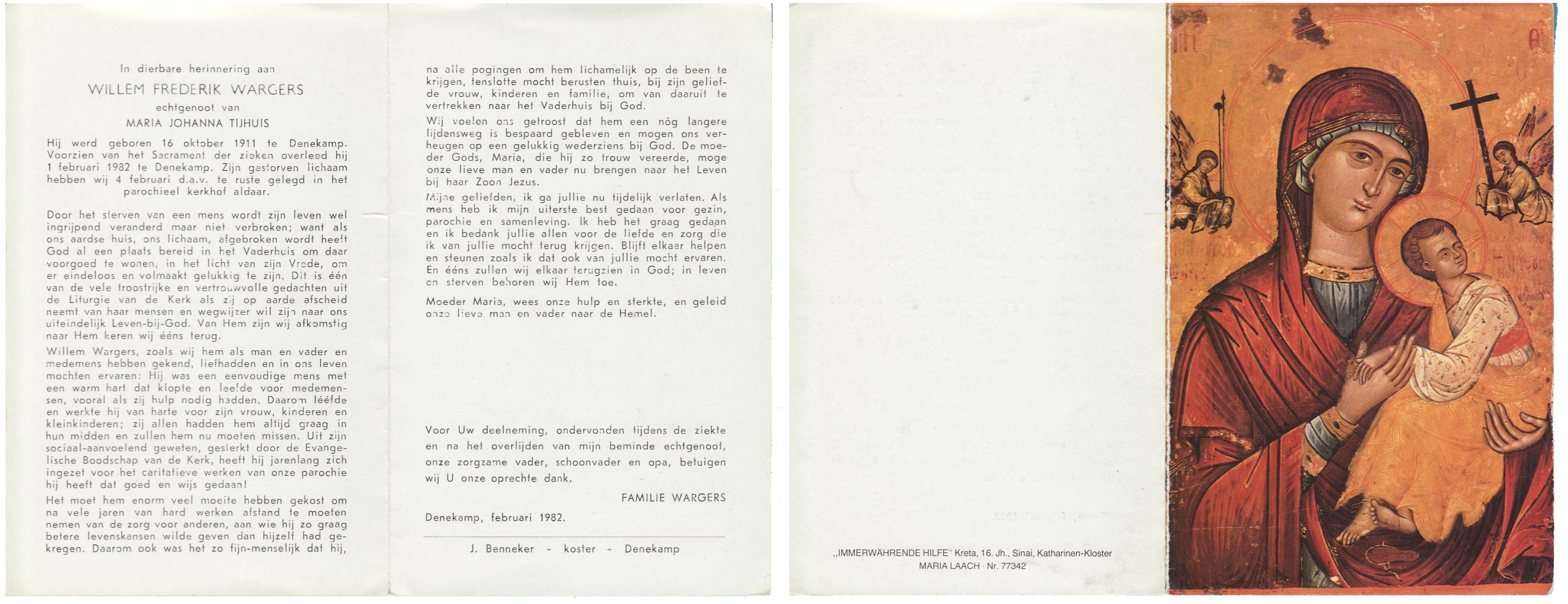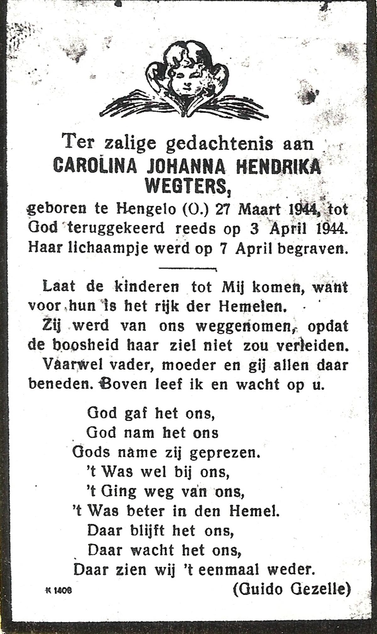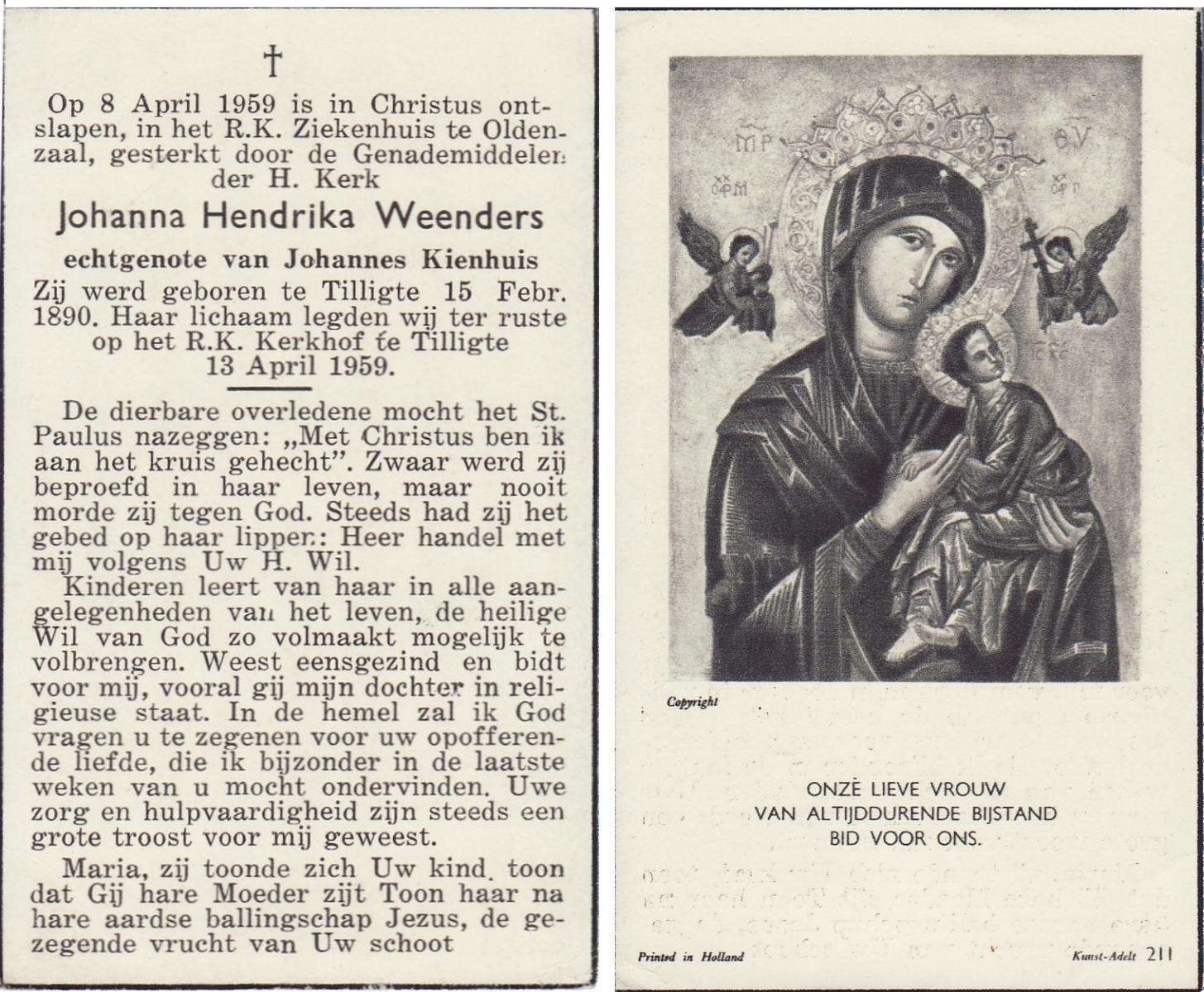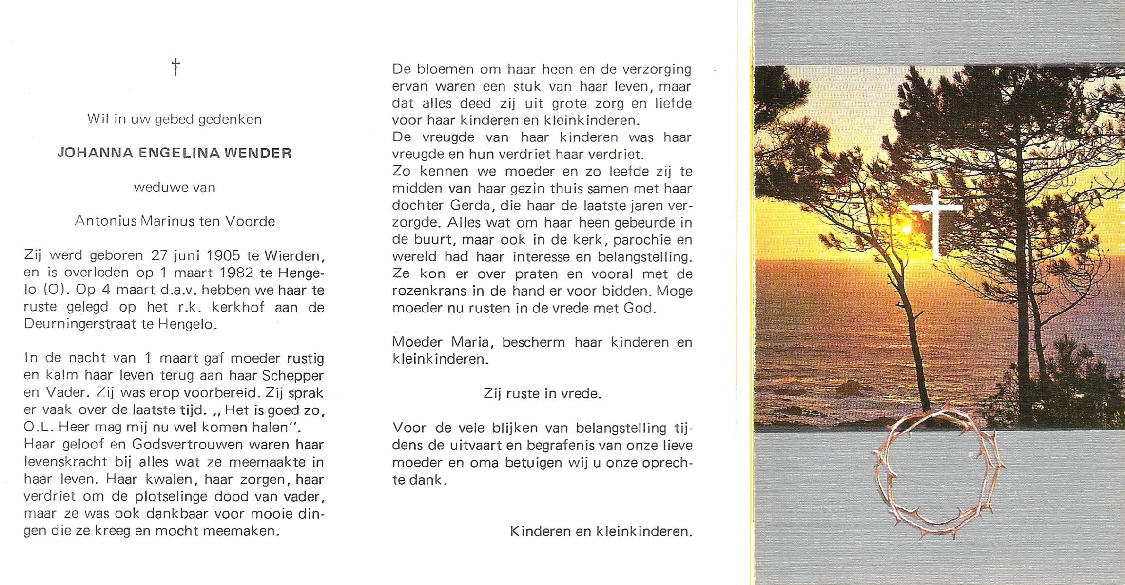 WENDER, Johanna Engelina, geboren op 27-6-1905 te Wierden, overleden op 1-3-1982 te Hengelo (Ov.) op 76-jarige leeftijd, begraven op 4-3-1982 te Hengelo (Ov.).