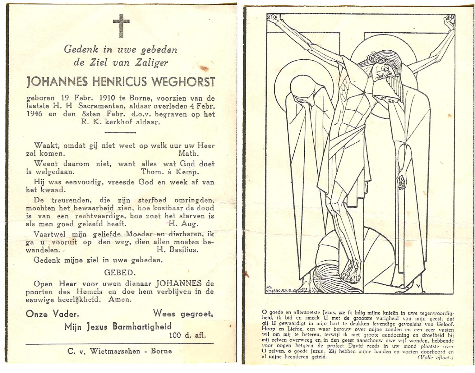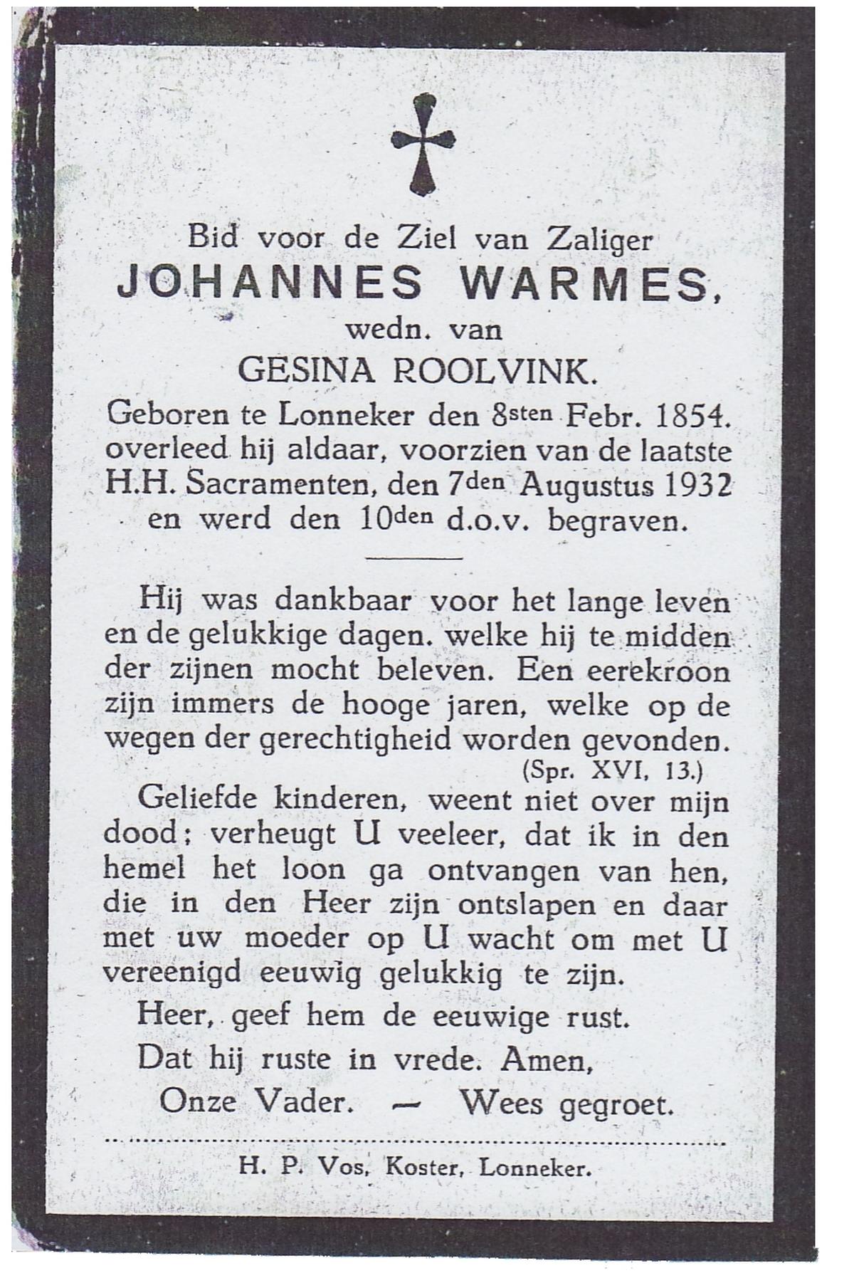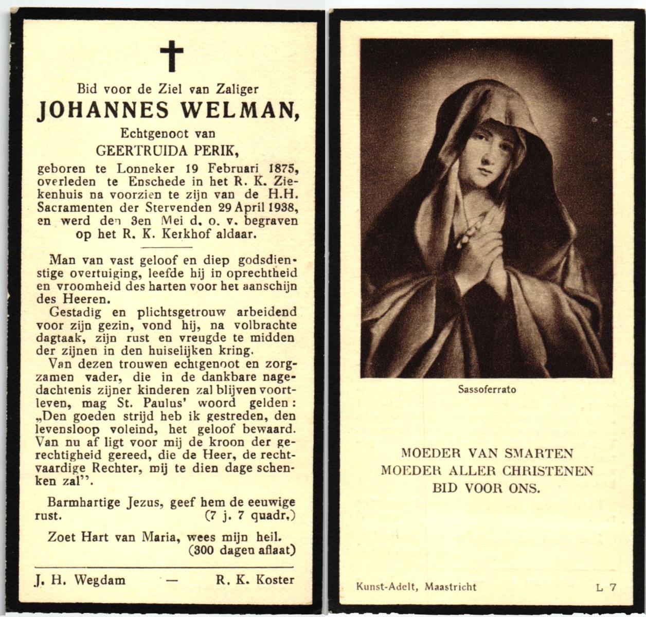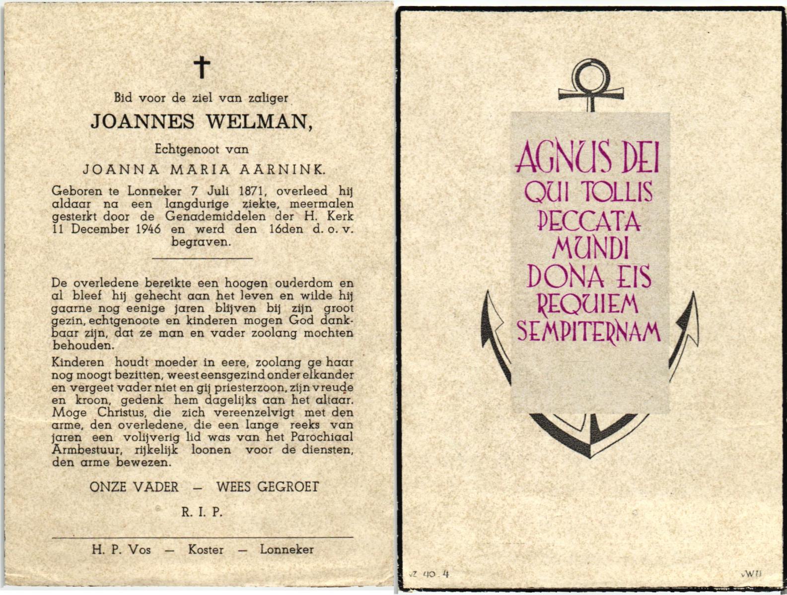 WELMAN, Joannes, geboren op 07-07-1871 te Lonneker, overleden op 11-12-1946 te Lonneker op 75-jarige leeftijd, begraven op 16-12-1946 te Lonneker.