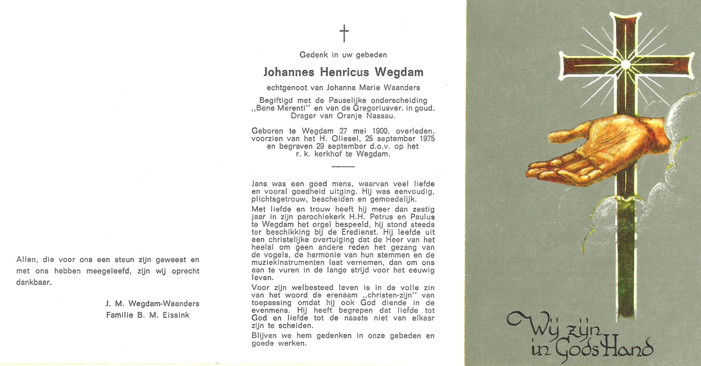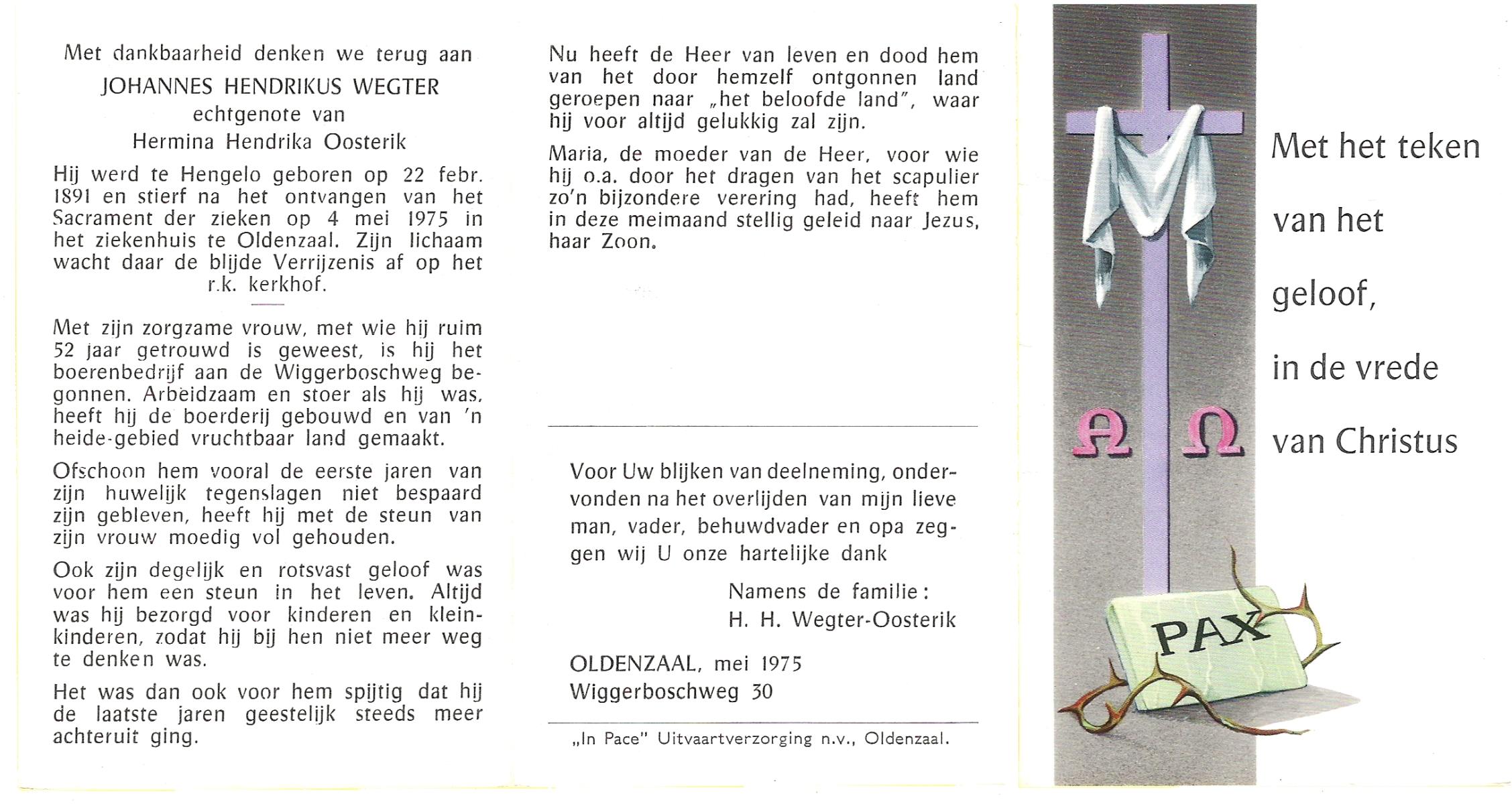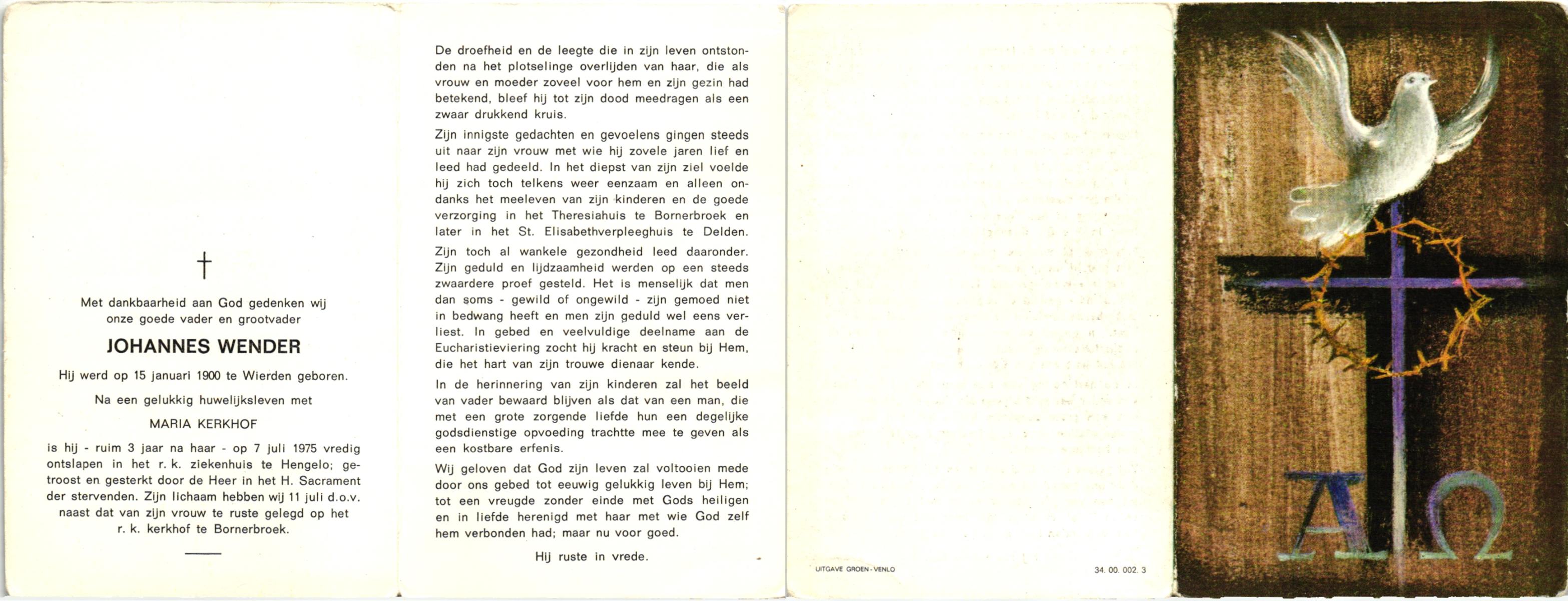 WENDER, , Johannes, geboren op 15-1-1900 te Wierden, overleden op 7-7-1975 te Hengelo (O) op 75-jarige leeftijd, begraven op 11-7-1975 te Bornerbroek.