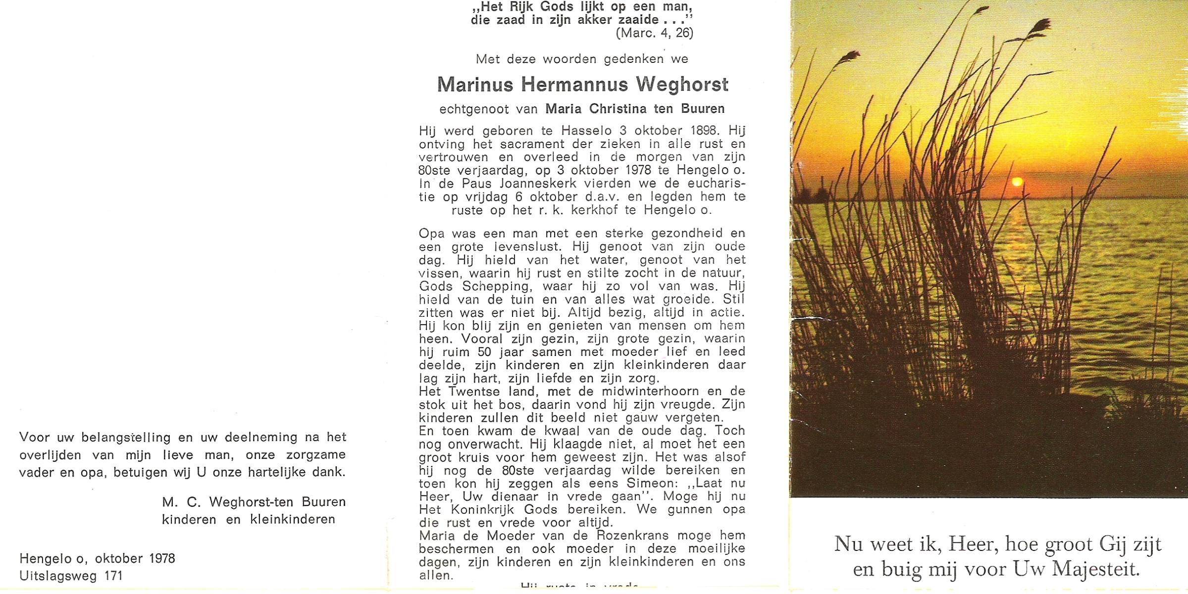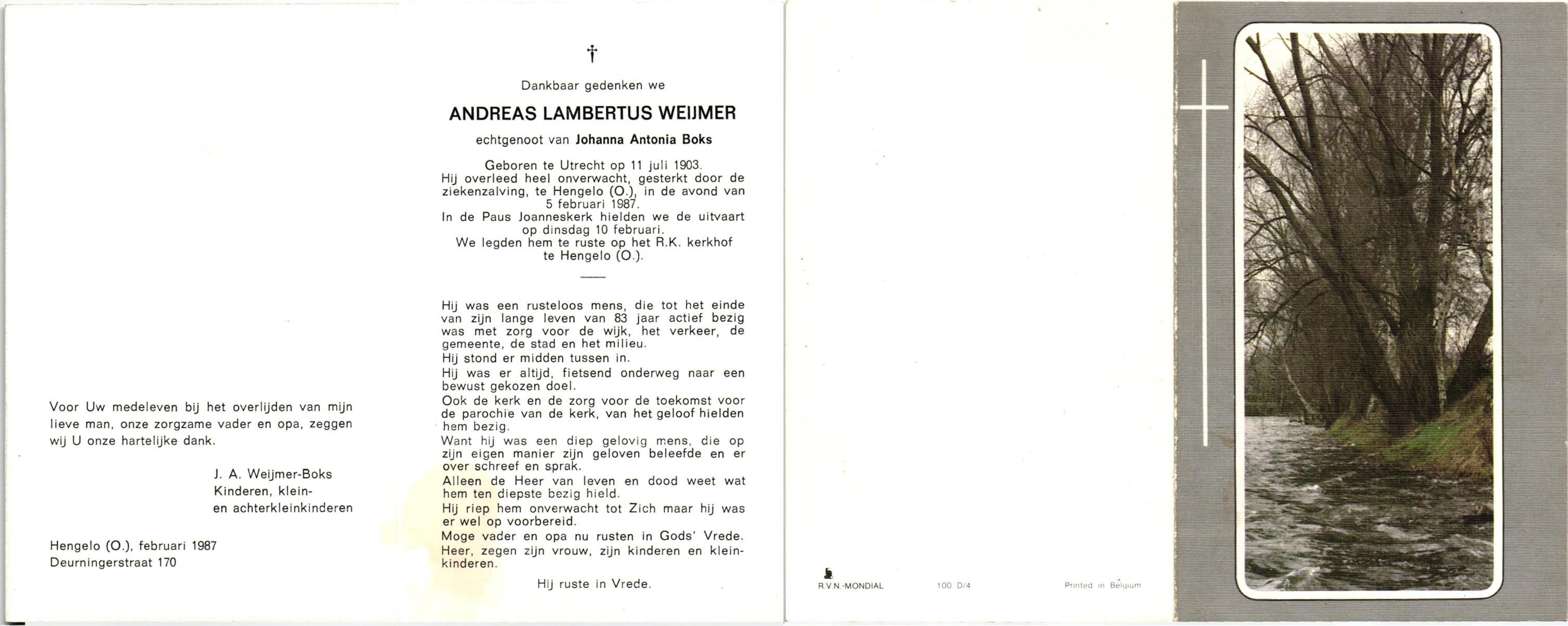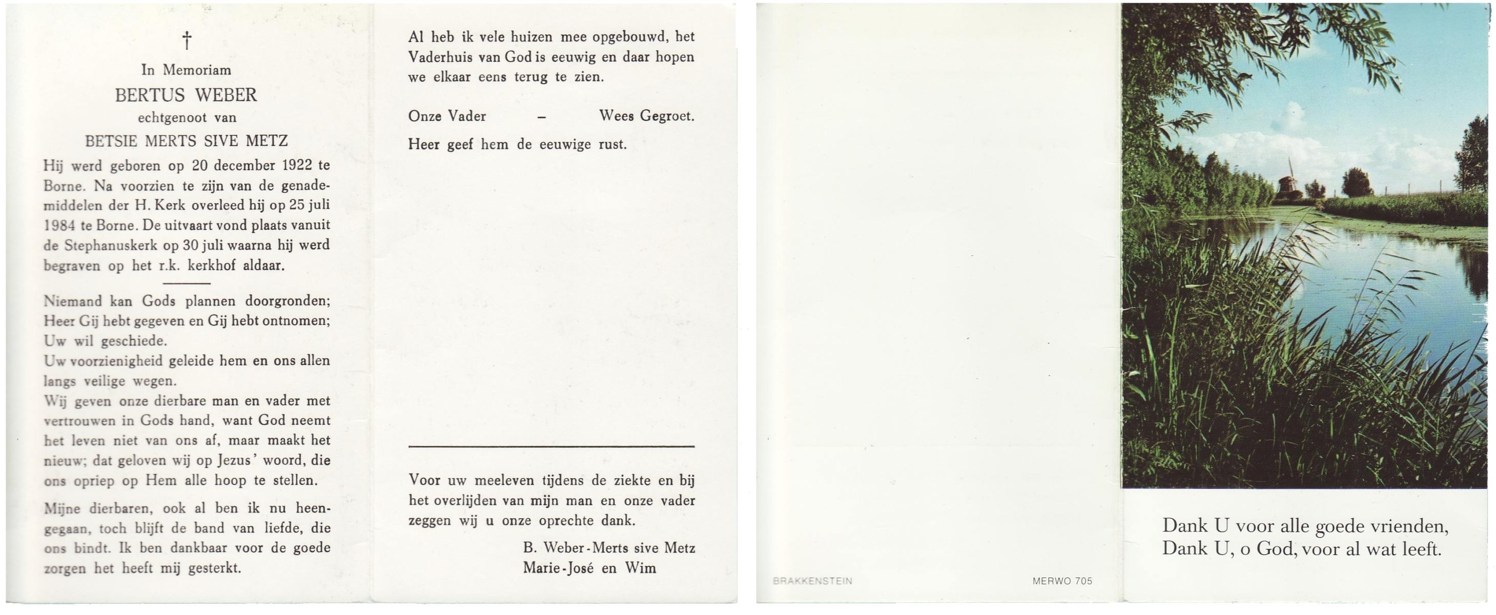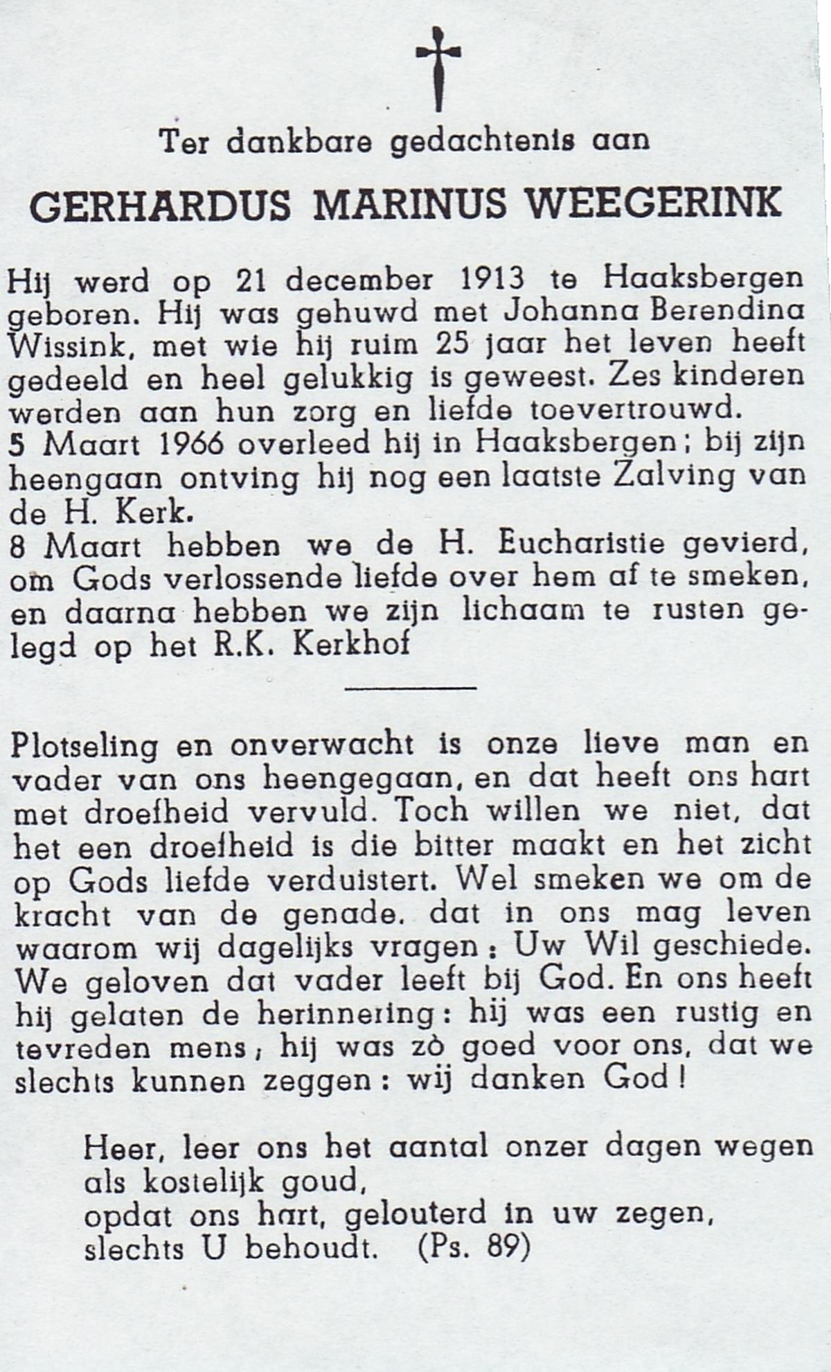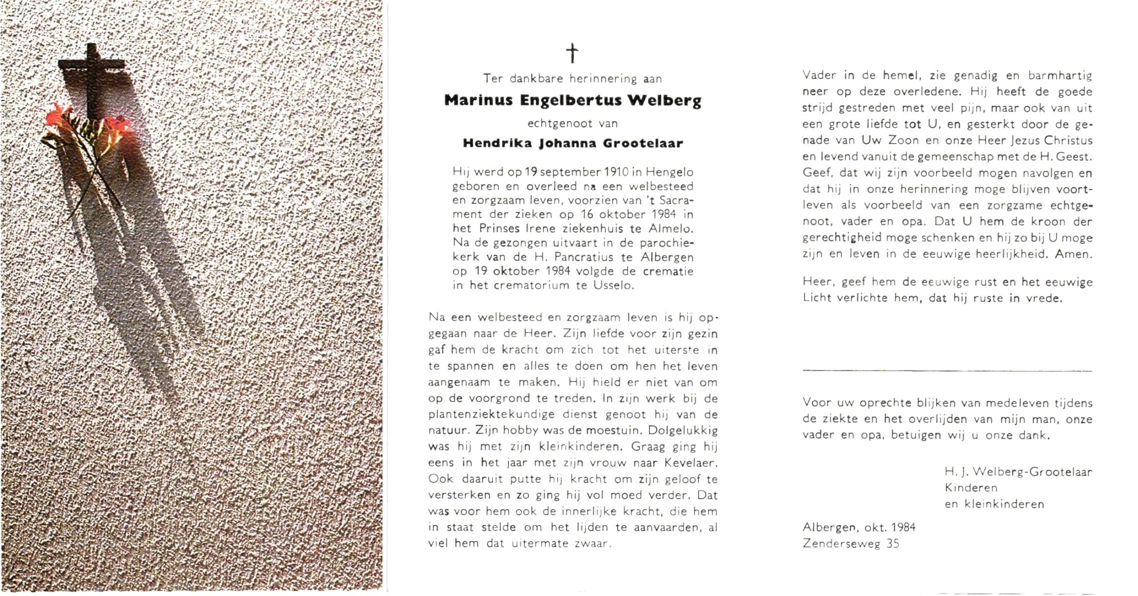 WELBERG, Marinus Engelbertus, geboren op 19-9-1910 te Hengelo (O), overleden op 16-10-1984 te Almelo op 74-jarige leeftijd, gecremeerd op 19-10-1984 te Usselo.