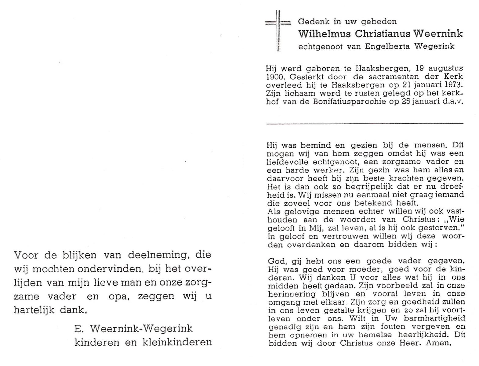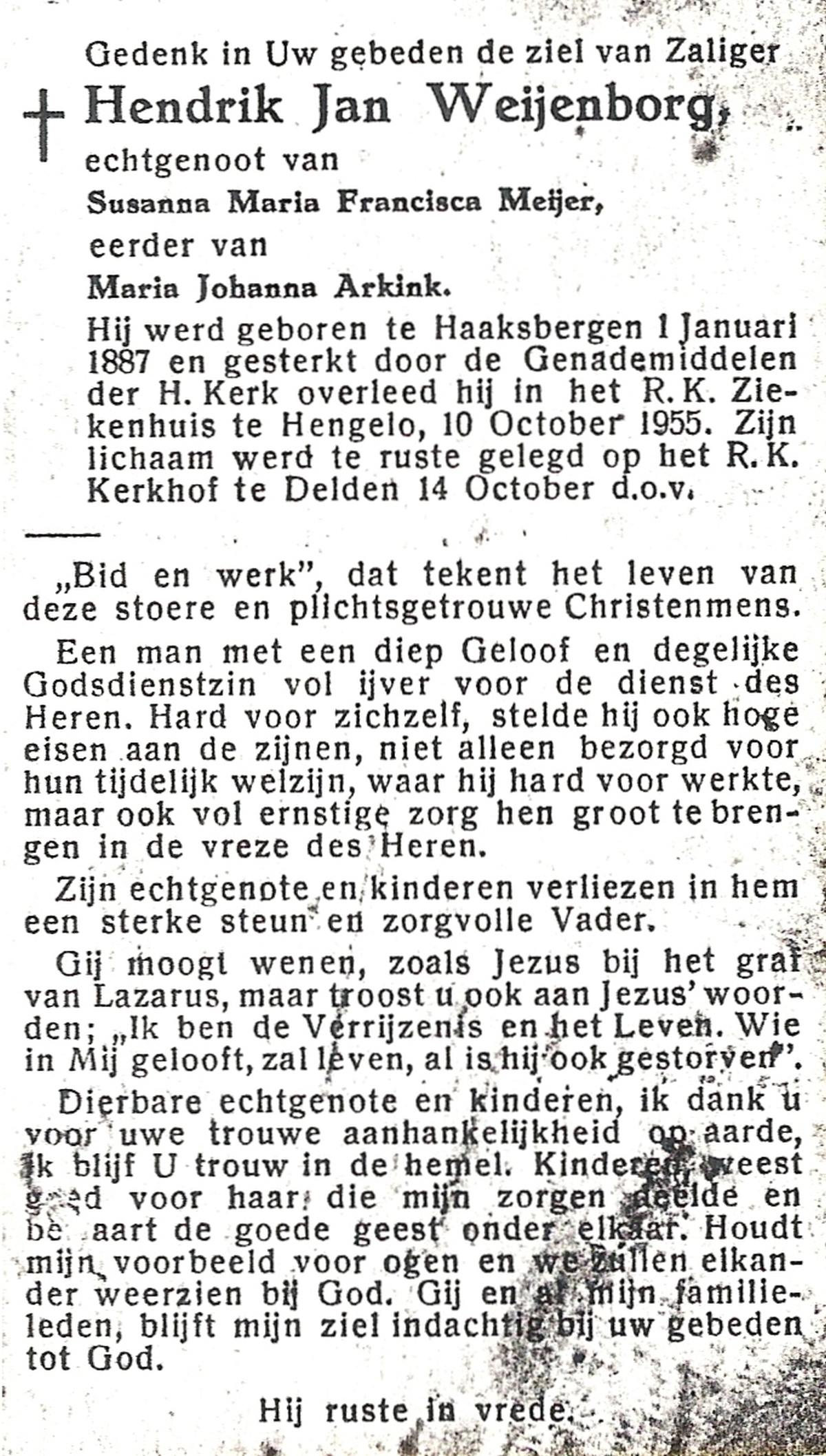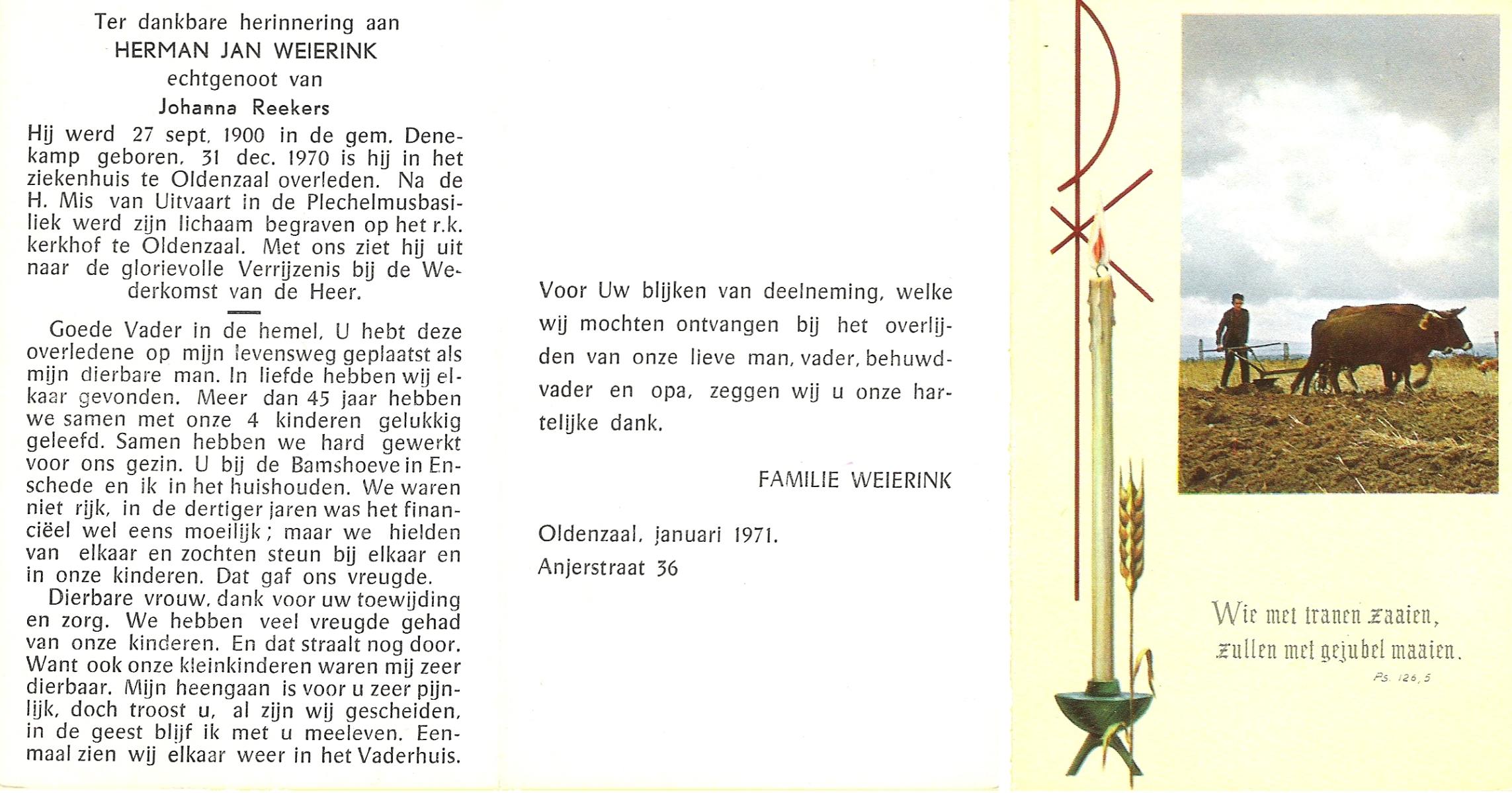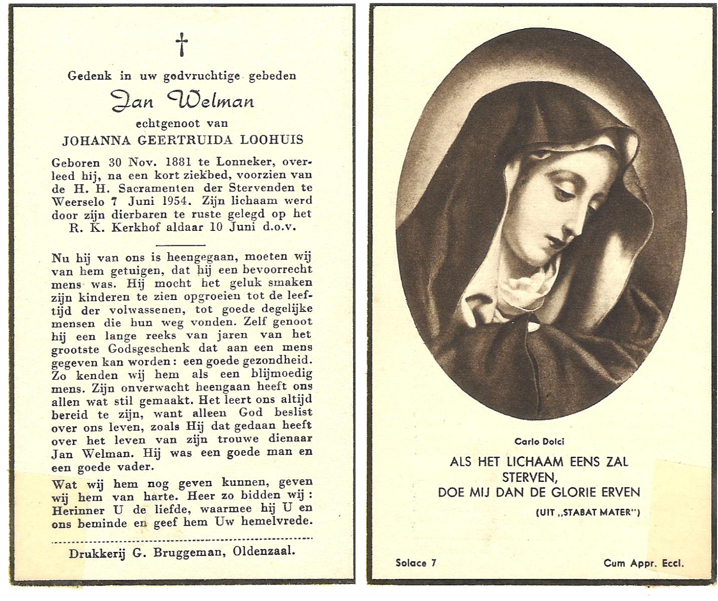 WELMAN, Jan, geboren op 30-11-1881 te Lonneker, overleden op 7-6-1954 te Weerselo op 72-jarige leeftijd, begraven op 10-6-1954 te Weerselo.