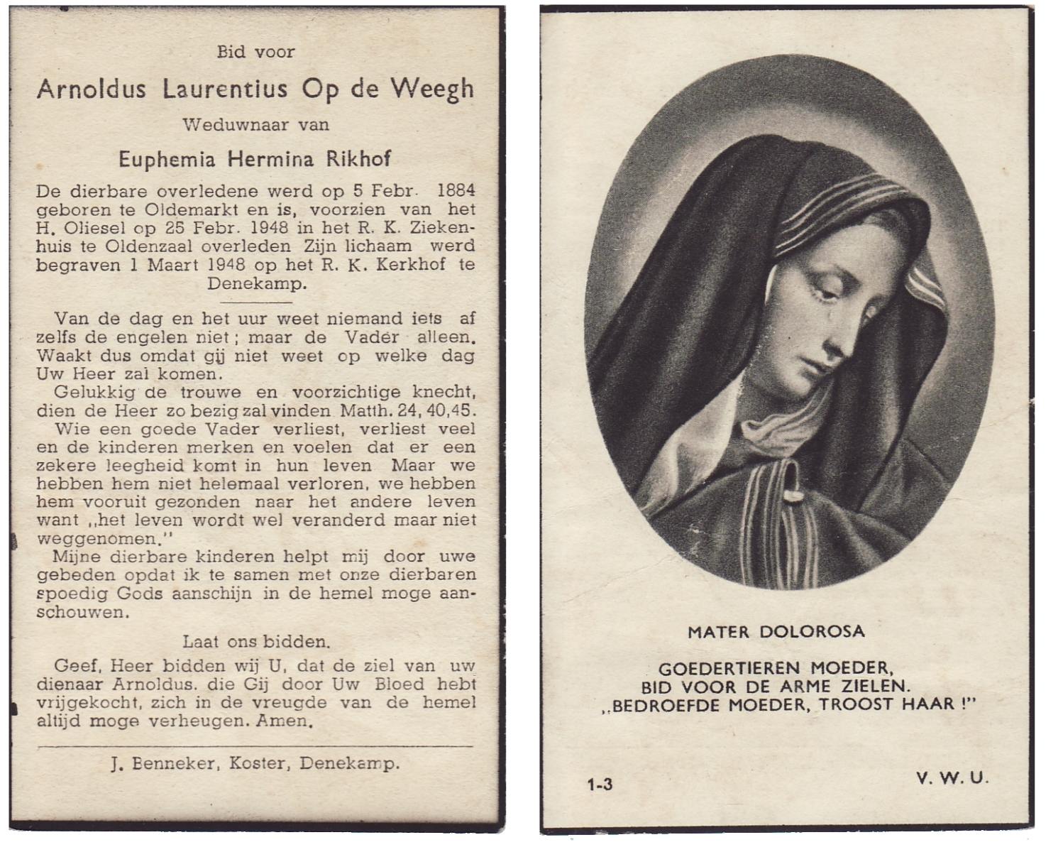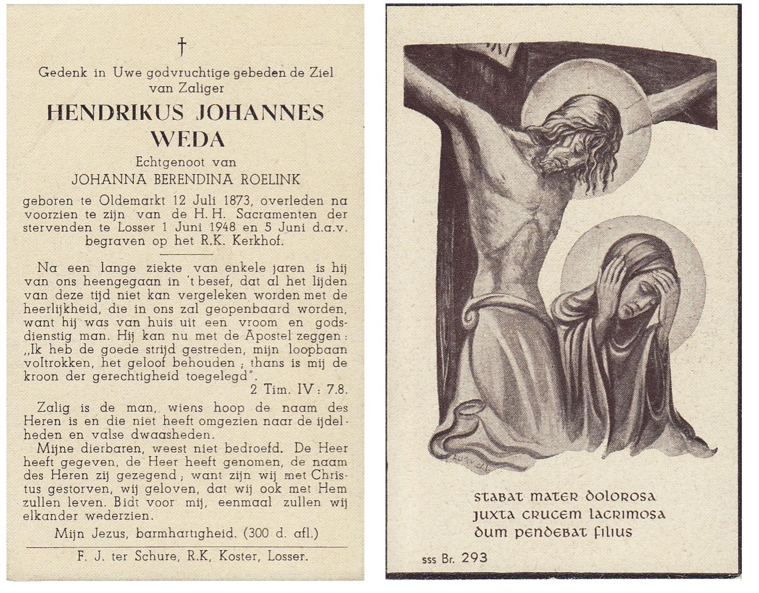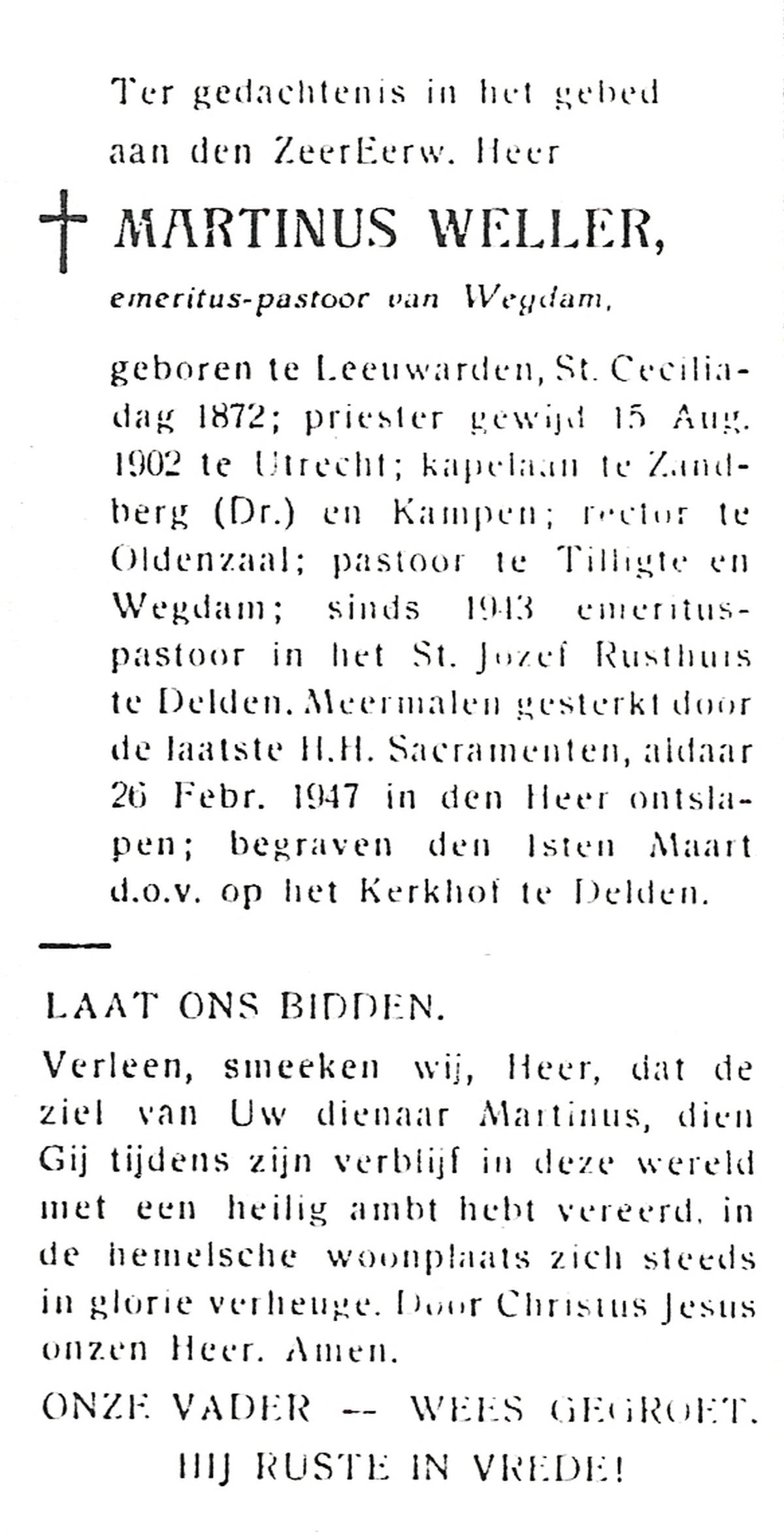 WELLER, Martinus, geboren op 1872 te Leeuwarden, overleden op 26-2-1947 te Delden op 74-jarige leeftijd, begraven op 1-3-1947 te Delden.