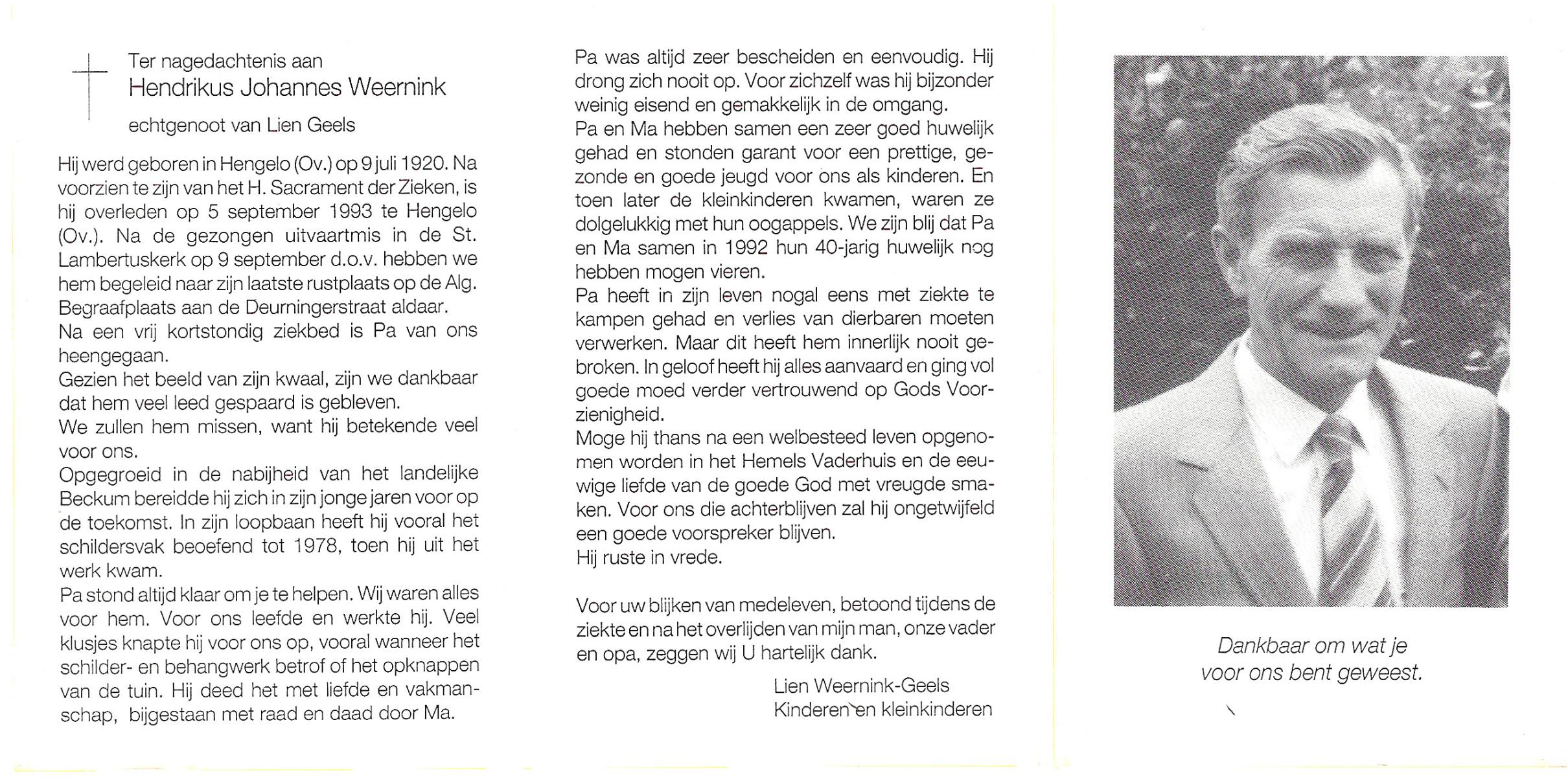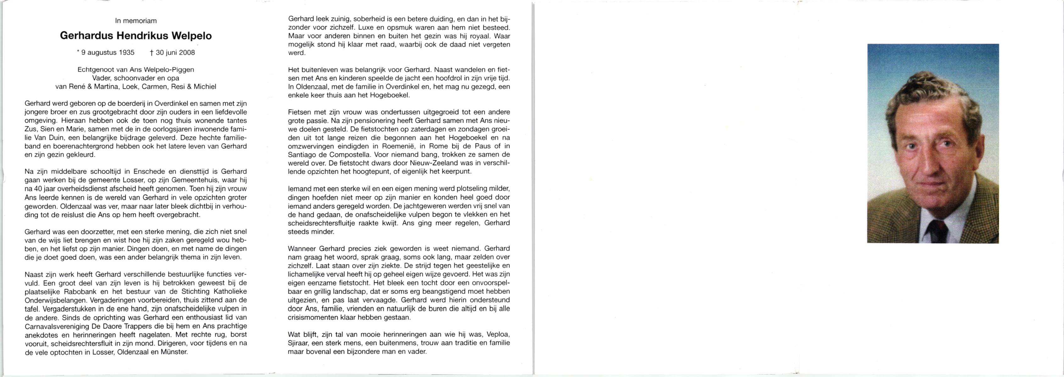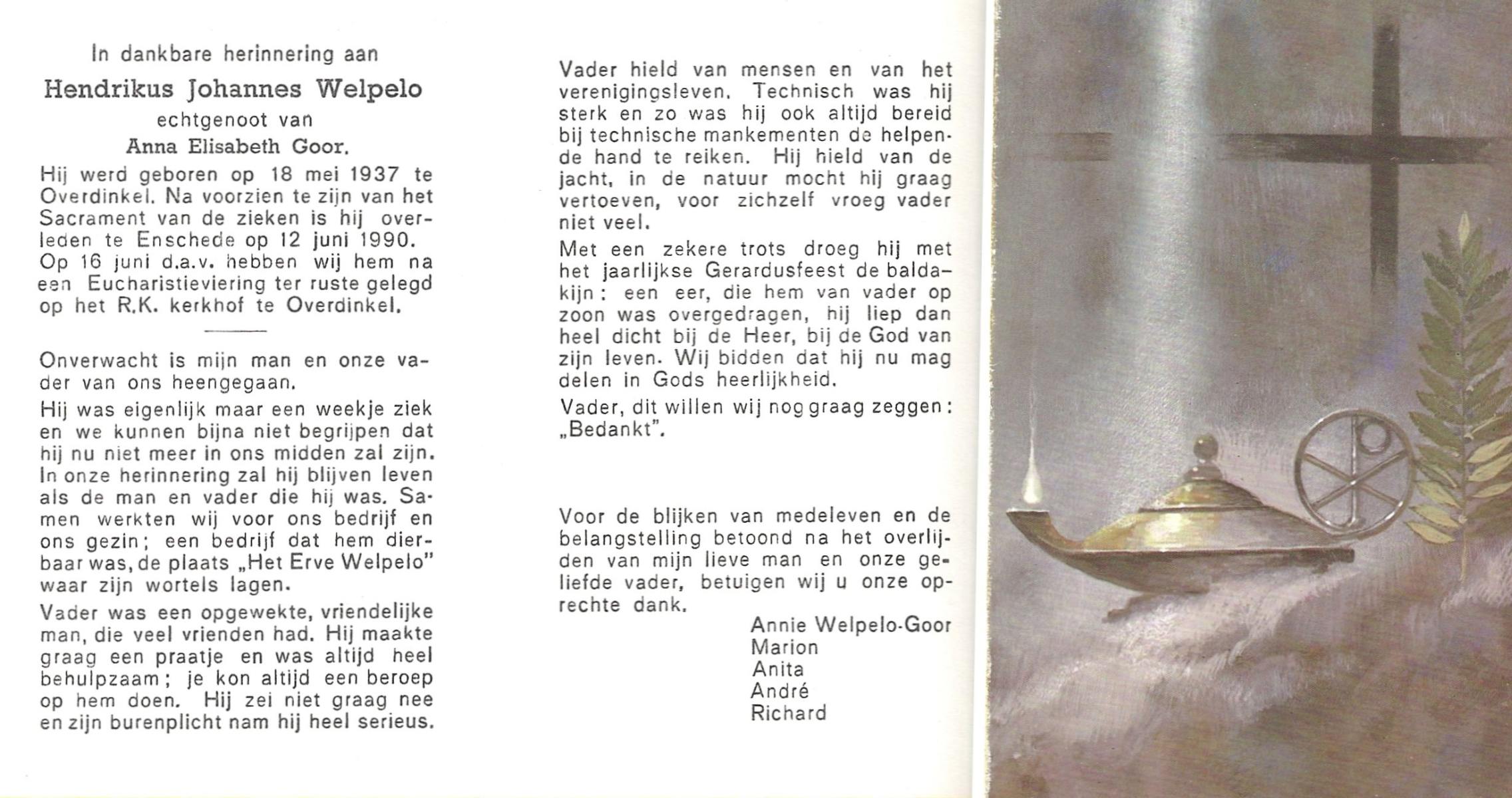 WELPELO, Hendrikus Johannes, geboren op 18-5-1937 te Overdinkel, overleden op 12-6-1990 te Enschede op 53-jarige leeftijd, begraven op 16-6-1990 te Overdinkel.