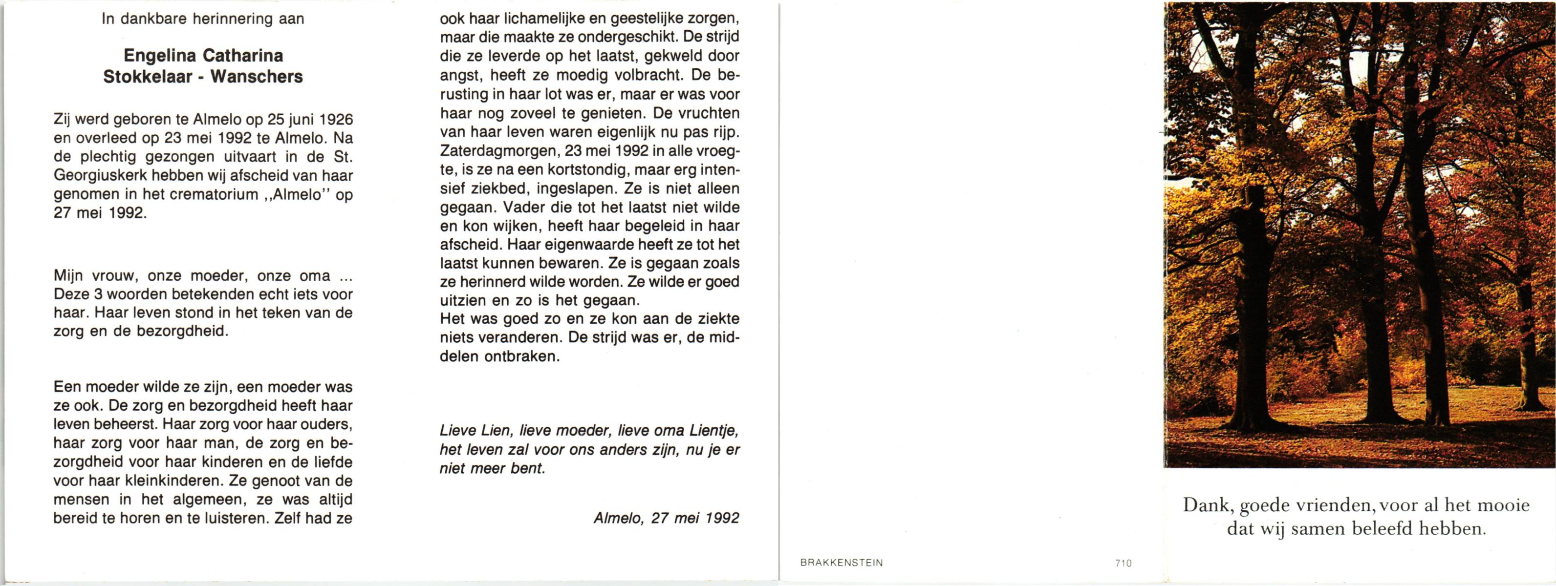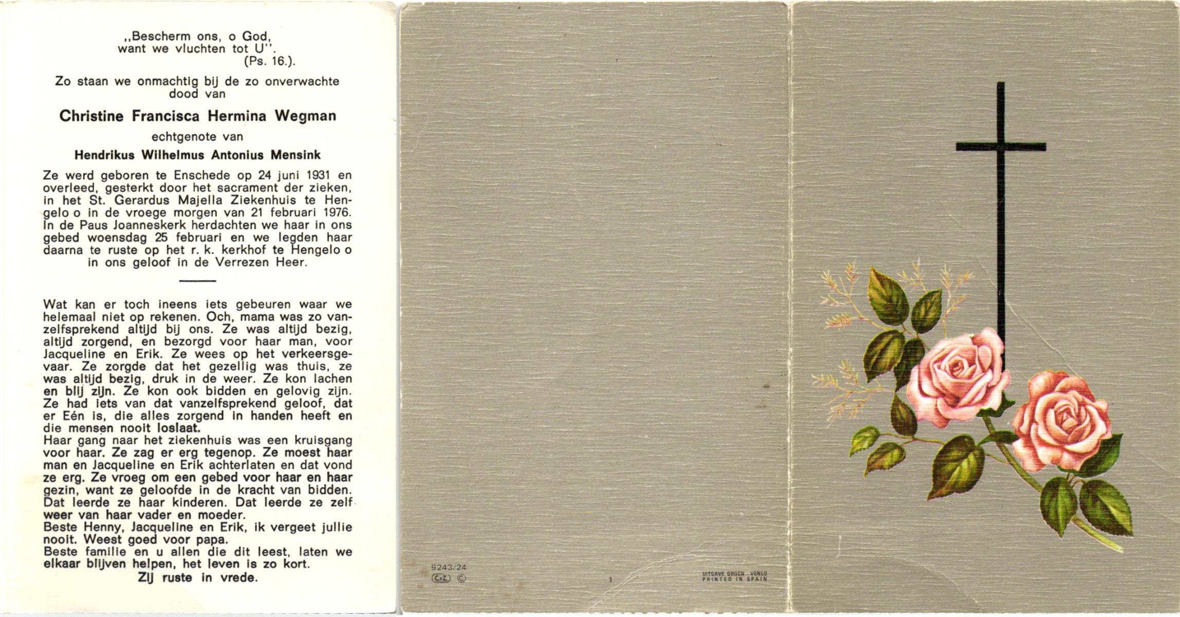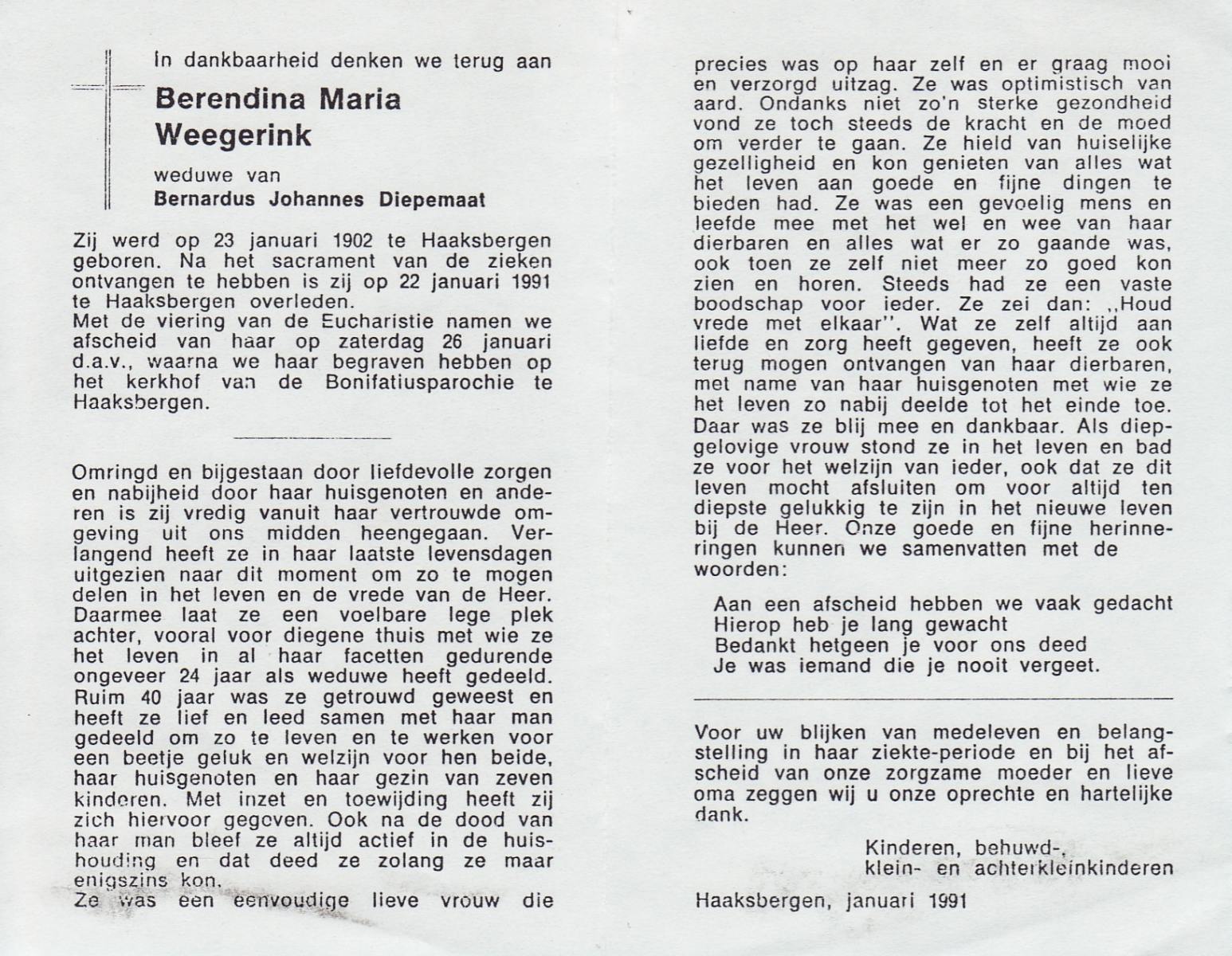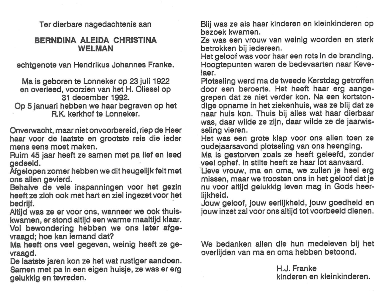 WELMAN, Berndina Aleida Christina, geboren op 23-7-1922 te Lonneker, overleden op 31-12-1992 op 70-jarige leeftijd, begraven op 5-1-1993 te Lonneker R.K.Kerkhof.