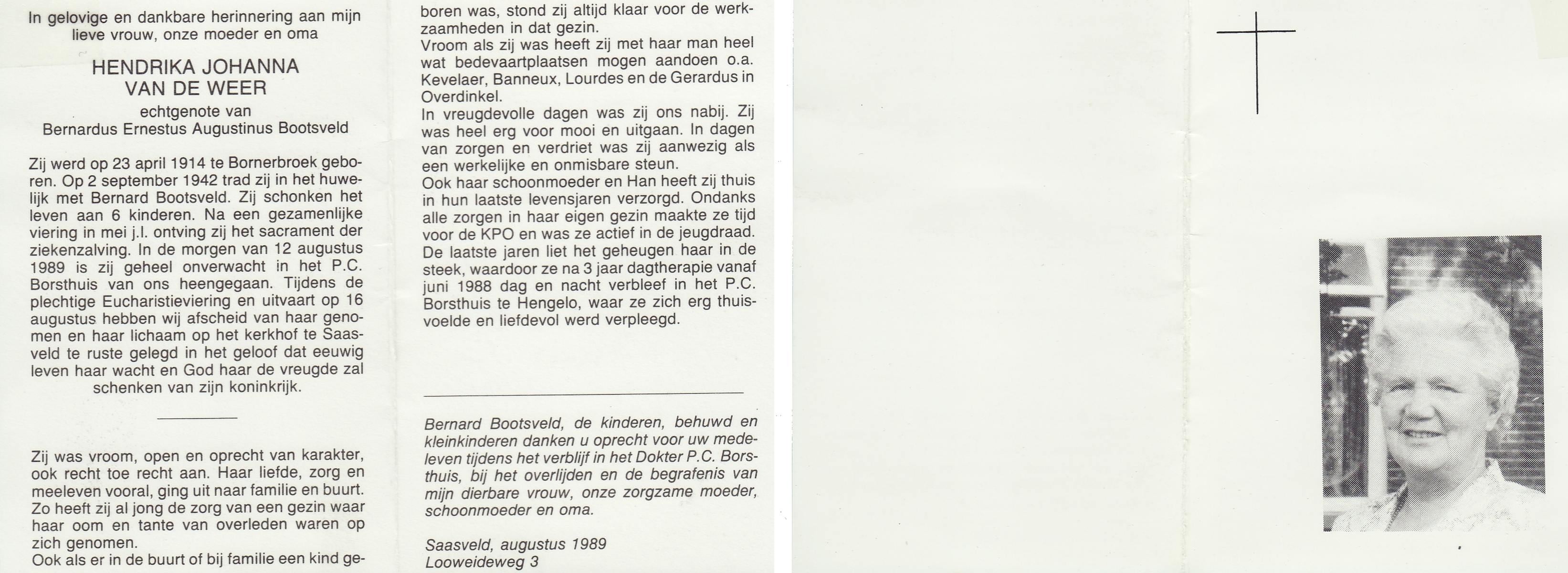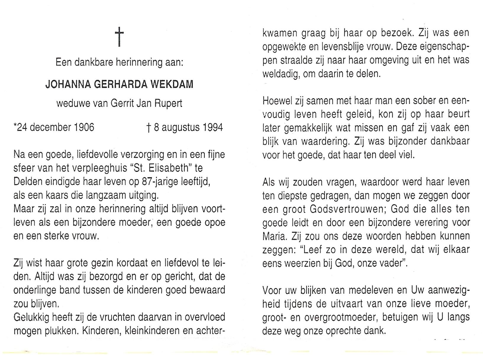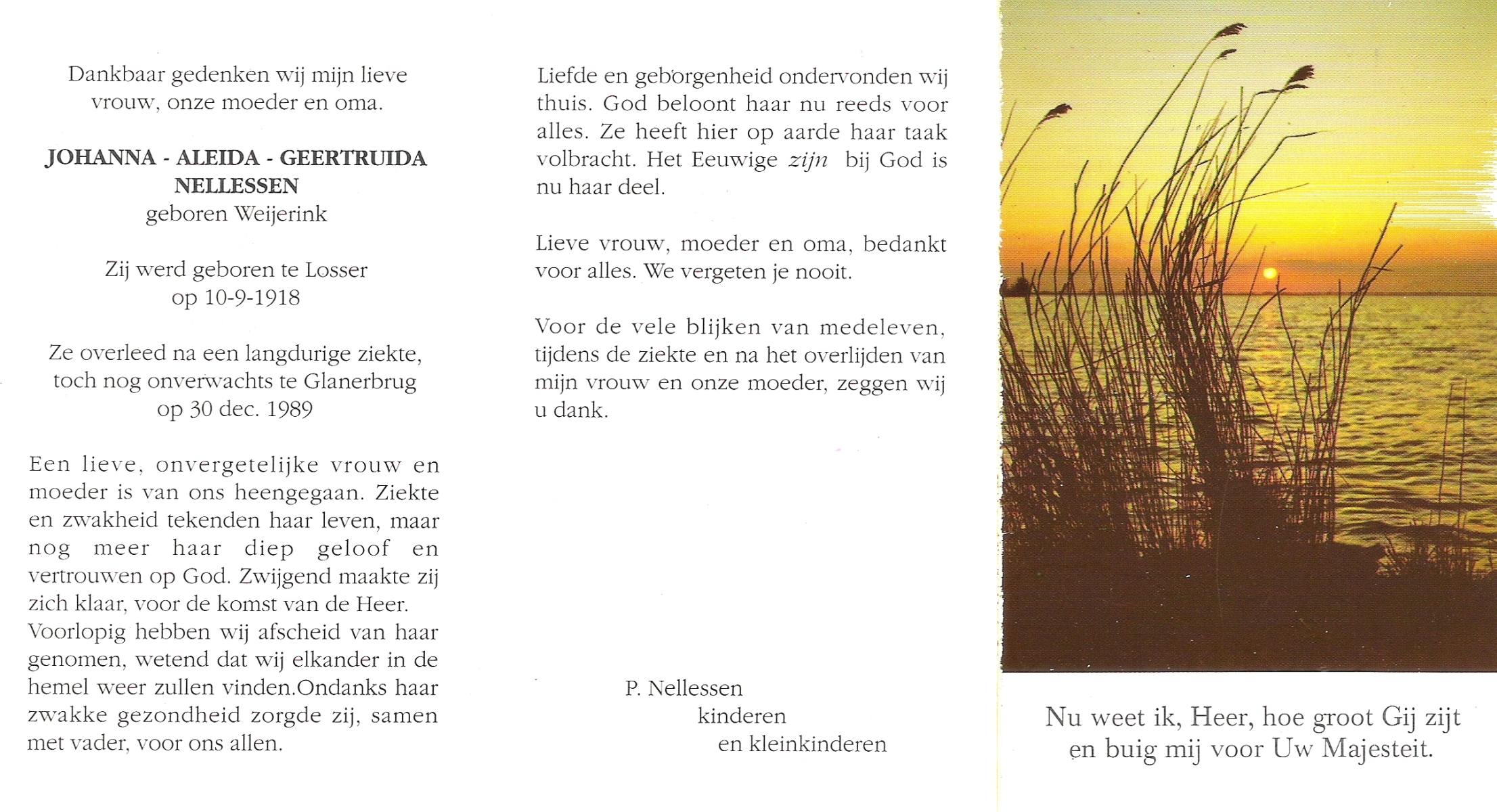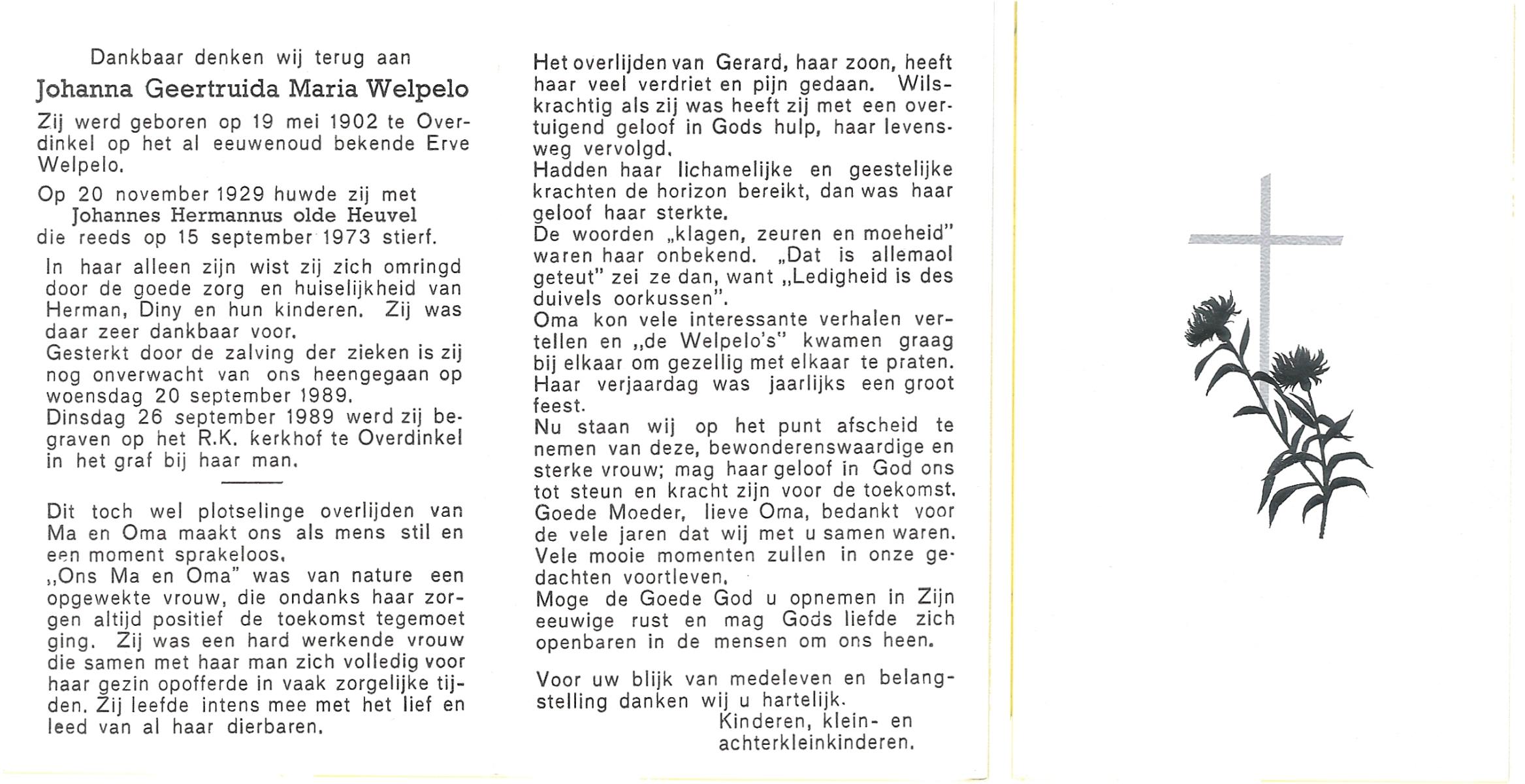 WELPELO, Johanna Geertruida Maria, geboren op 19-5-1902 te Overdinkel, overleden op 20-9-1989 op 87-jarige leeftijd, begraven op 26-9-1989 te Overdinkel.