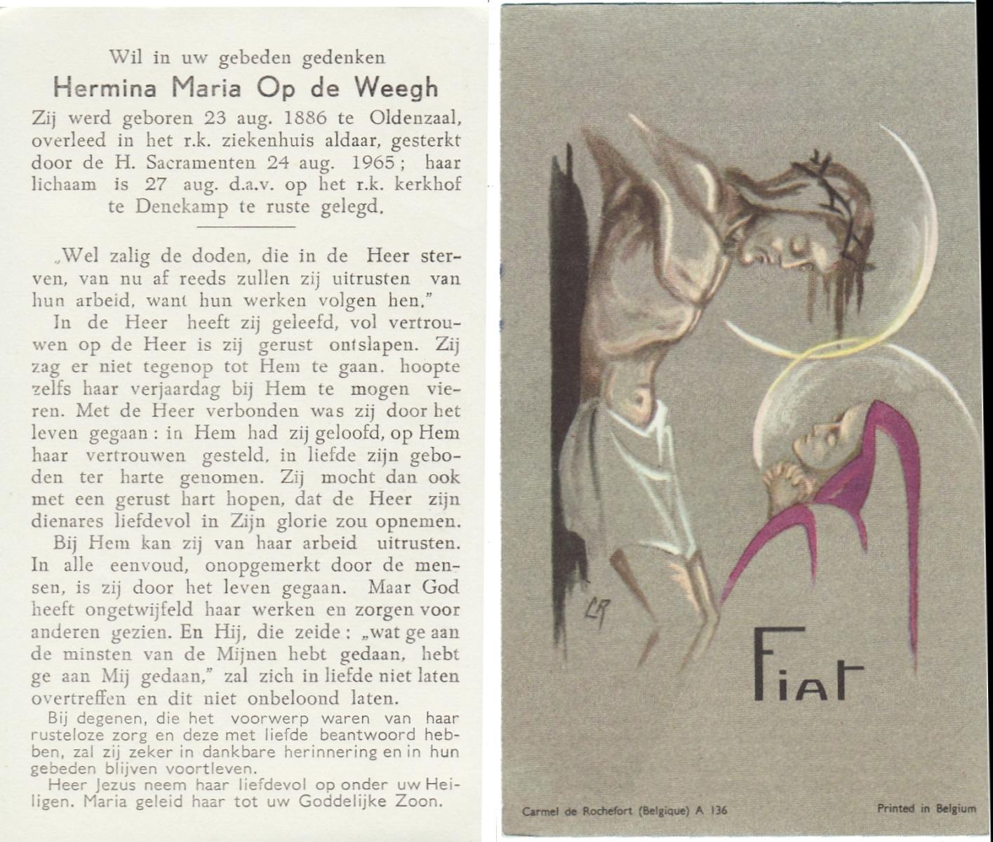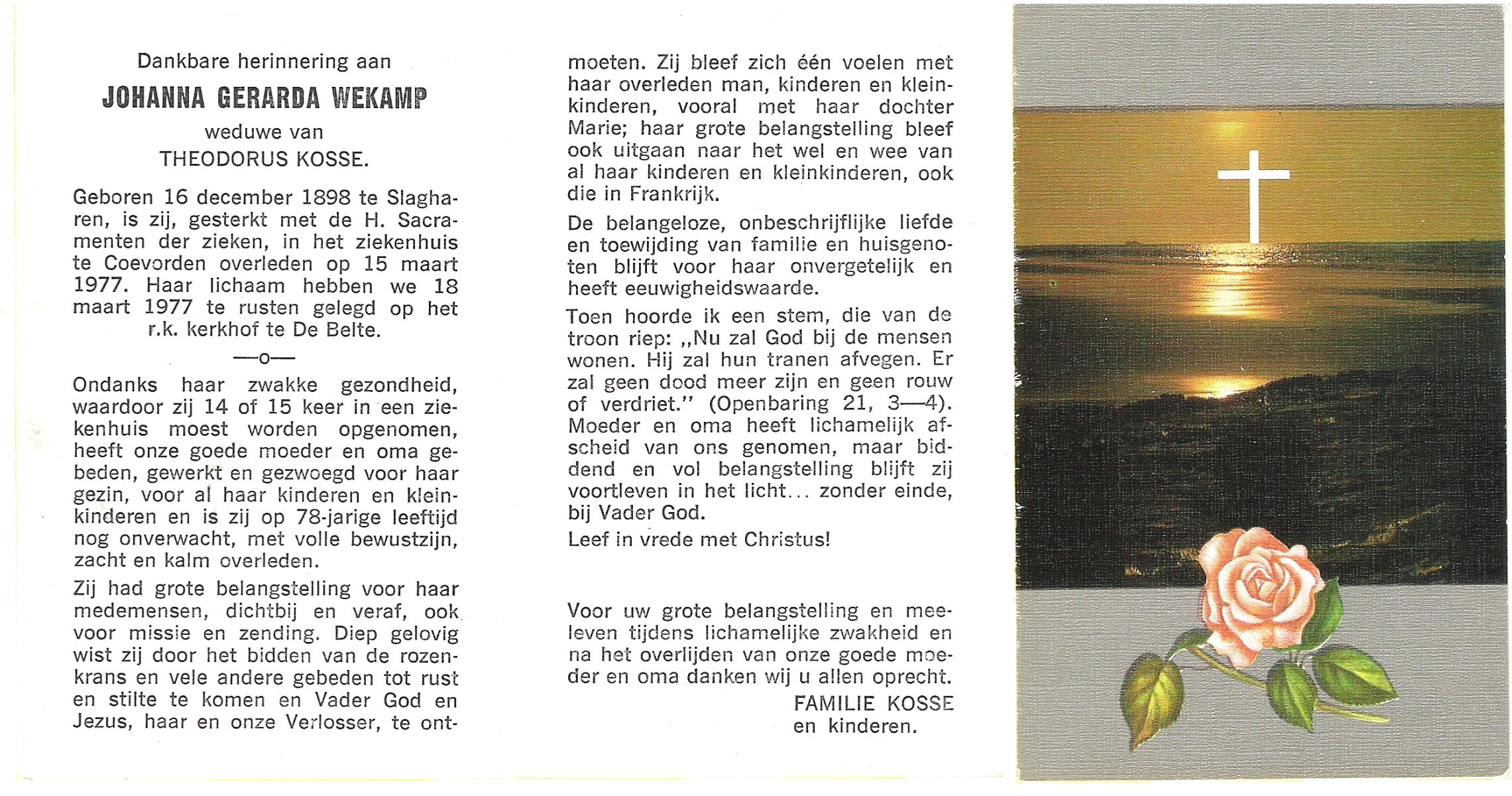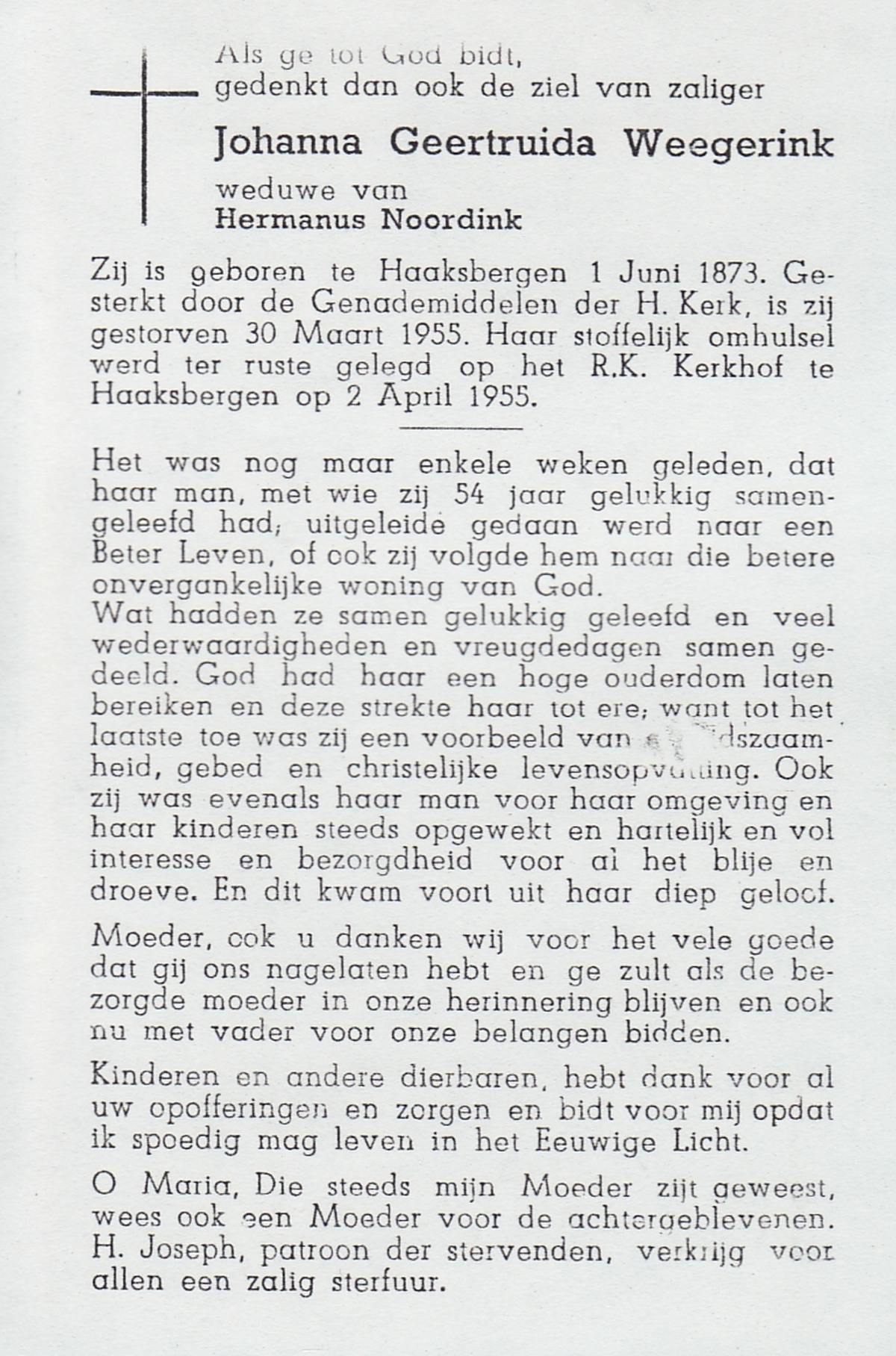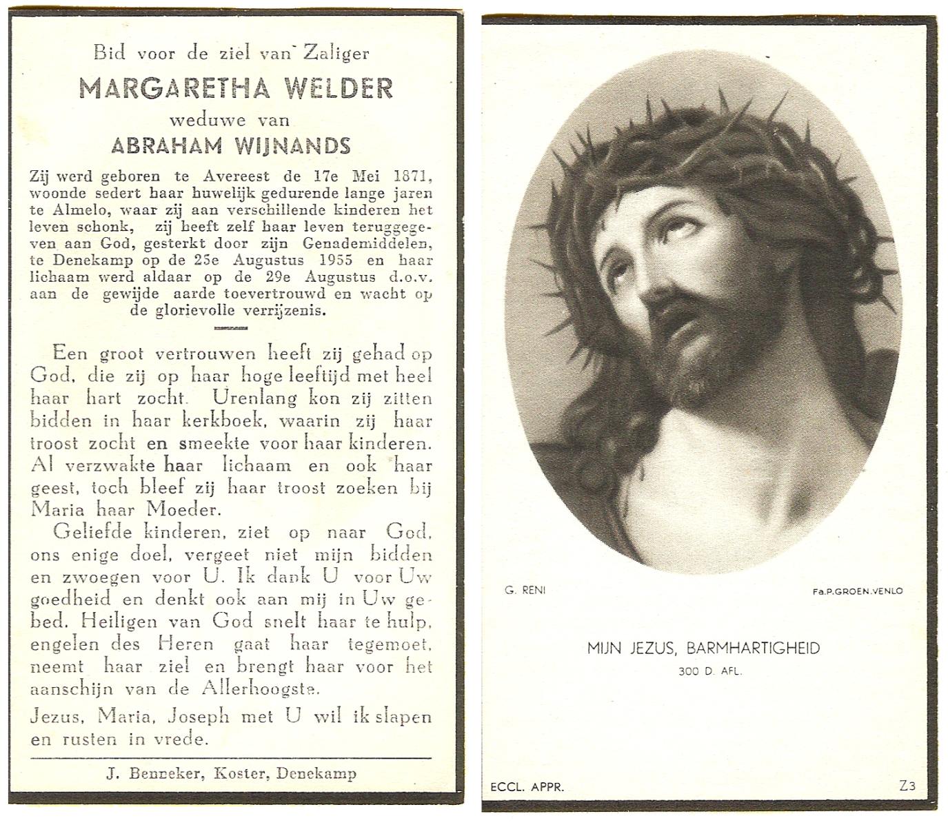 WELDER, Margaretha, geboren op 17-05-1871 te Avereest, overleden op 25-8-1955 te Denekamp op 84-jarige leeftijd, begraven op 29-8-1955 te Denekamp R.K.kerkhof.
