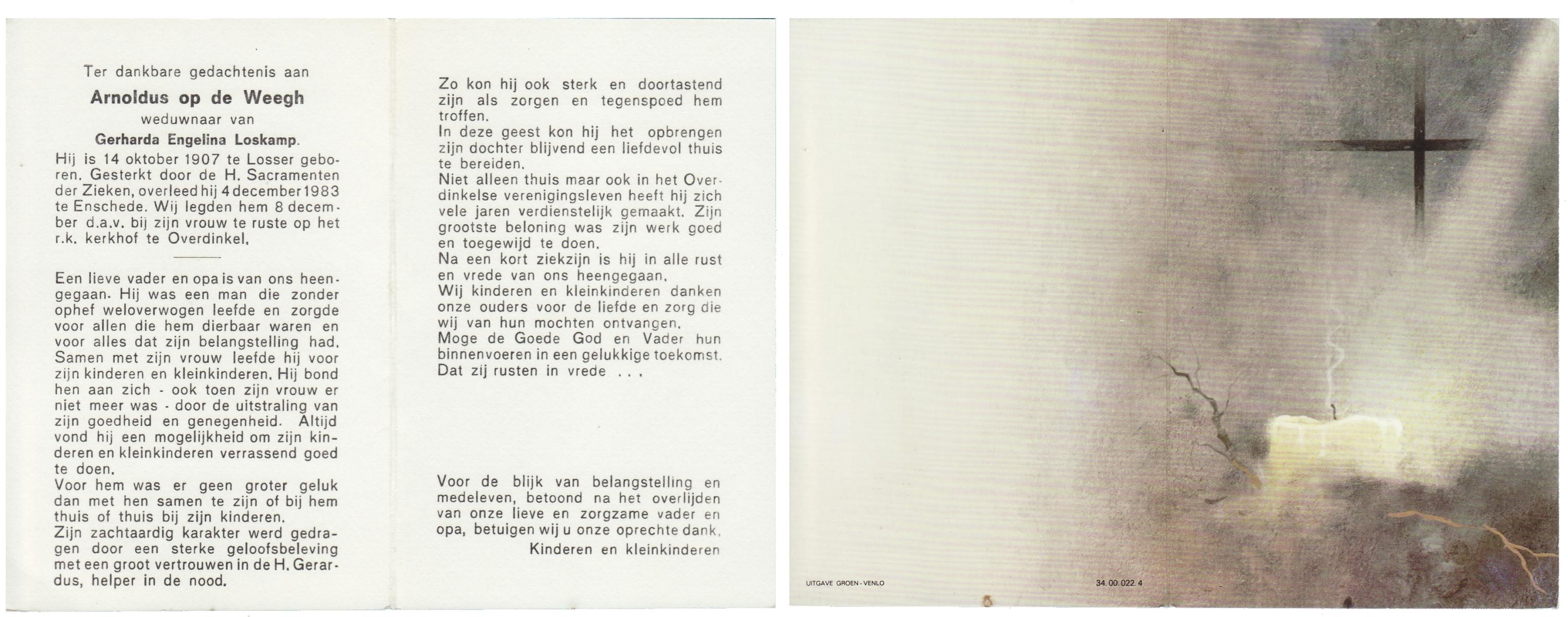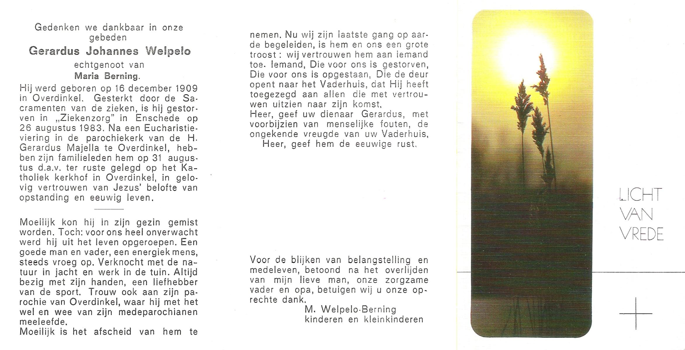 WELPELO, Gerardus Johannes, geboren op 16-12-1909 te Overdinkel, overleden op 26-8-1983 te Enschede op 73-jarige leeftijd, begraven op 31-8-1983 te Overdinkel.