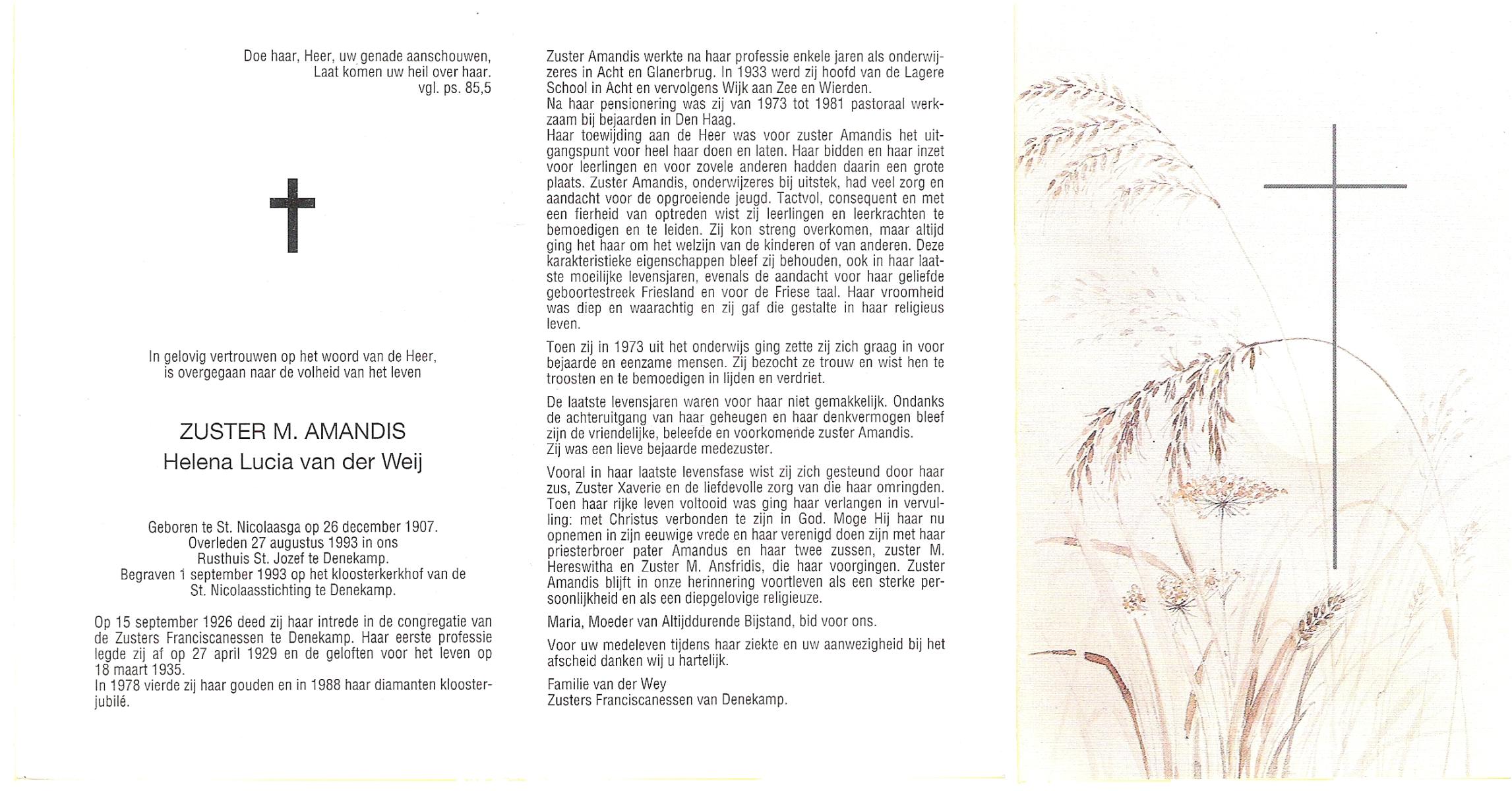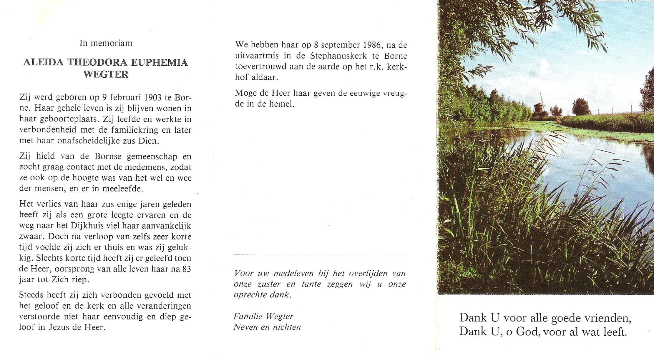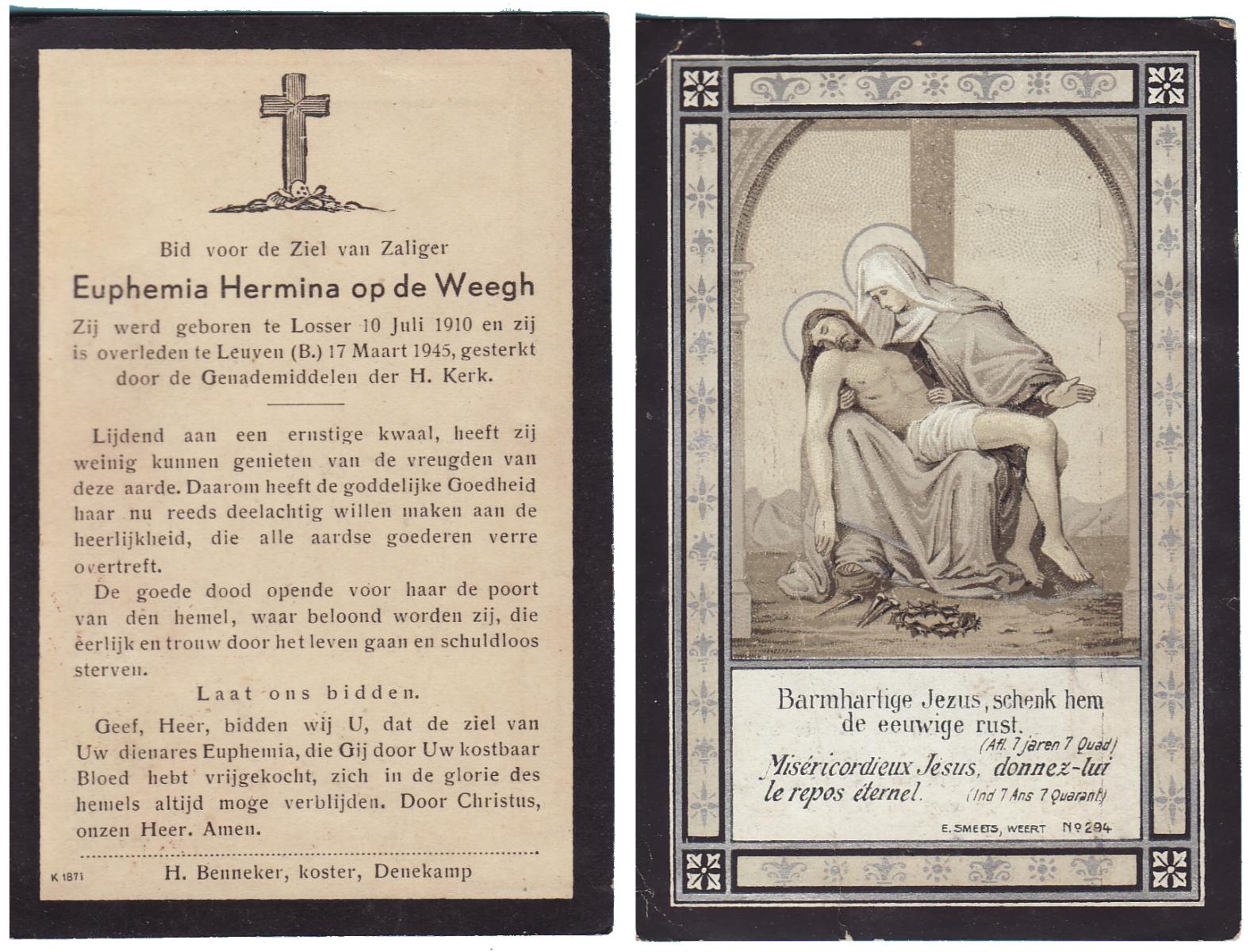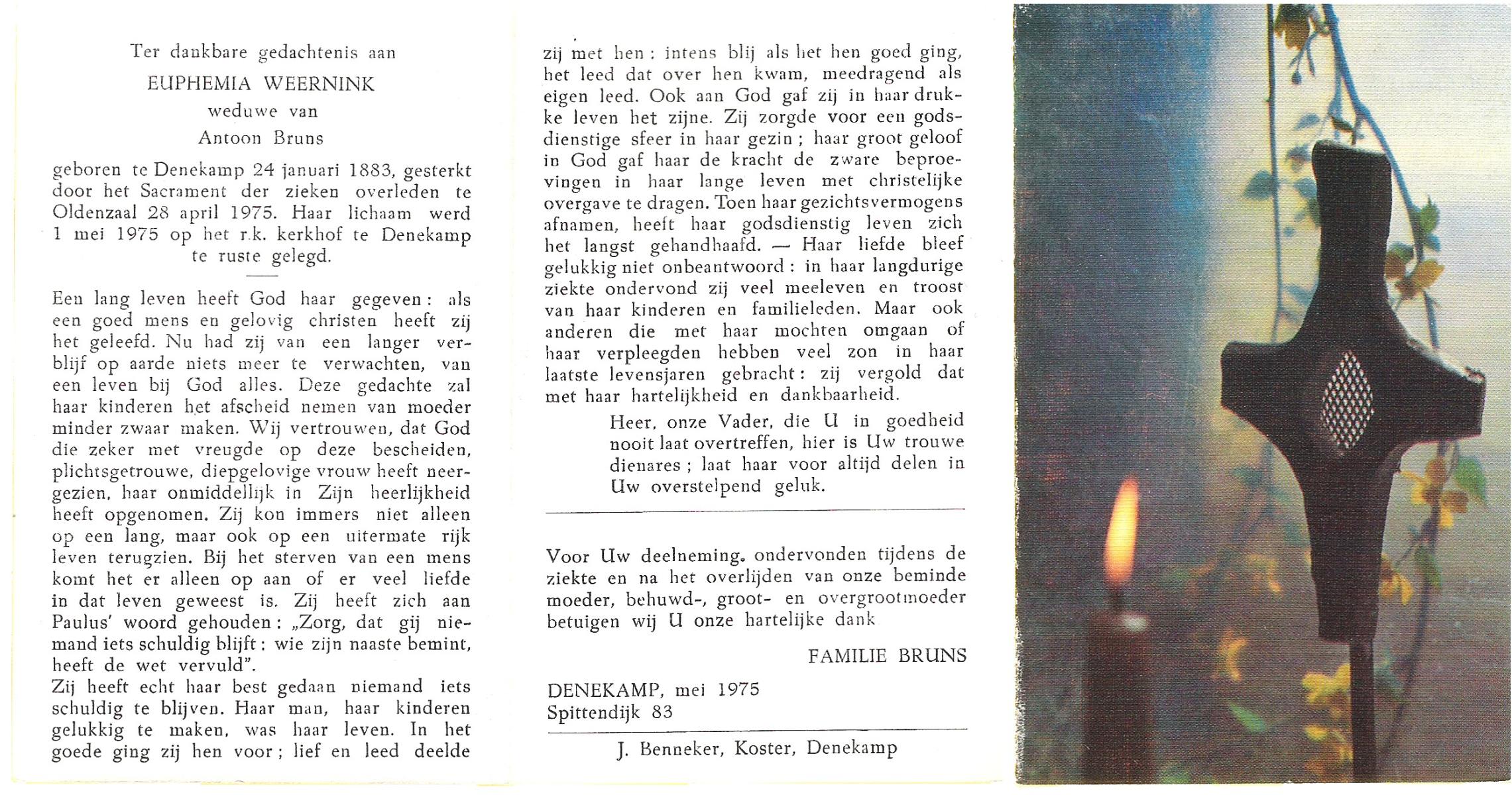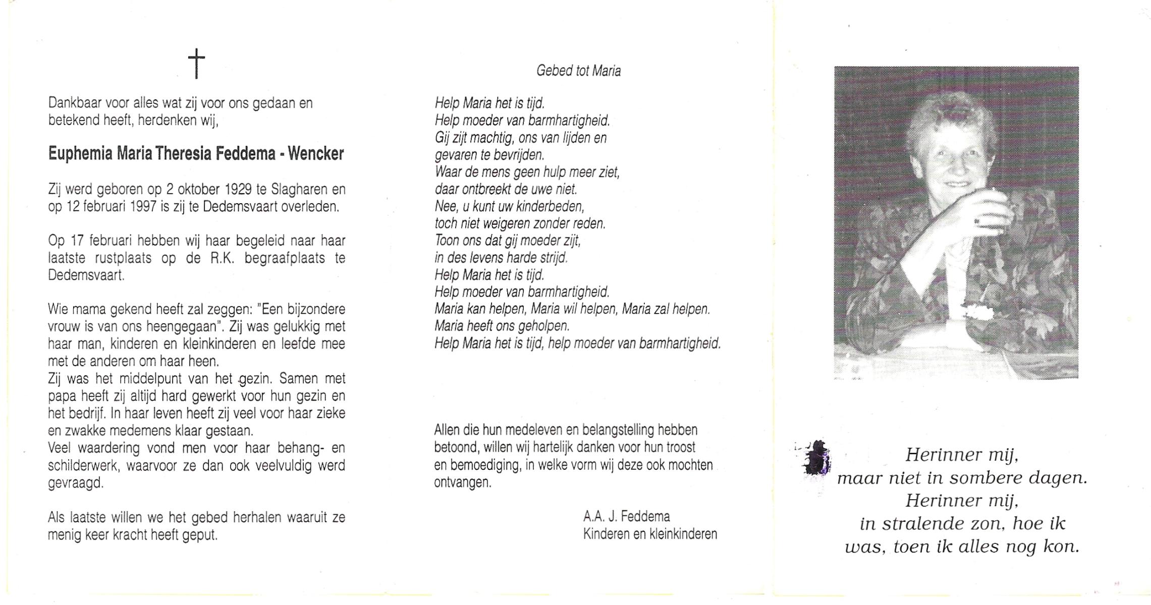 WENCKER, Euphemia Maria Theresia, geboren op 2-10-1929 te Slagharen, overleden op 12-2-1997 te Dedemsvaart op 67-jarige leeftijd, begraven op 17-2-1997 te Dedemsvaart.