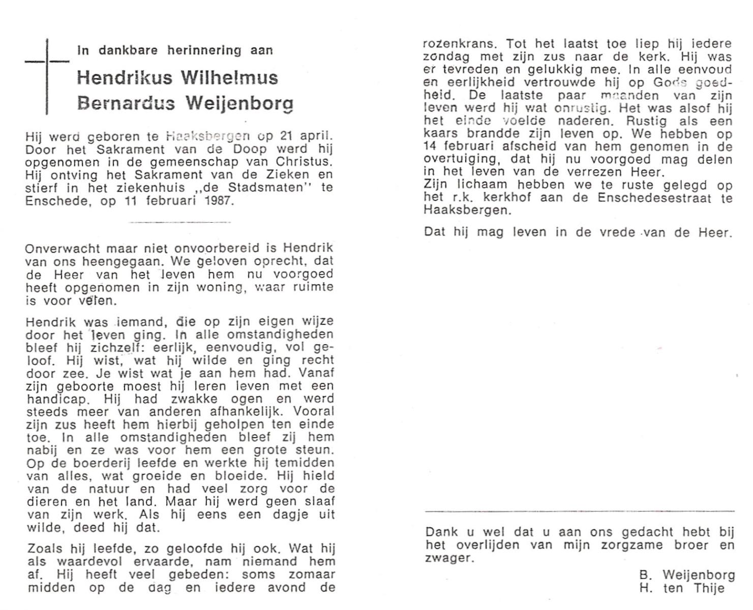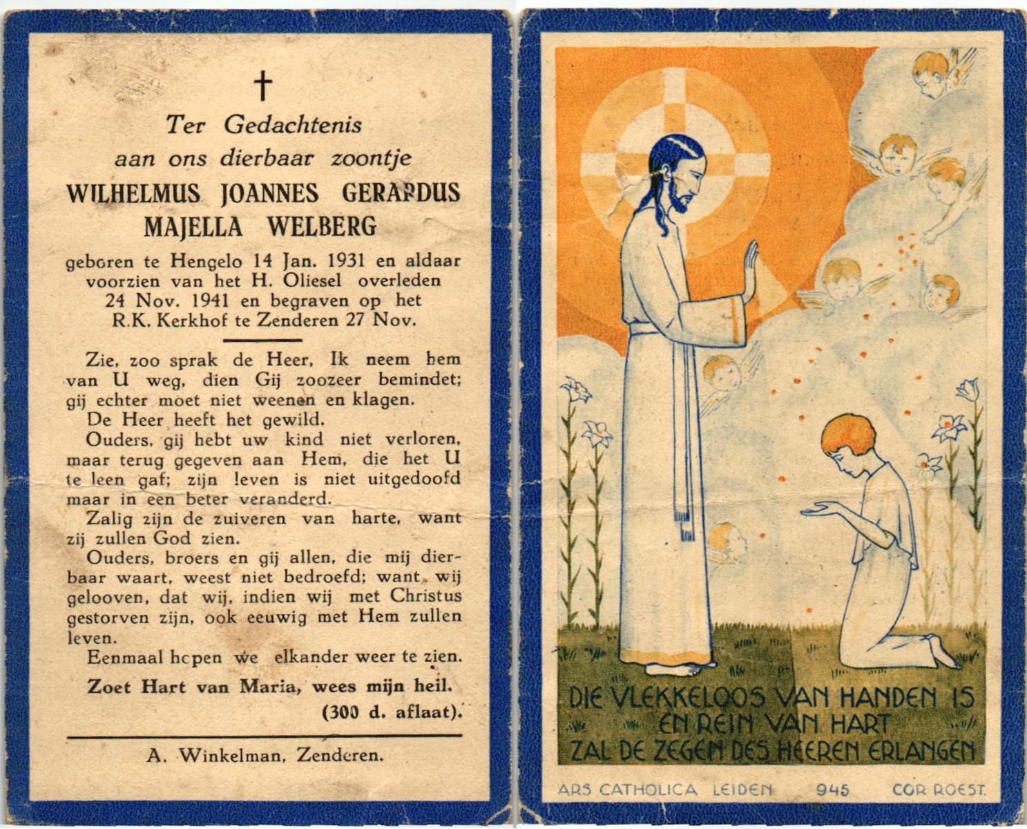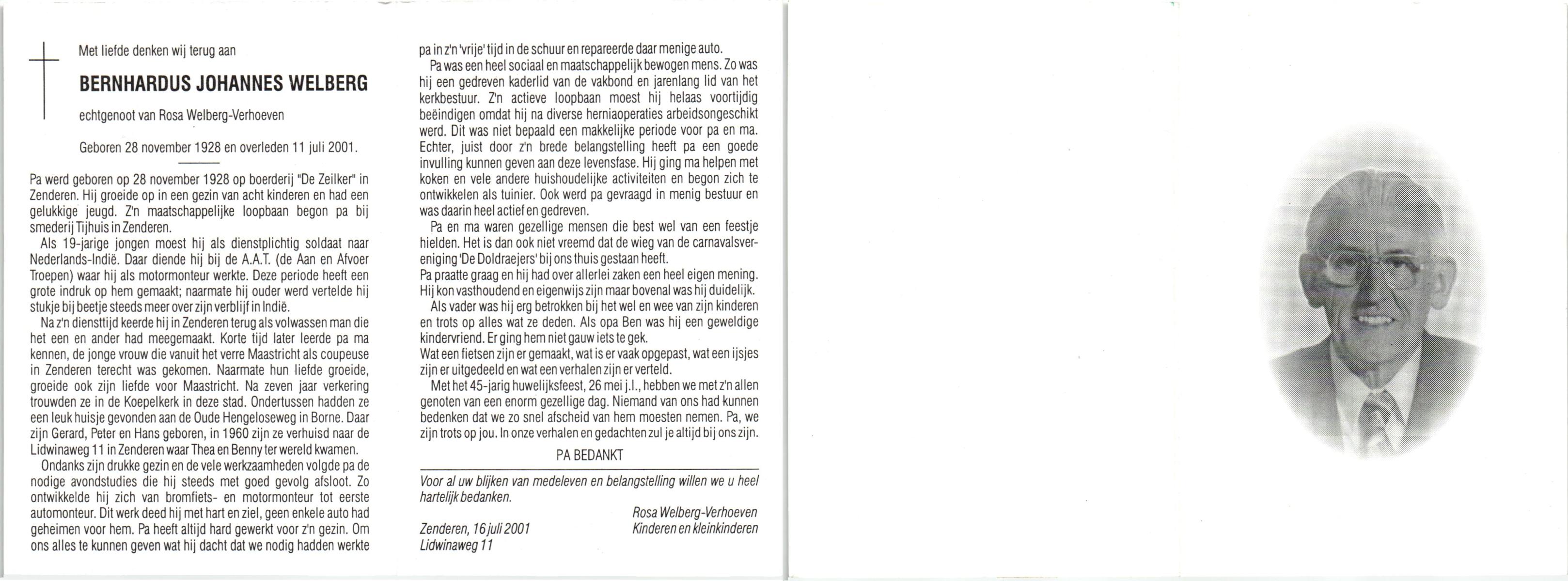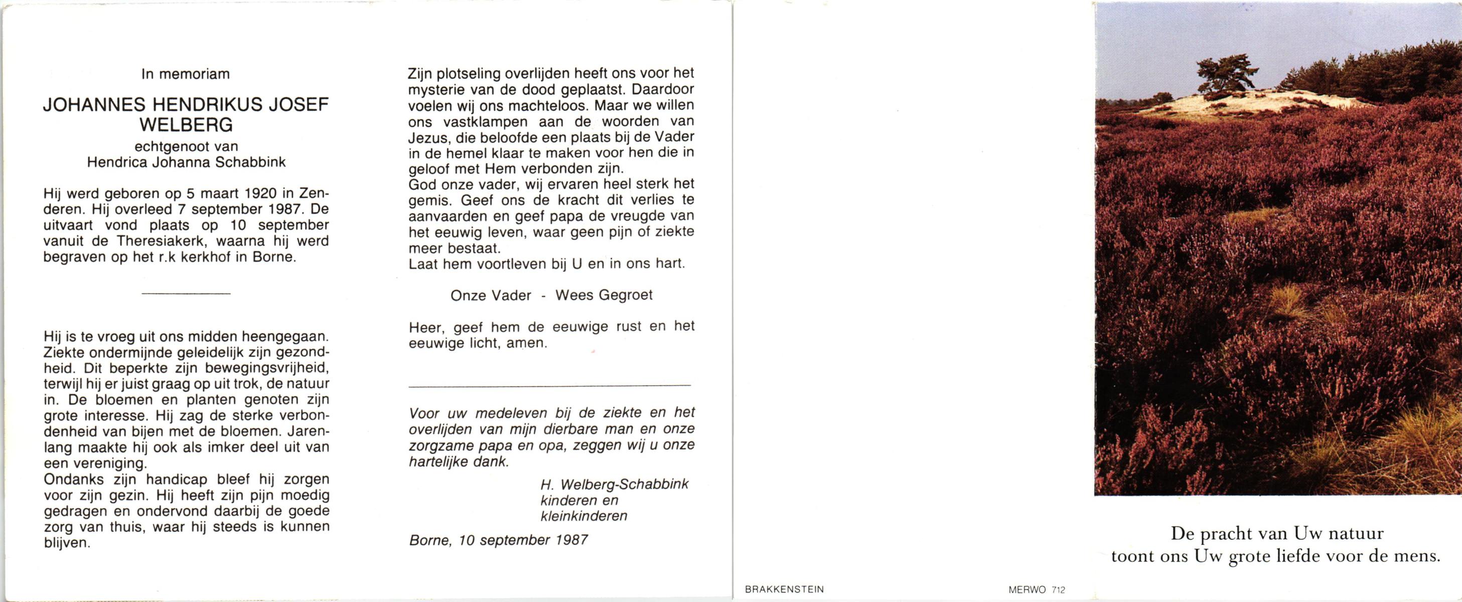 WELBERG, Johannes Hendrikus Josef, geboren op 5-3-1920 te Zenderen, overleden op 7-9-1987 op 67-jarige leeftijd, begraven op 10-9-1987 te Borne.