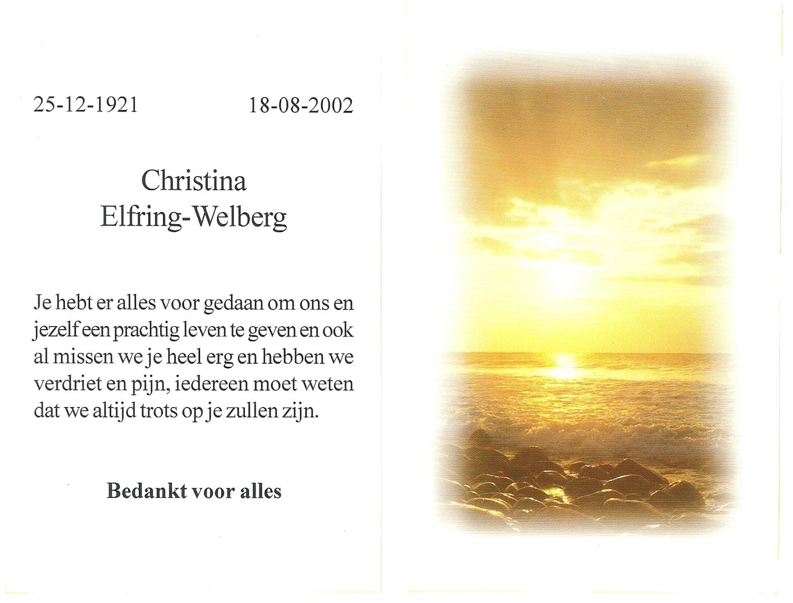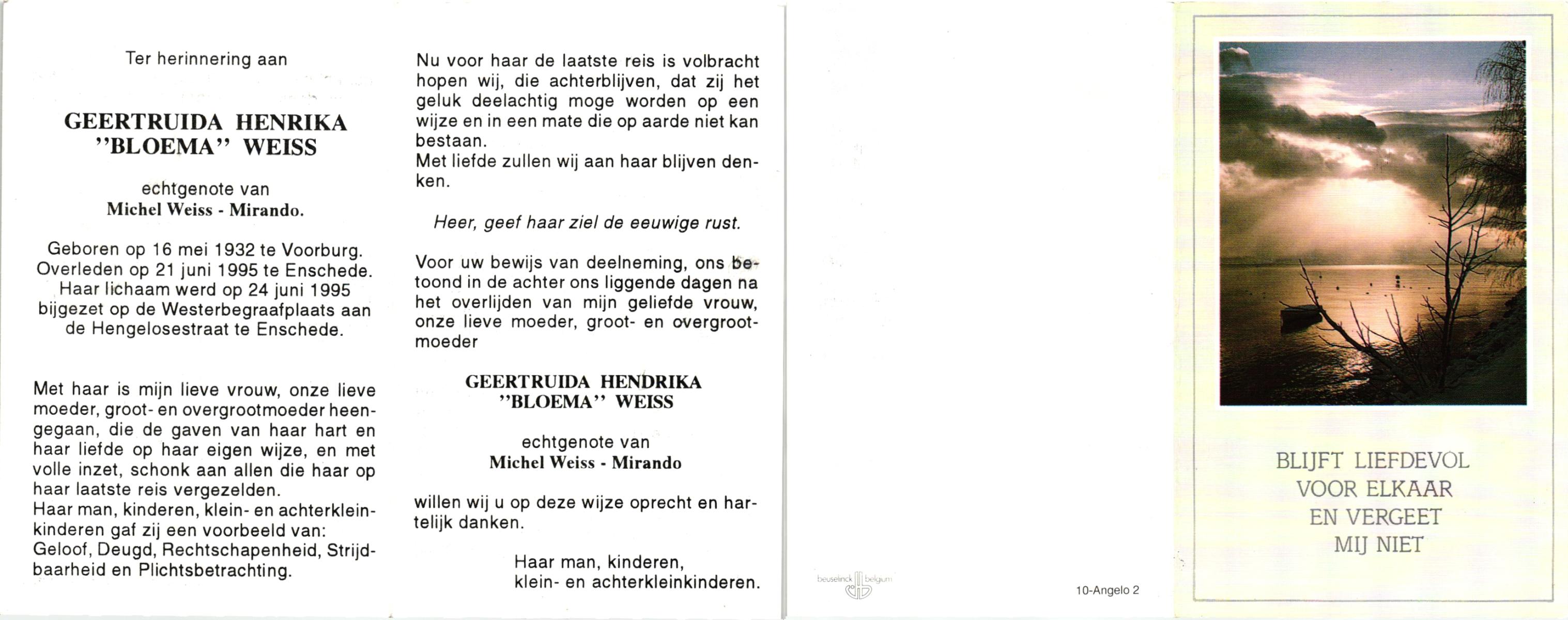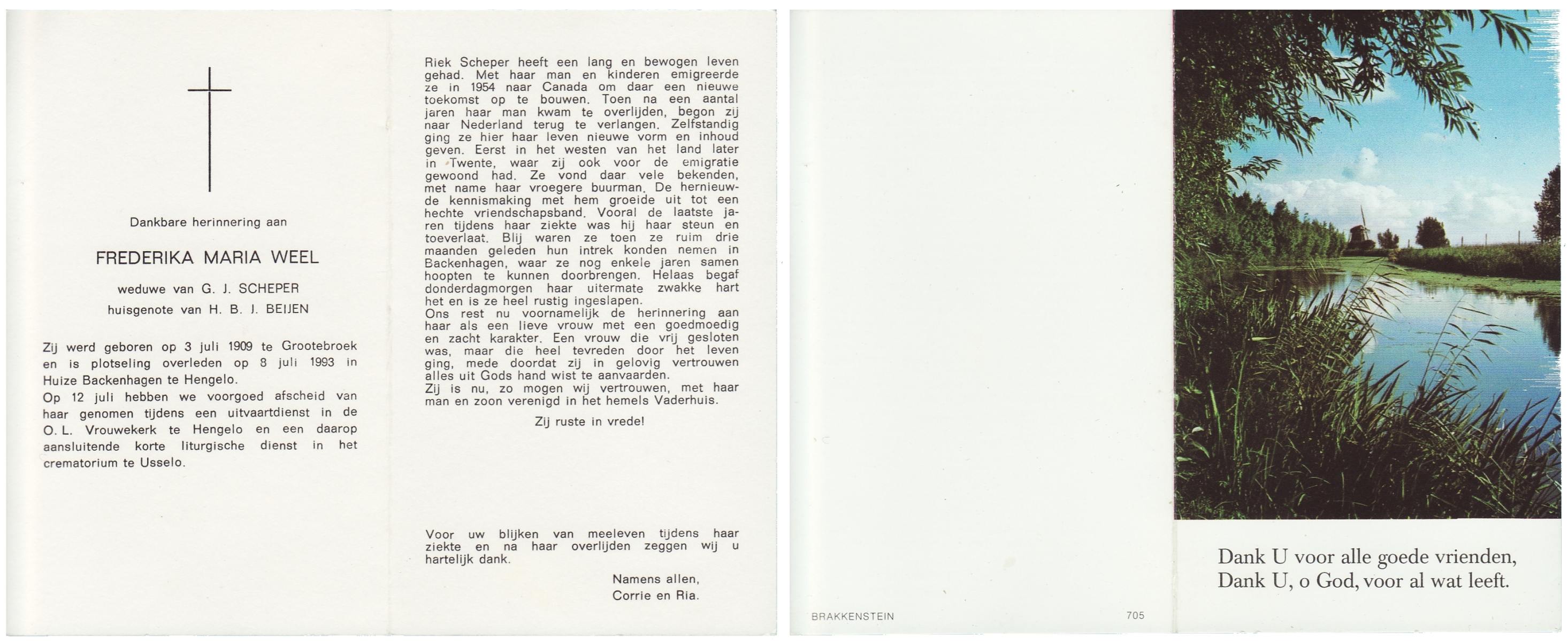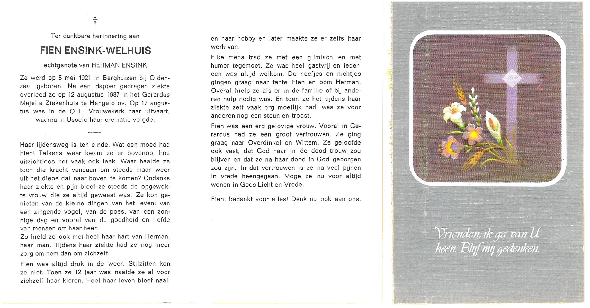 WELHUIS, Fien, geboren op 5-5-1921 te Berghuizen, overleden op 12-8-1987 te Hengelo (Ov.) op 66-jarige leeftijd, gecremeerd op 17-8-1987 te Usselo.