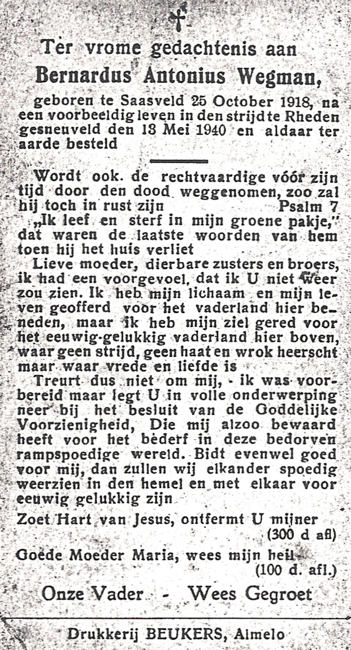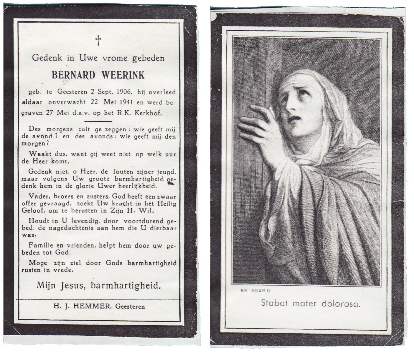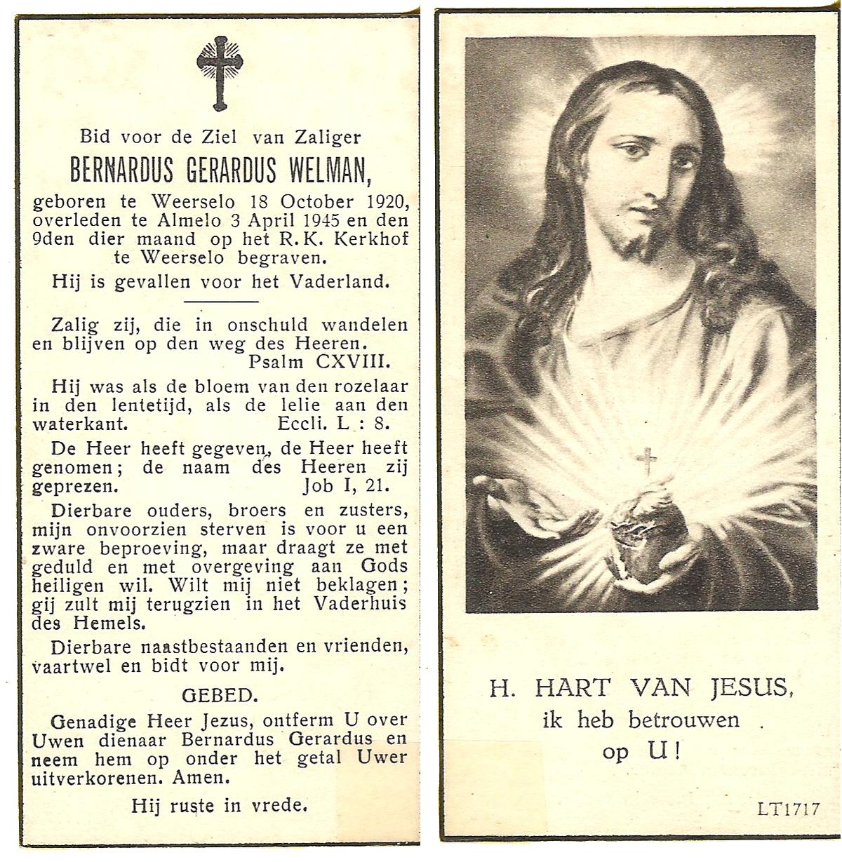 WELMAN, Bernardus Gerardus, geboren op 18-10-1920 te Weerselo, overleden op 3-4-1945 te Almelo op 24-jarige leeftijd, begraven op 9-4-1945 te Weerselo.