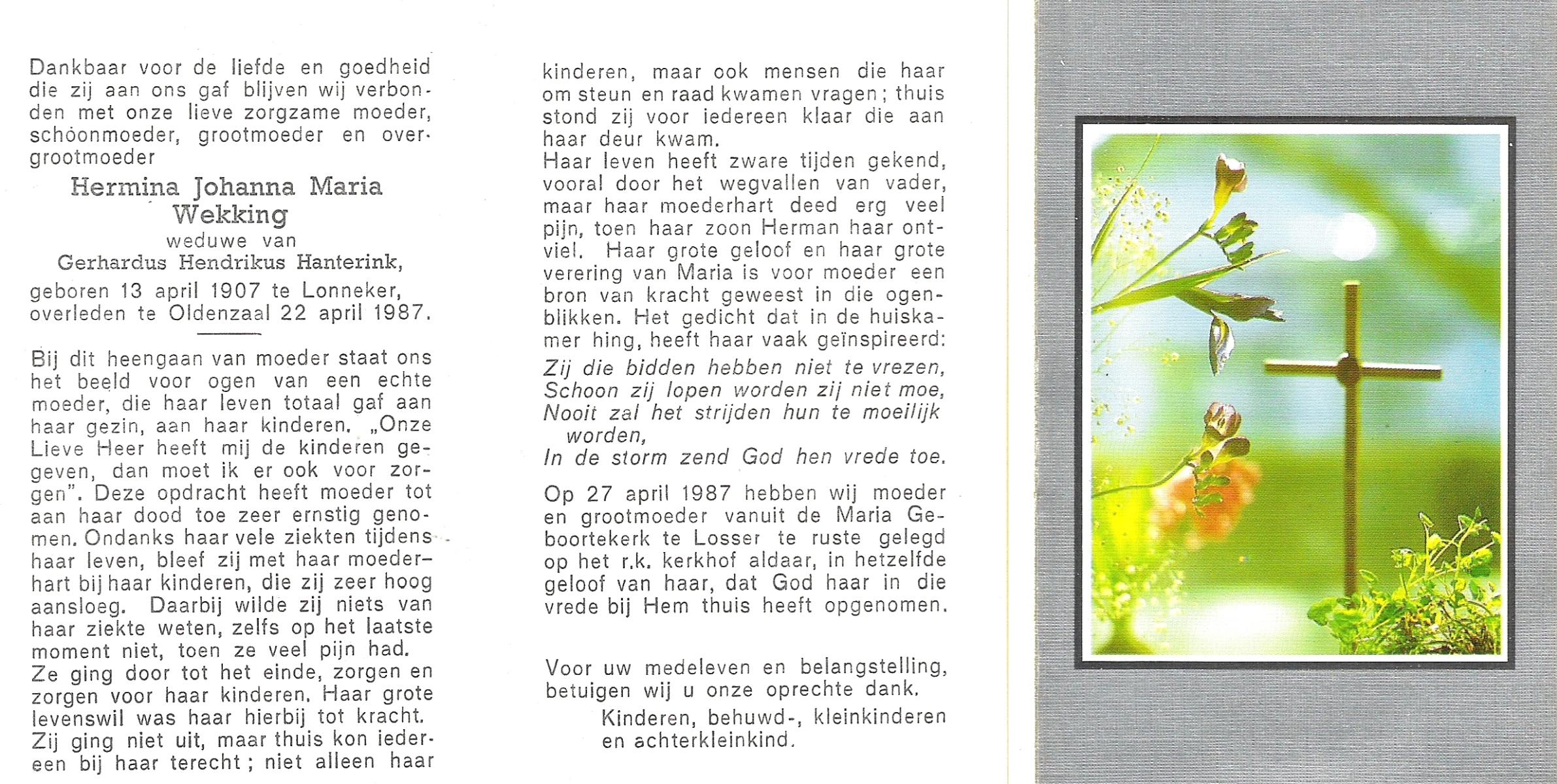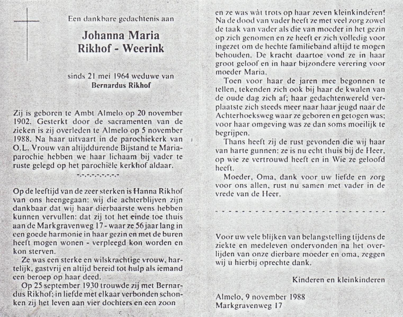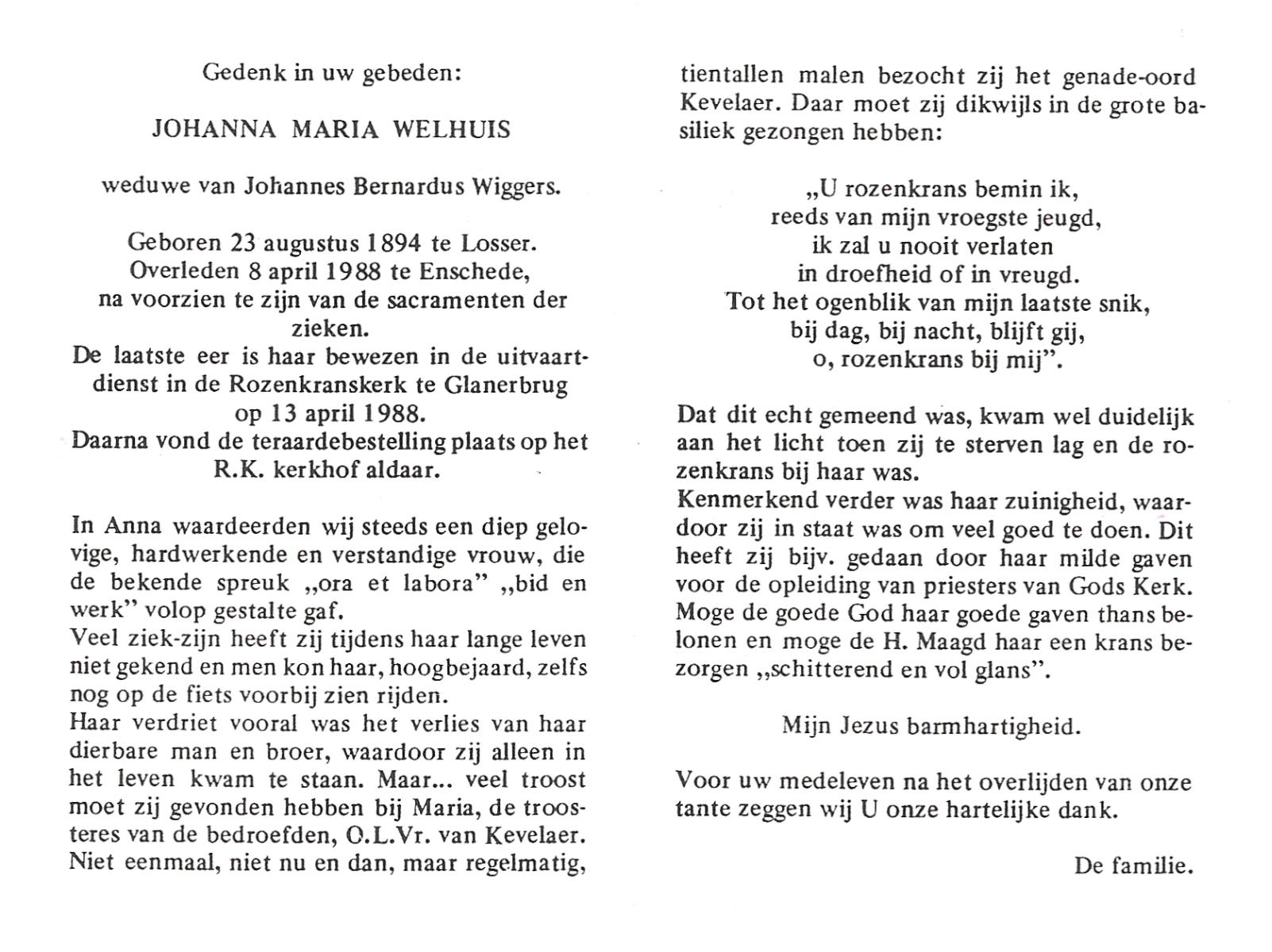 WELHUIS, Johanna Maria, geboren op 23-08-1894 te Losser, overleden op 8-4-1988 te Enschede op 93-jarige leeftijd, begraven op 13-4-1988 te Glanerbrug.