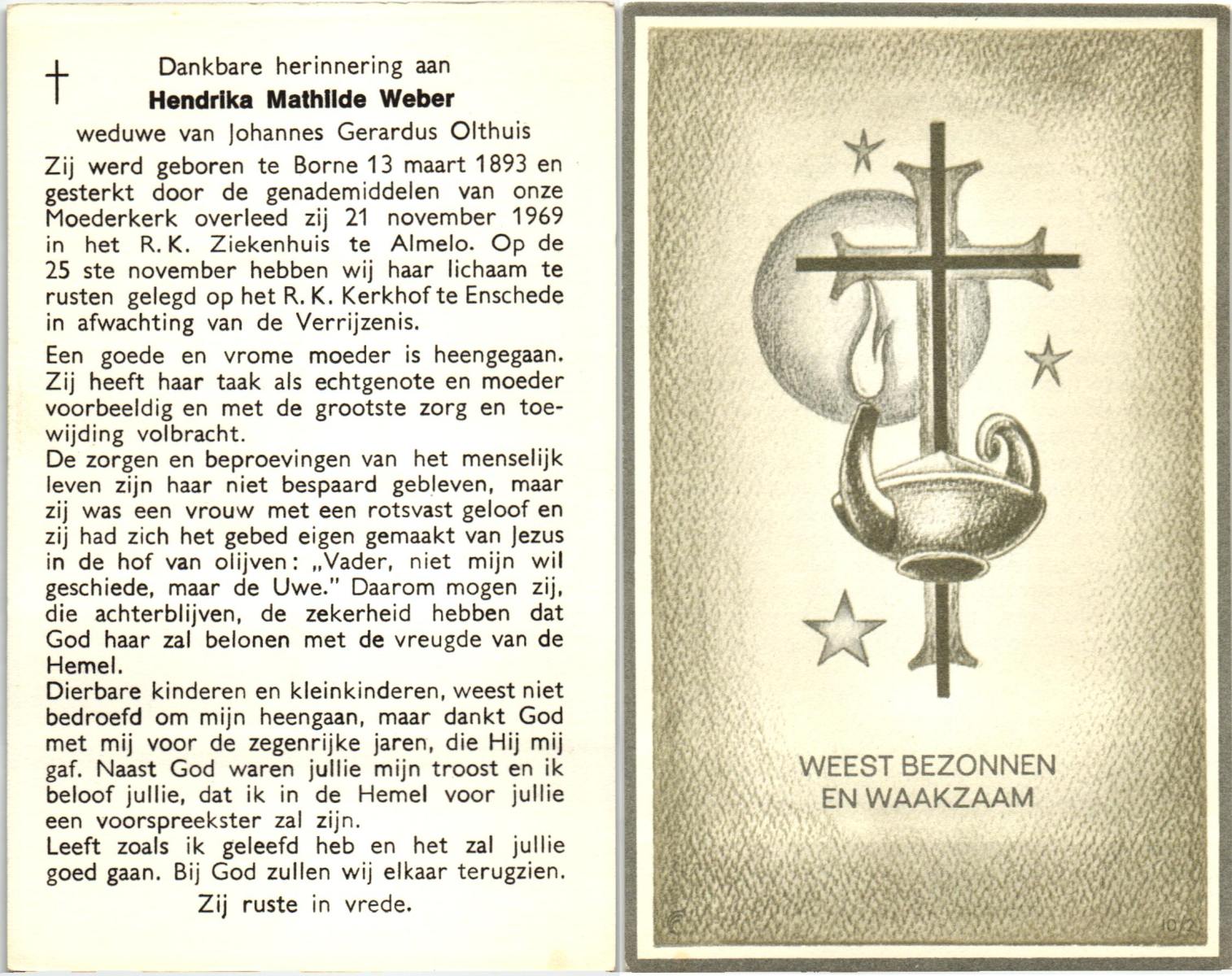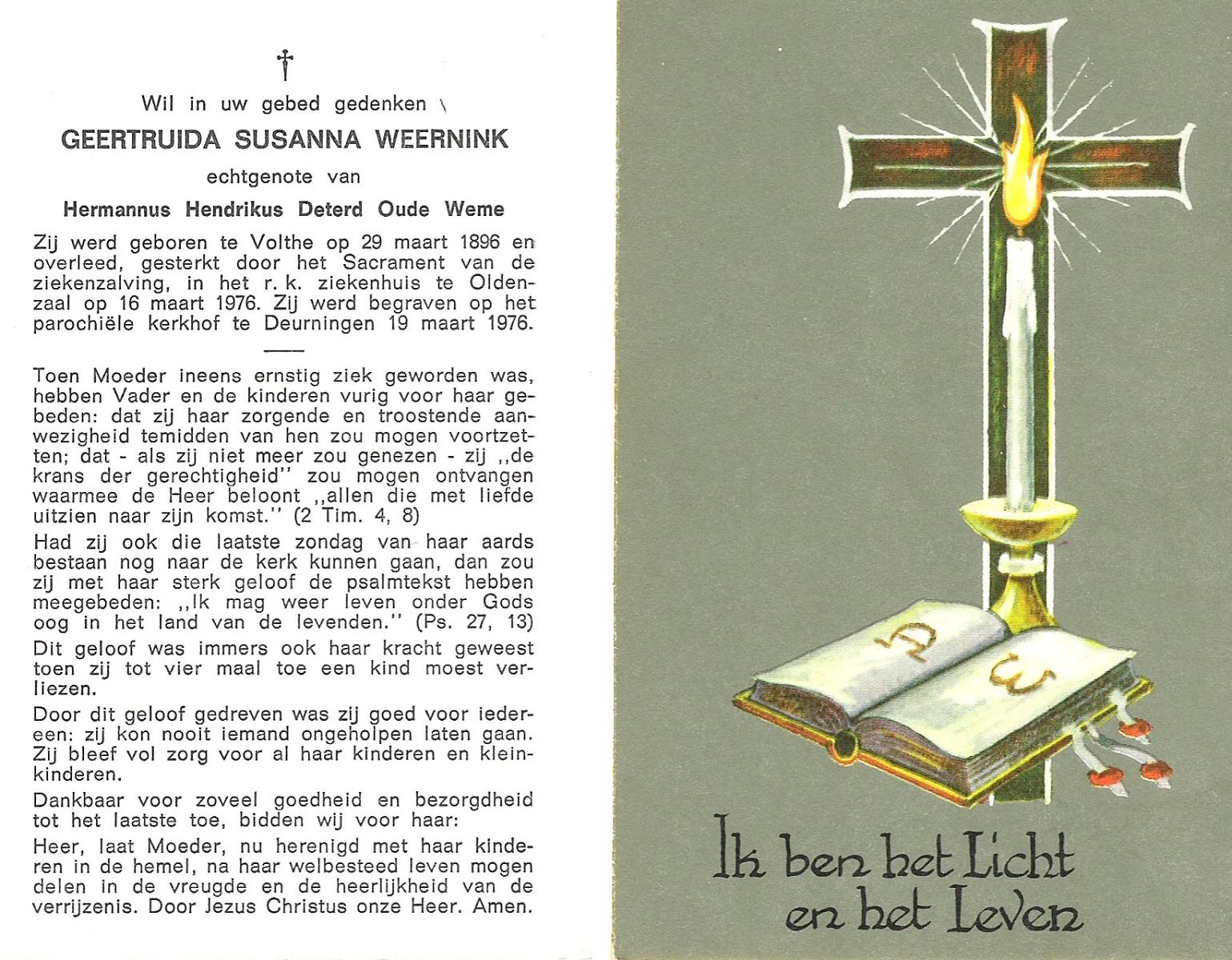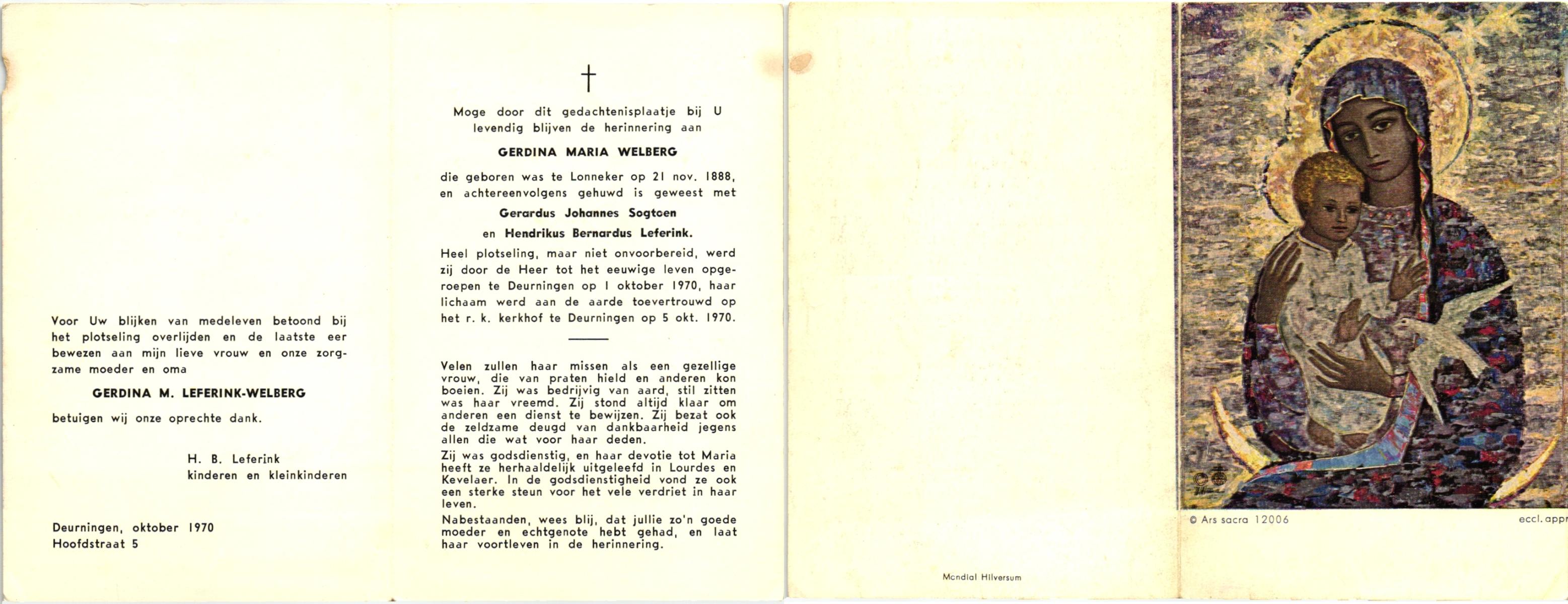 WELBERG, , Gerdina Maria, geboren op 21-11-1888 te Lonneker, overleden op 1-10-1970 te Deurningen op 81-jarige leeftijd, begraven op 5-10-1970 te Deurningen.