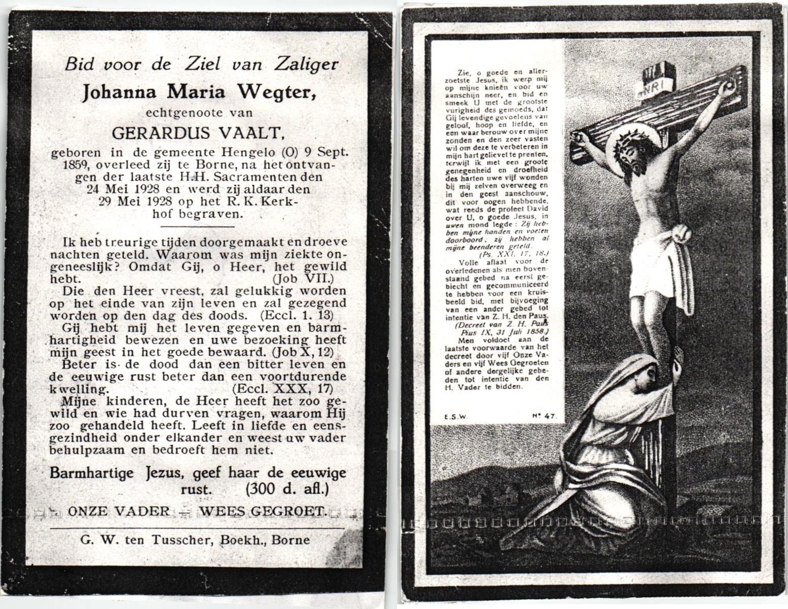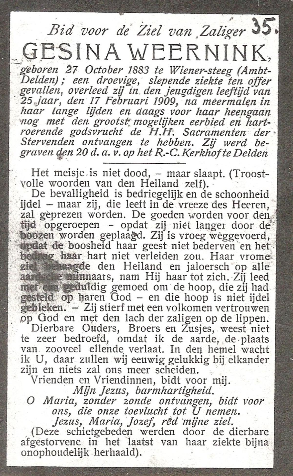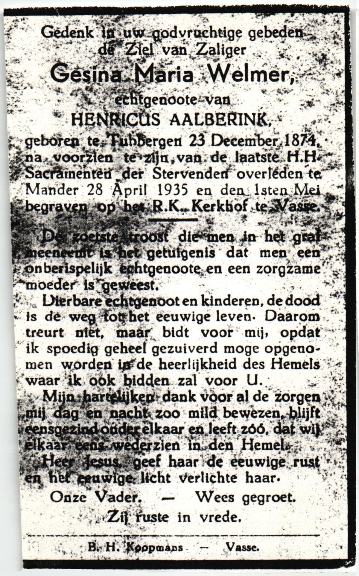 WELMER, Gesina Maria, geboren op 23-12-1874 te Tubbergen, overleden op 28-4-1935 te Mander op 60-jarige leeftijd, begraven op 1-5-1935 te Vasse.