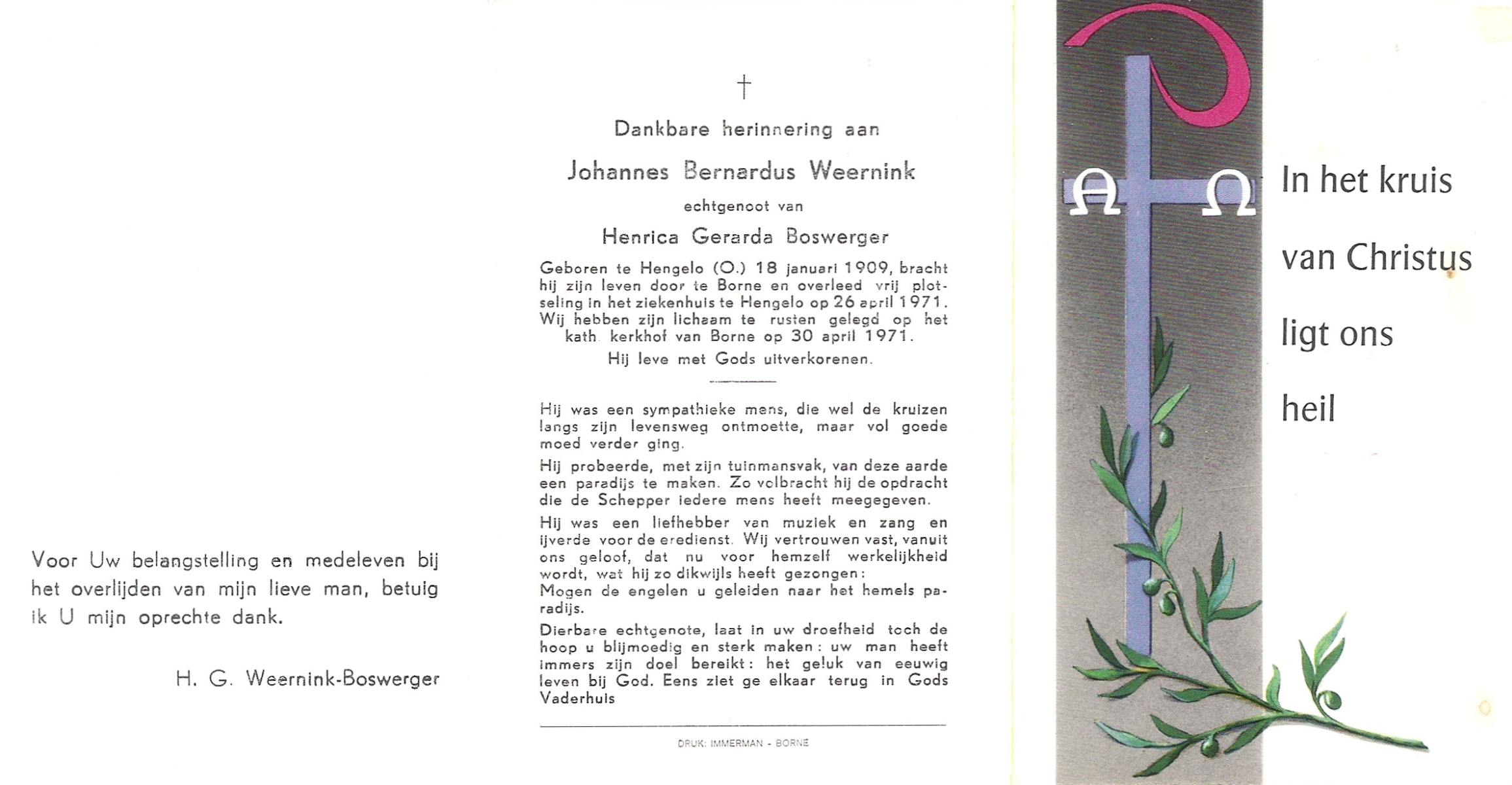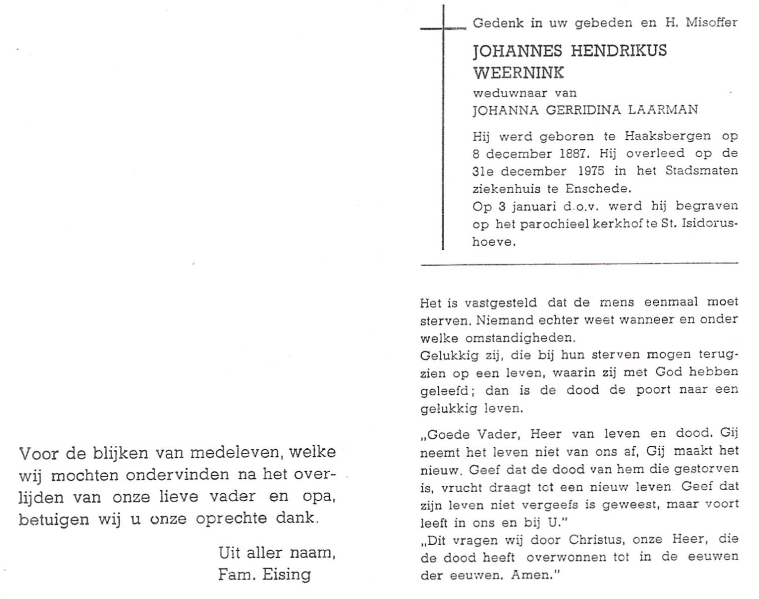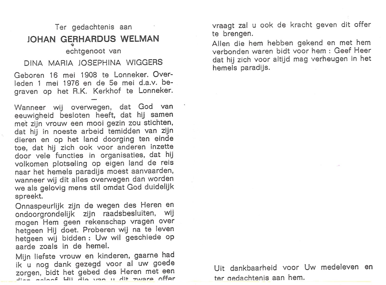 WELMAN, Johan Gerhardus, geboren op 16-5-1908 te Lonneker, overleden op 1-5-1976 op 67-jarige leeftijd, begraven op 5-5-1976 te Lonneker.