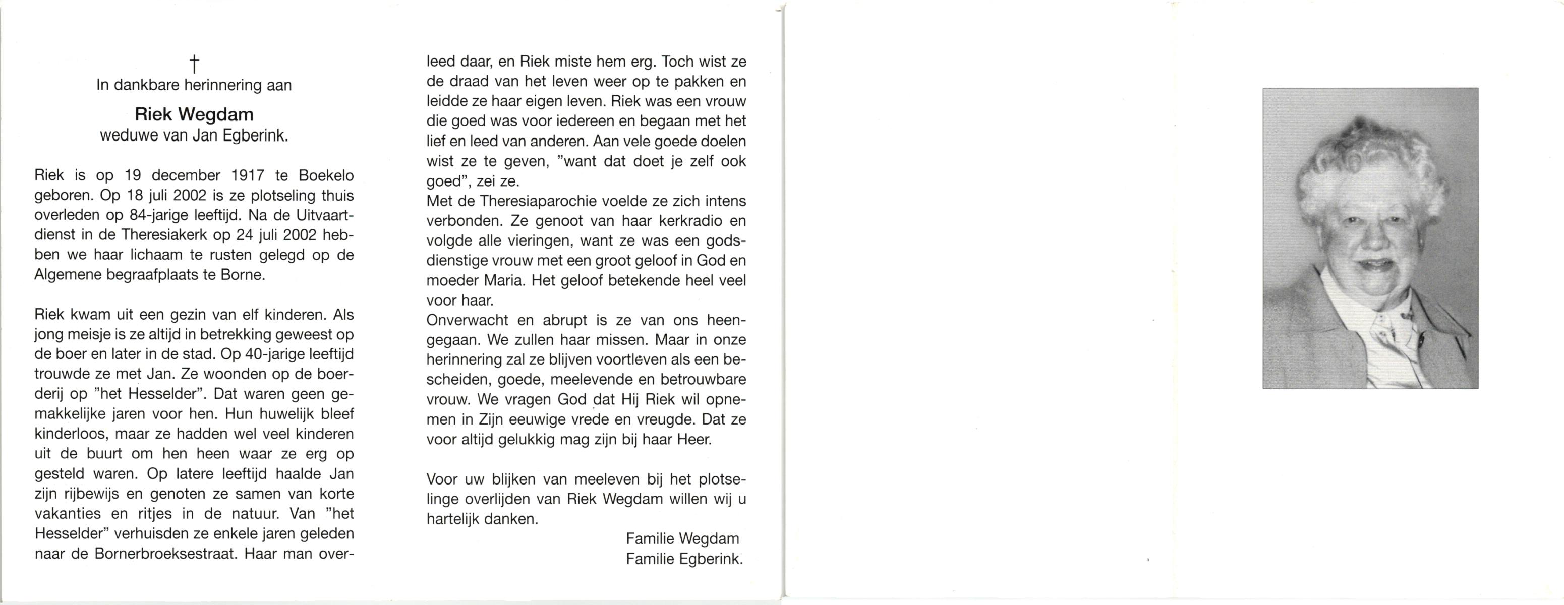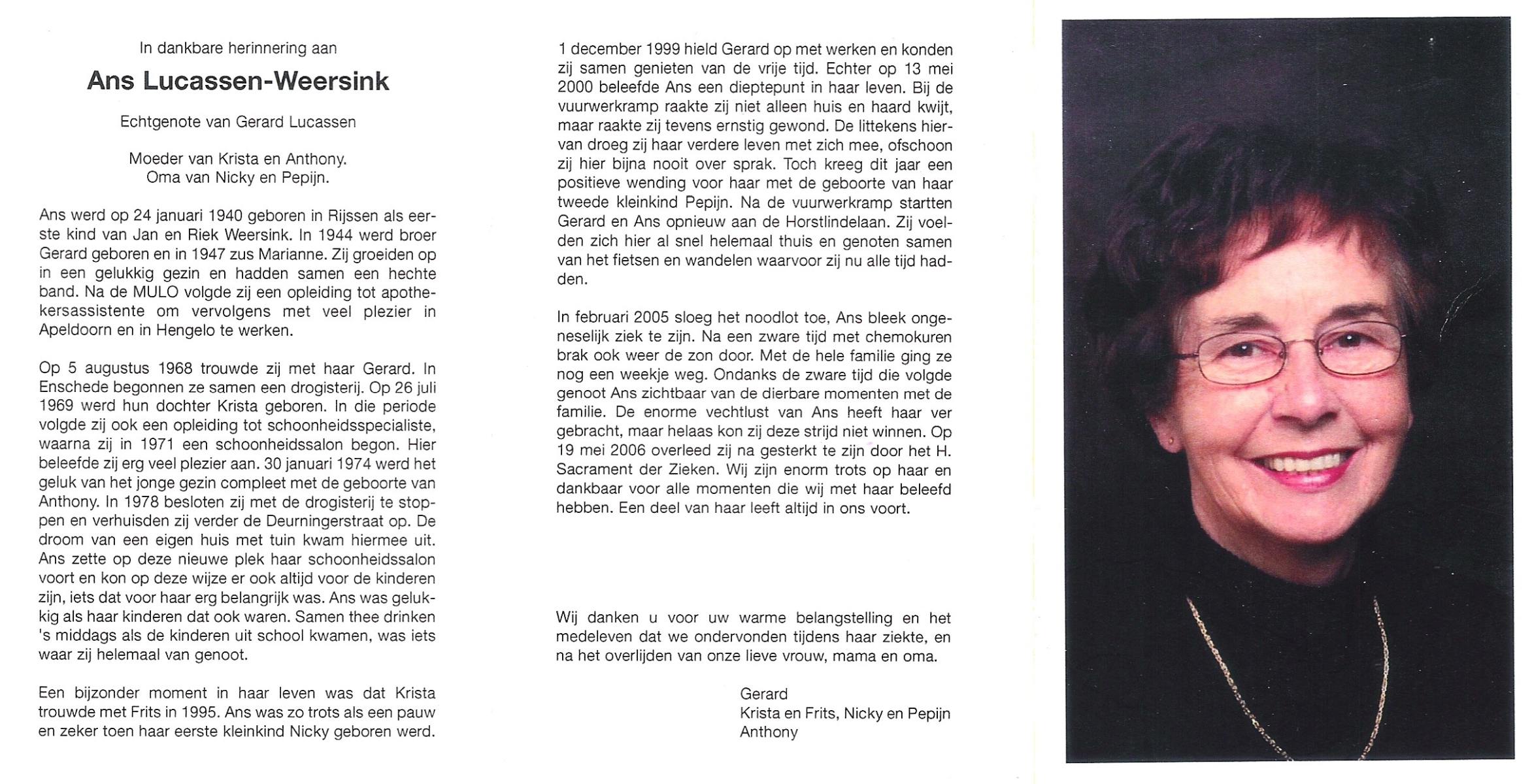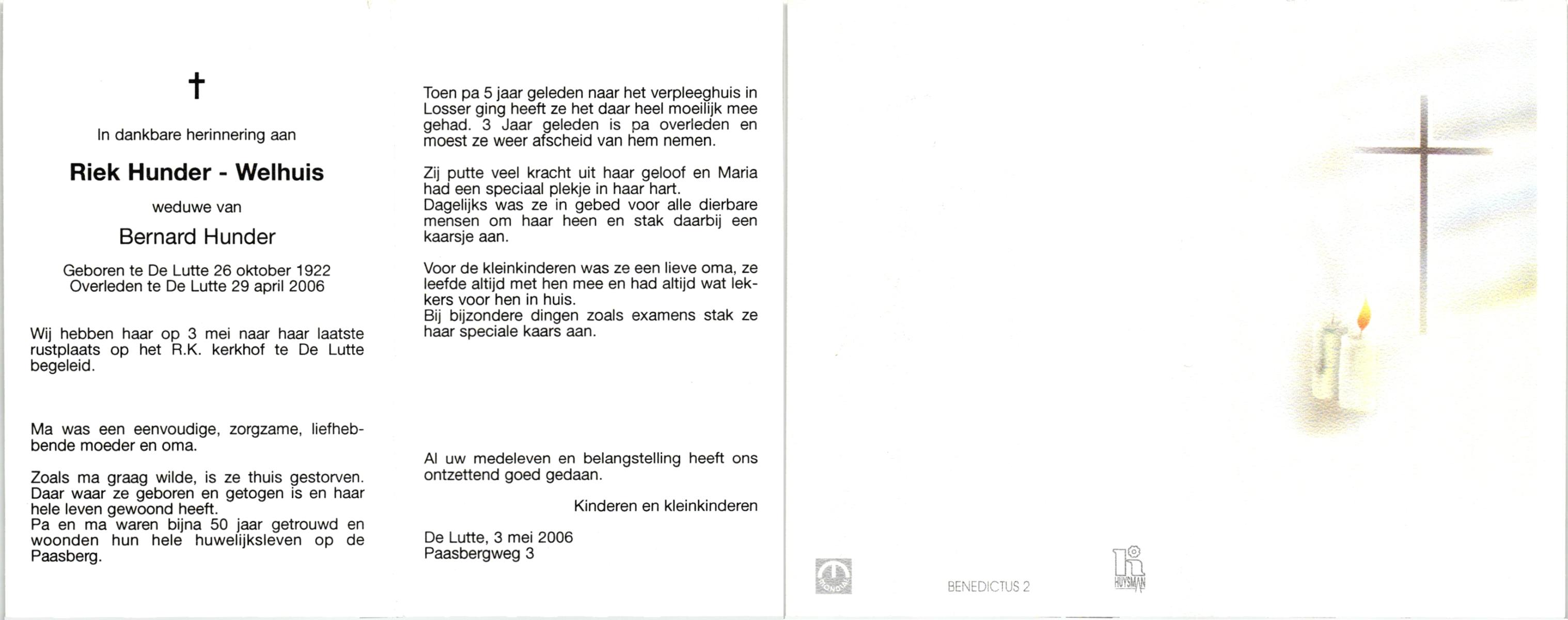 WELHUIS, , Riek, geboren op 26-10-1922 te De Lutte, overleden op 29-4-2006 te De Lutte op 83-jarige leeftijd, begraven op 3-5-2006 te De Lutte.