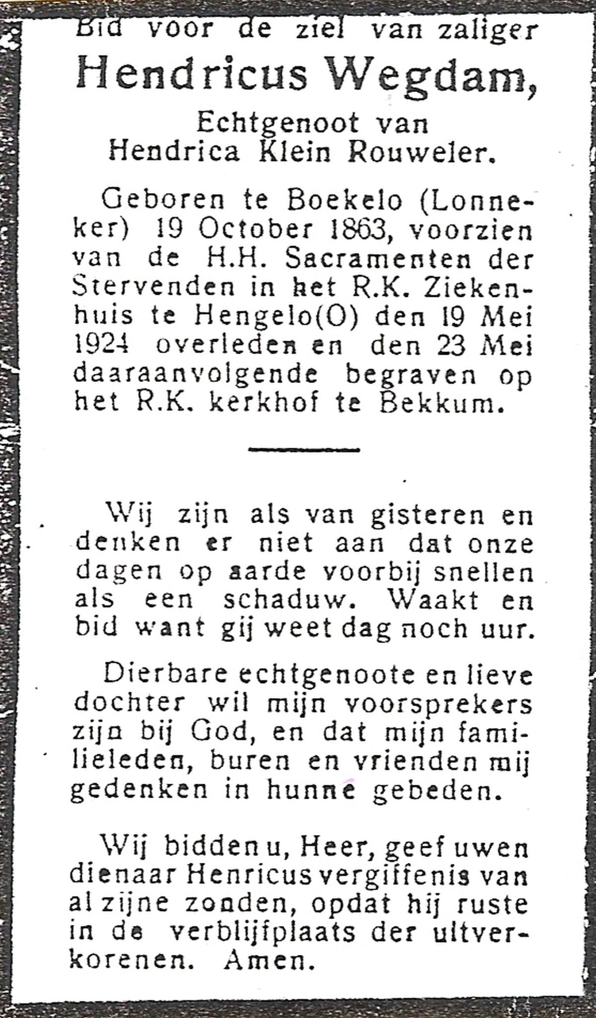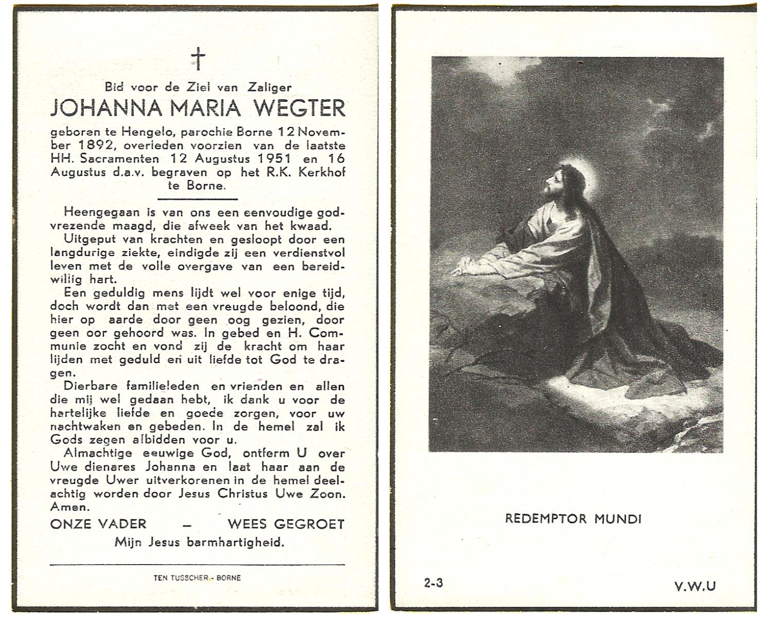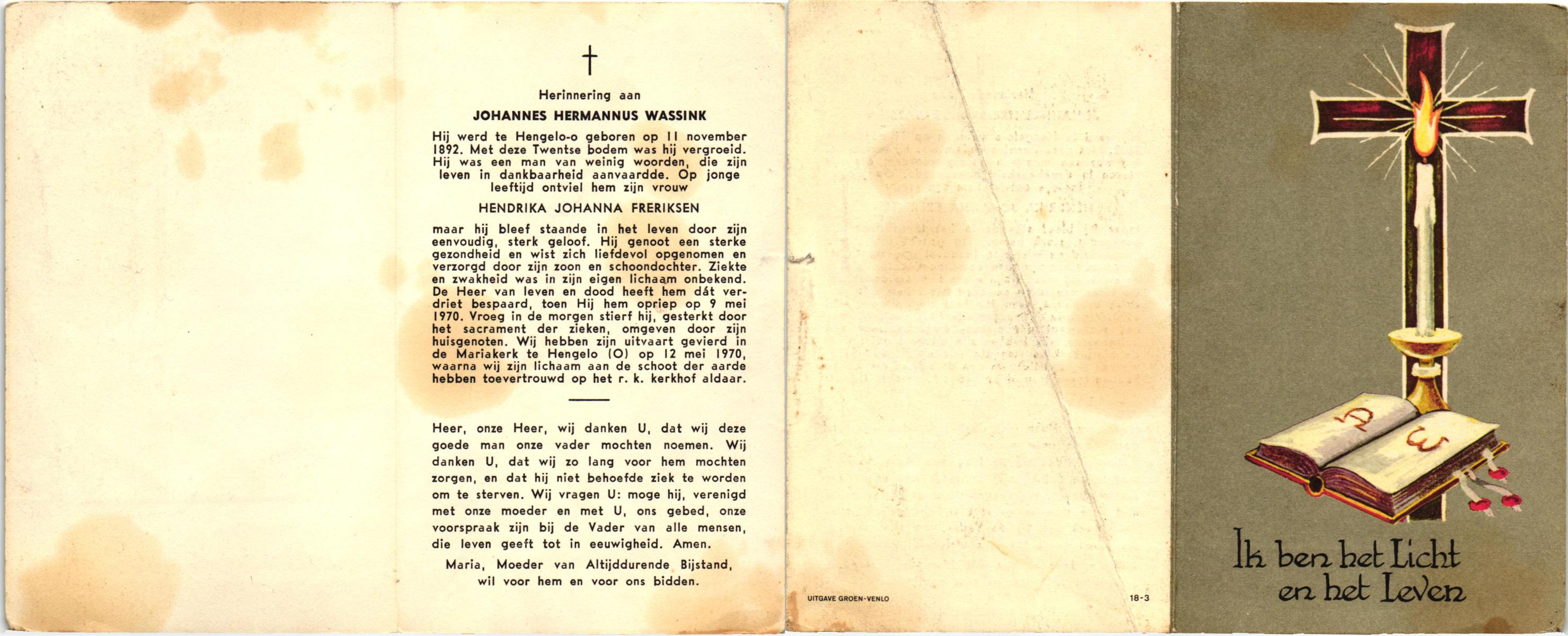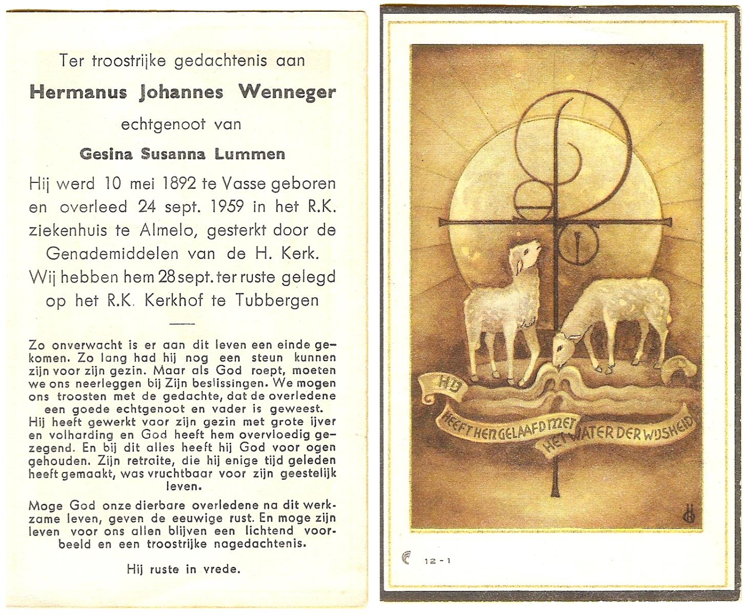 WENNEGER, Hermannes Johannes, geboren op 10-05-1892 te Vasse, overleden op 24-9-1959 te Almelo op 67-jarige leeftijd, begraven op 28-9-1959 te Tubbergen.