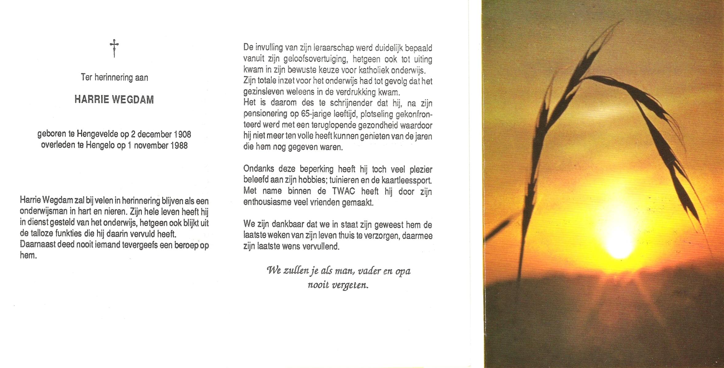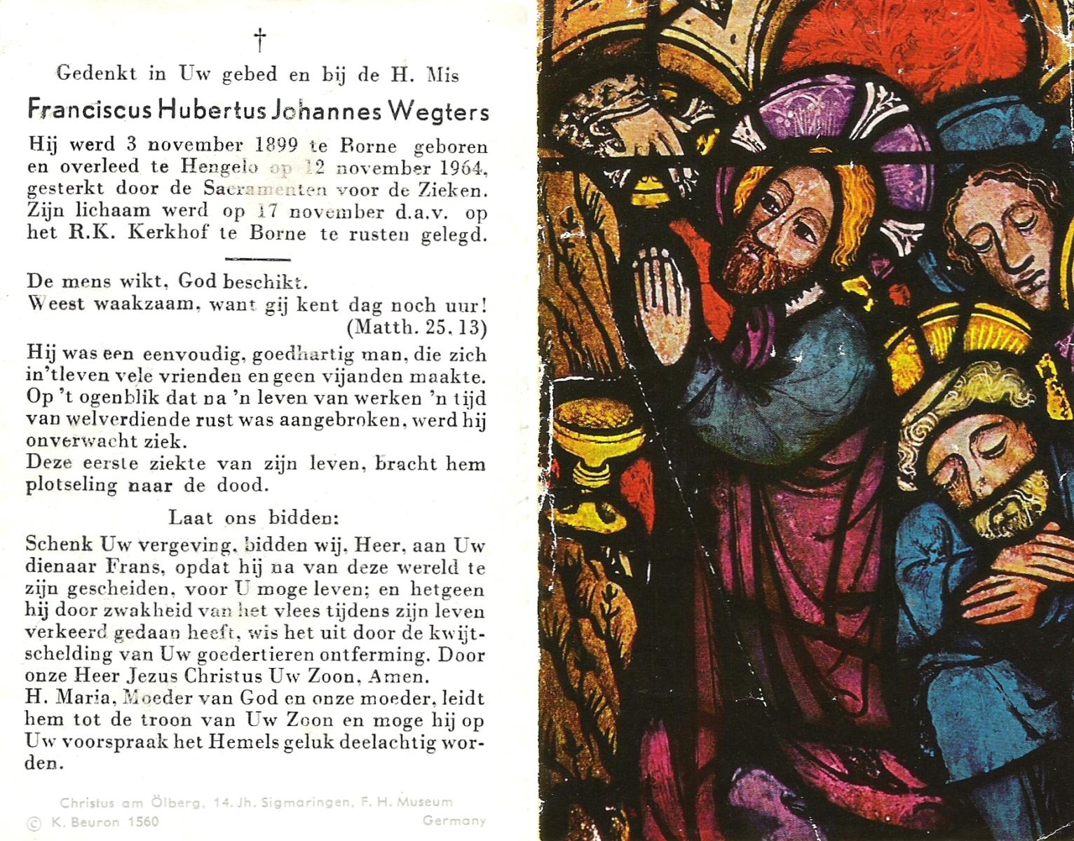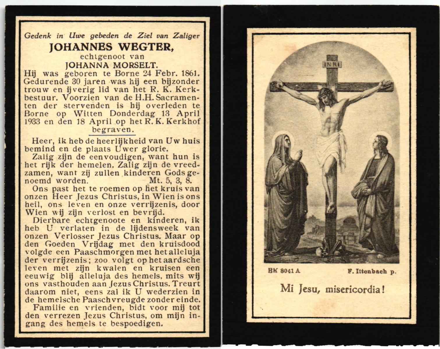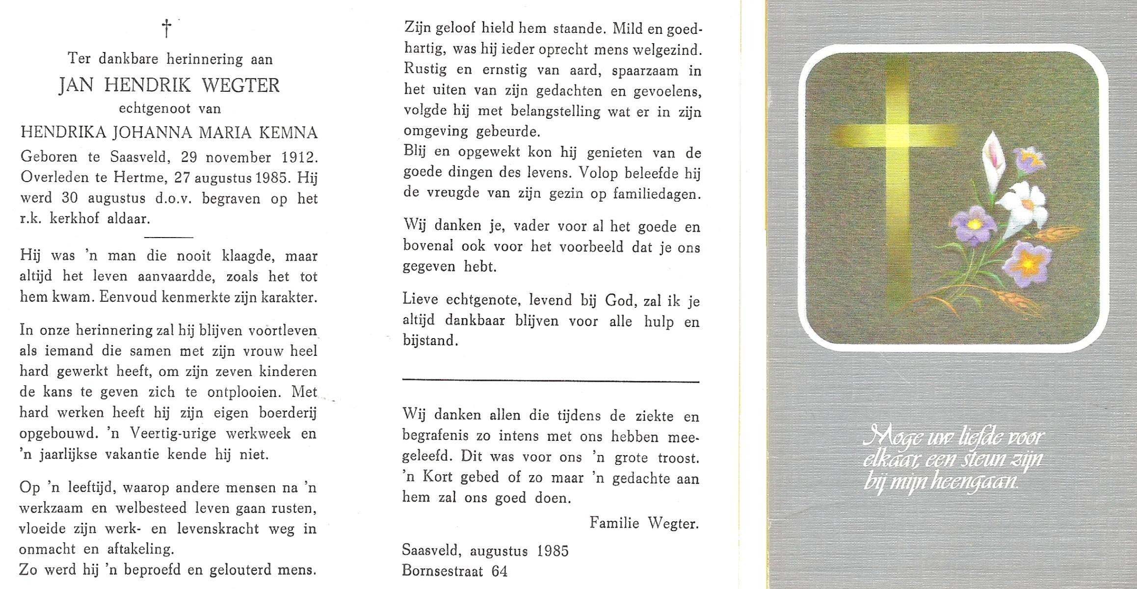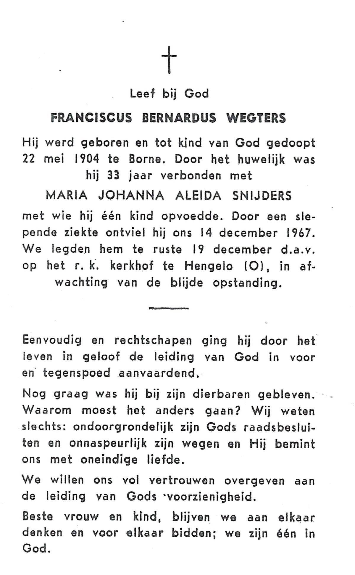 WENNEGER, Hermannes Johannes, geboren op 10-05-1892 te Vasse, overleden op 24-9-1959 te Almelo op 67-jarige leeftijd, begraven op 28-9-1959 te Tubbergen.