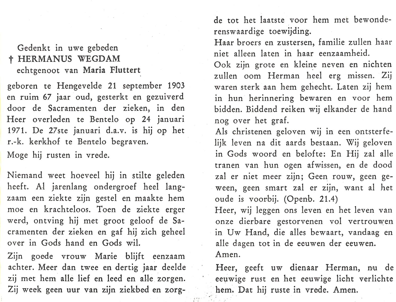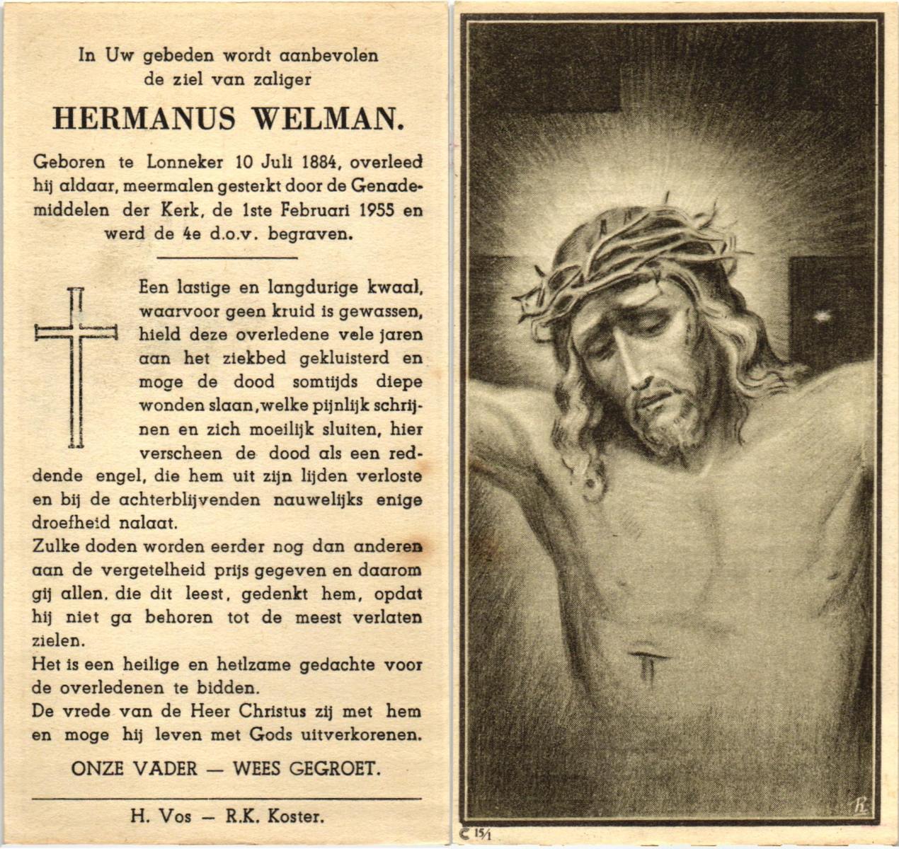 WELMAN, Hermanus, geboren op 10-07-1884 te Lonneker, overleden op 1-2-1955 te Lonneker op 70-jarige leeftijd, begraven op 4-2-1955 te Lonneker.