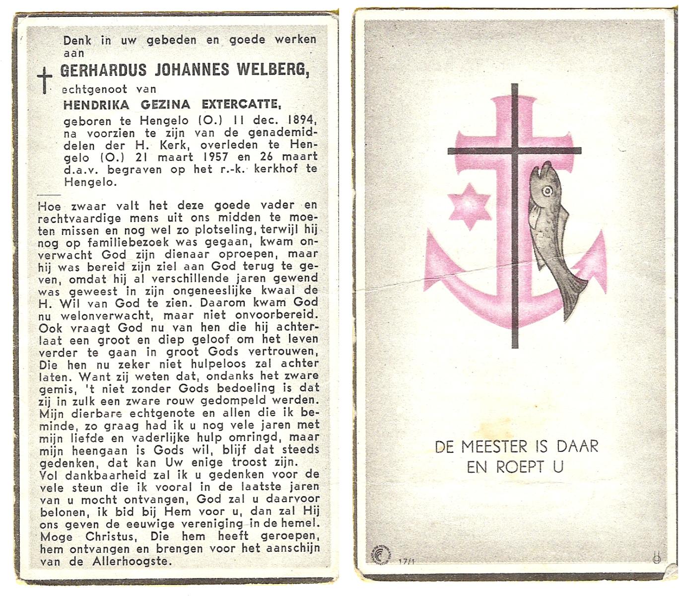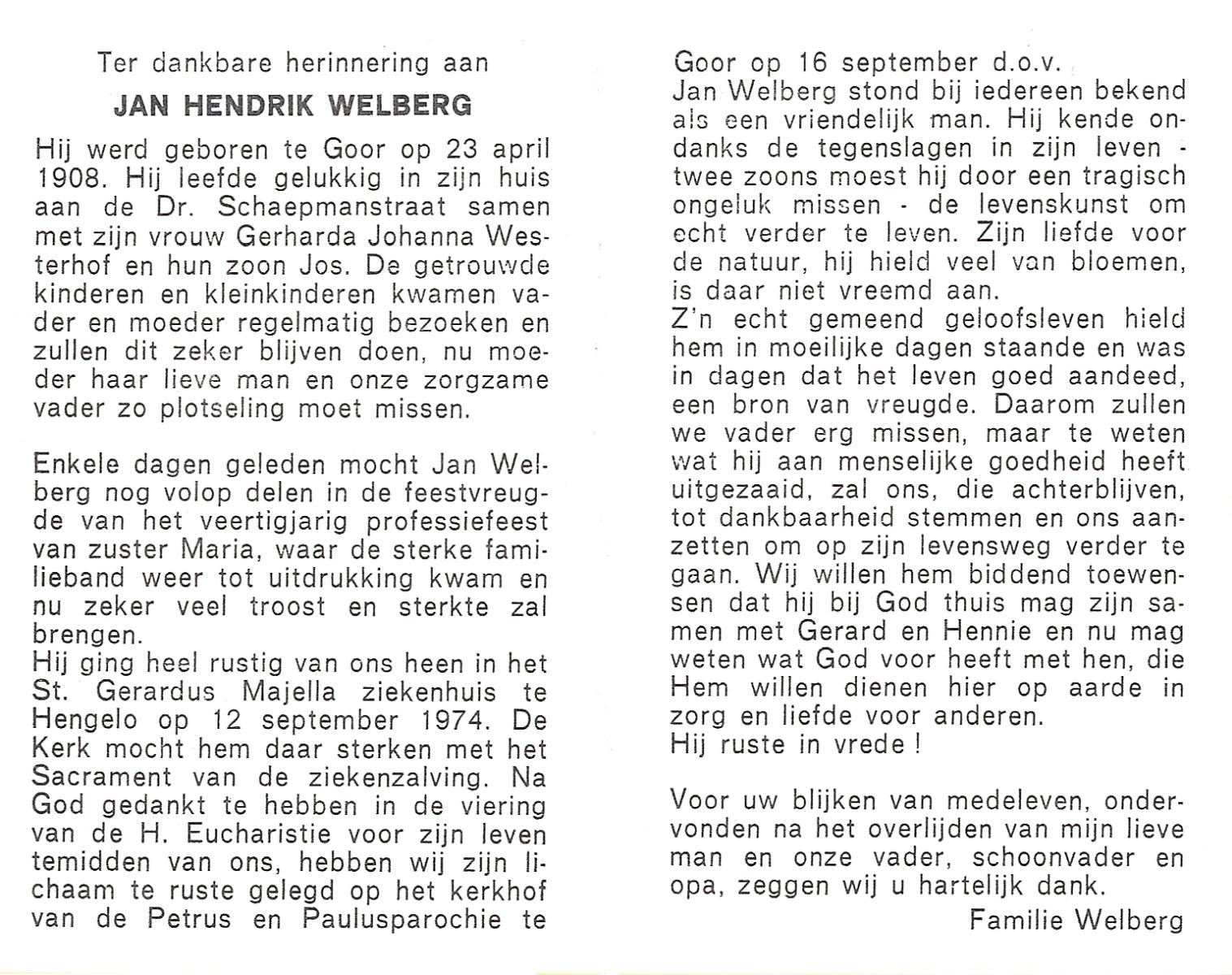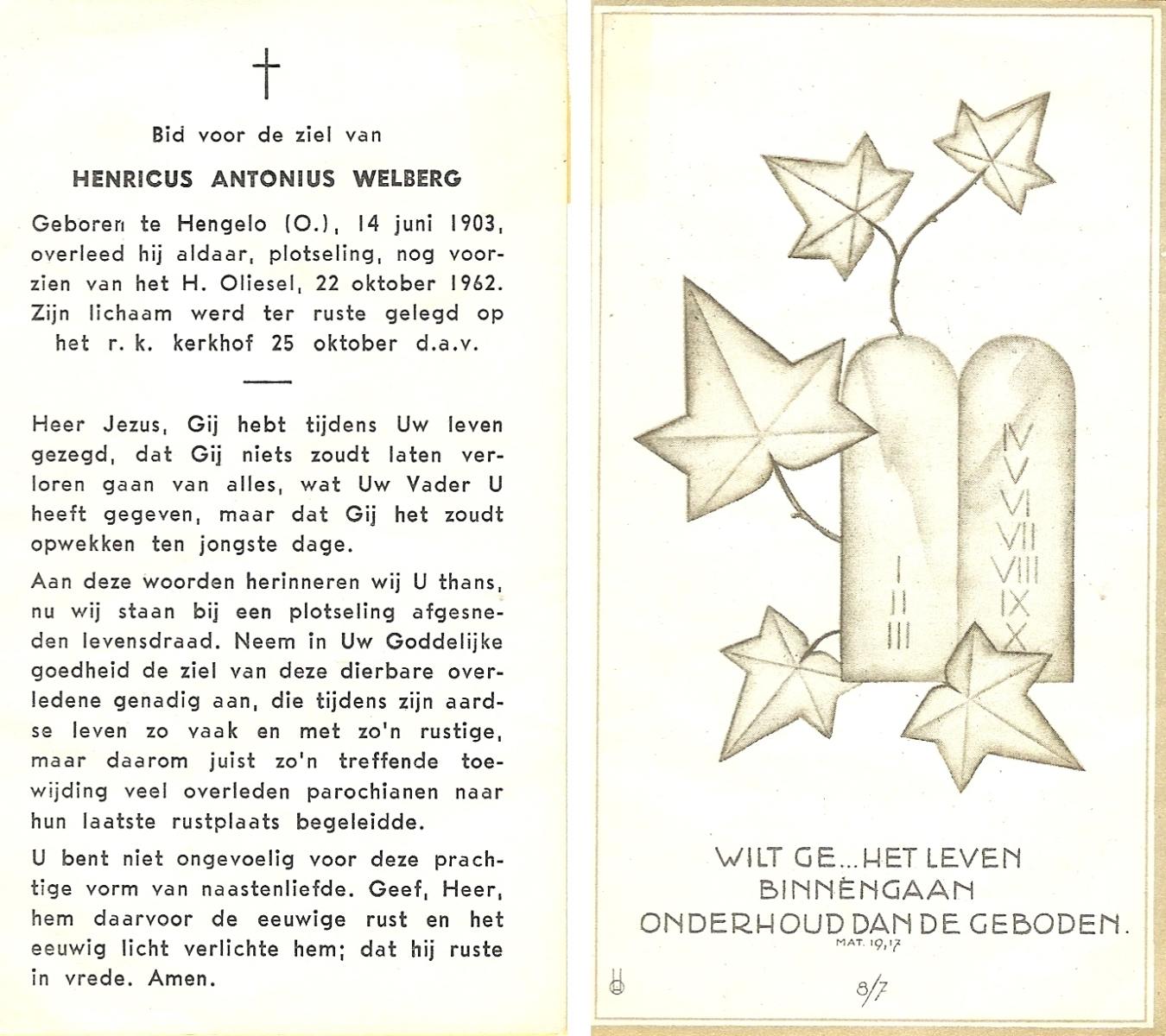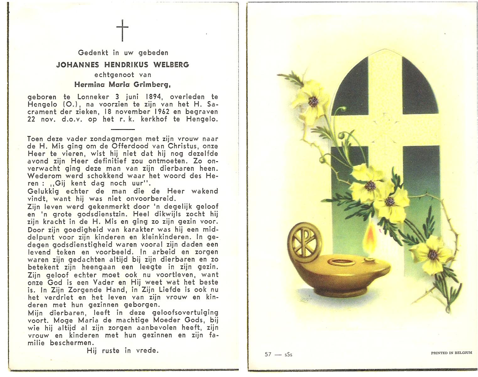 WELBERG, Johannes Hendrikus, geboren op 03-06-1894 te Lonneker, overleden op 18-11-1962 te Hengelo (Ov.) op 68-jarige leeftijd, begraven op 22-11-1962 te Hengelo (Ov.).