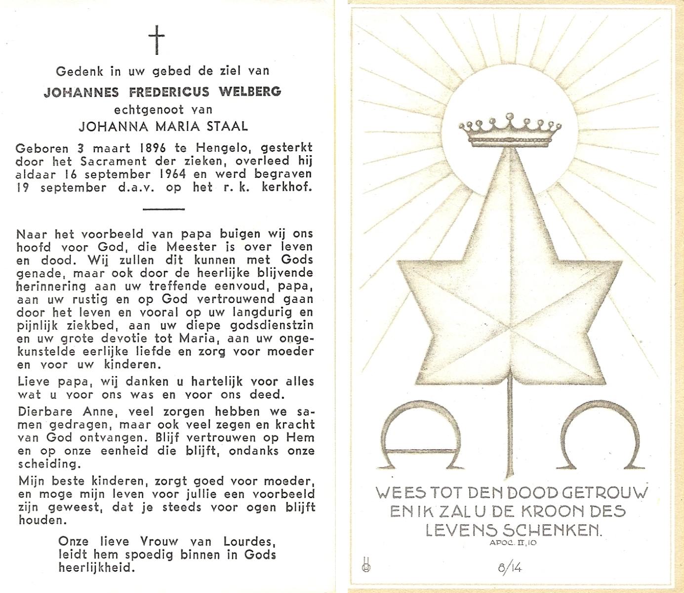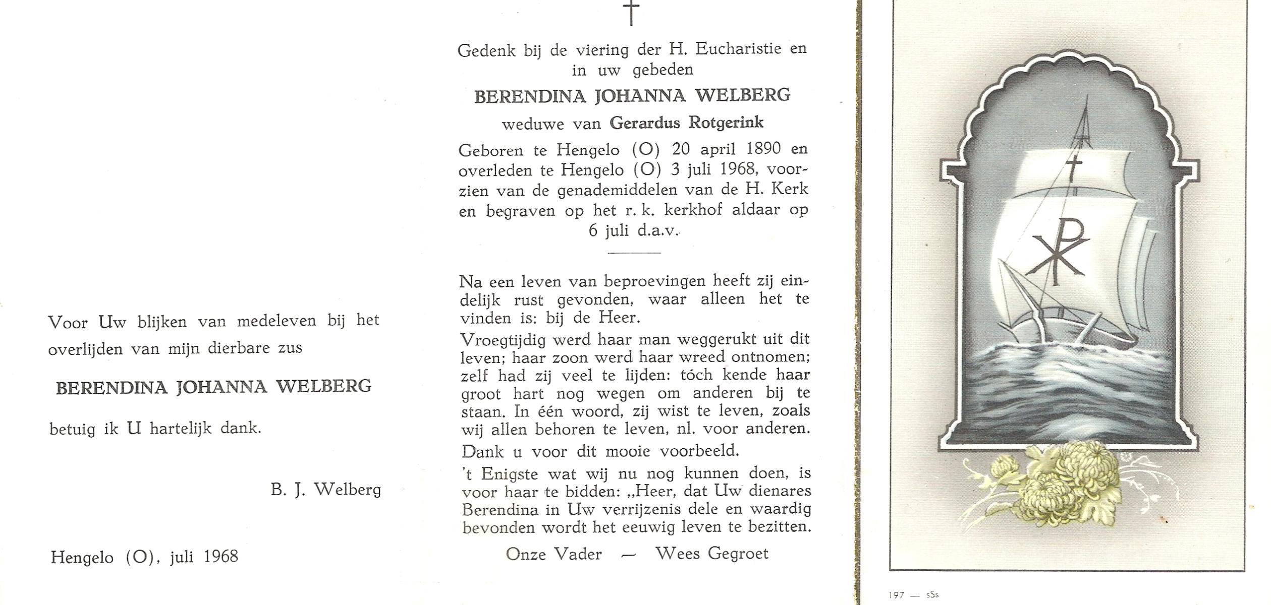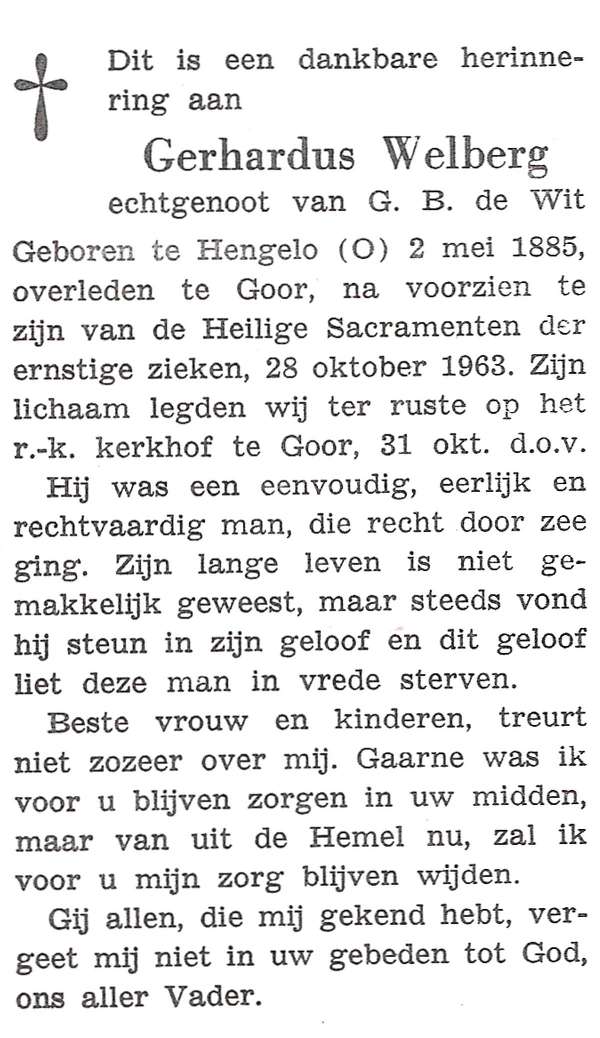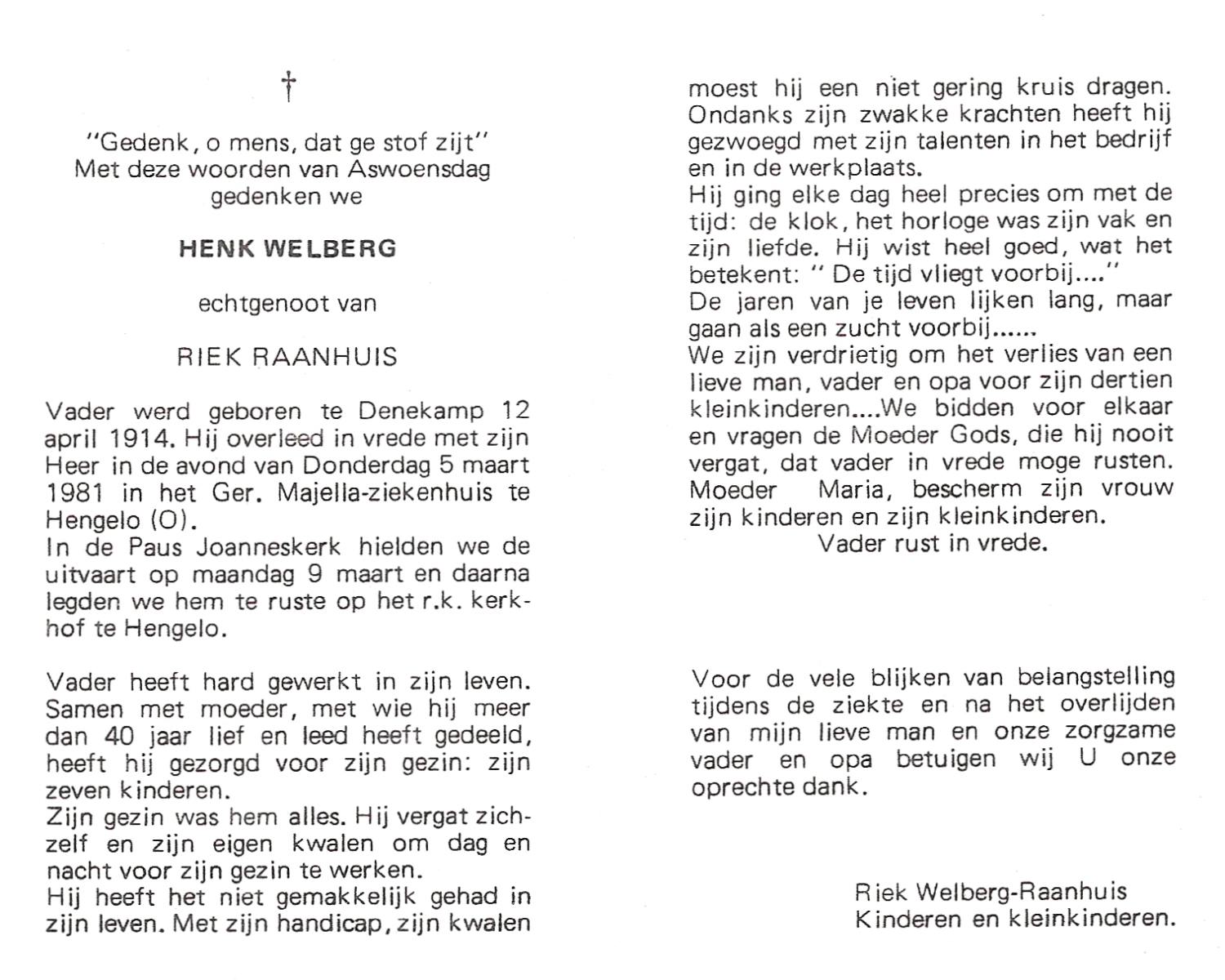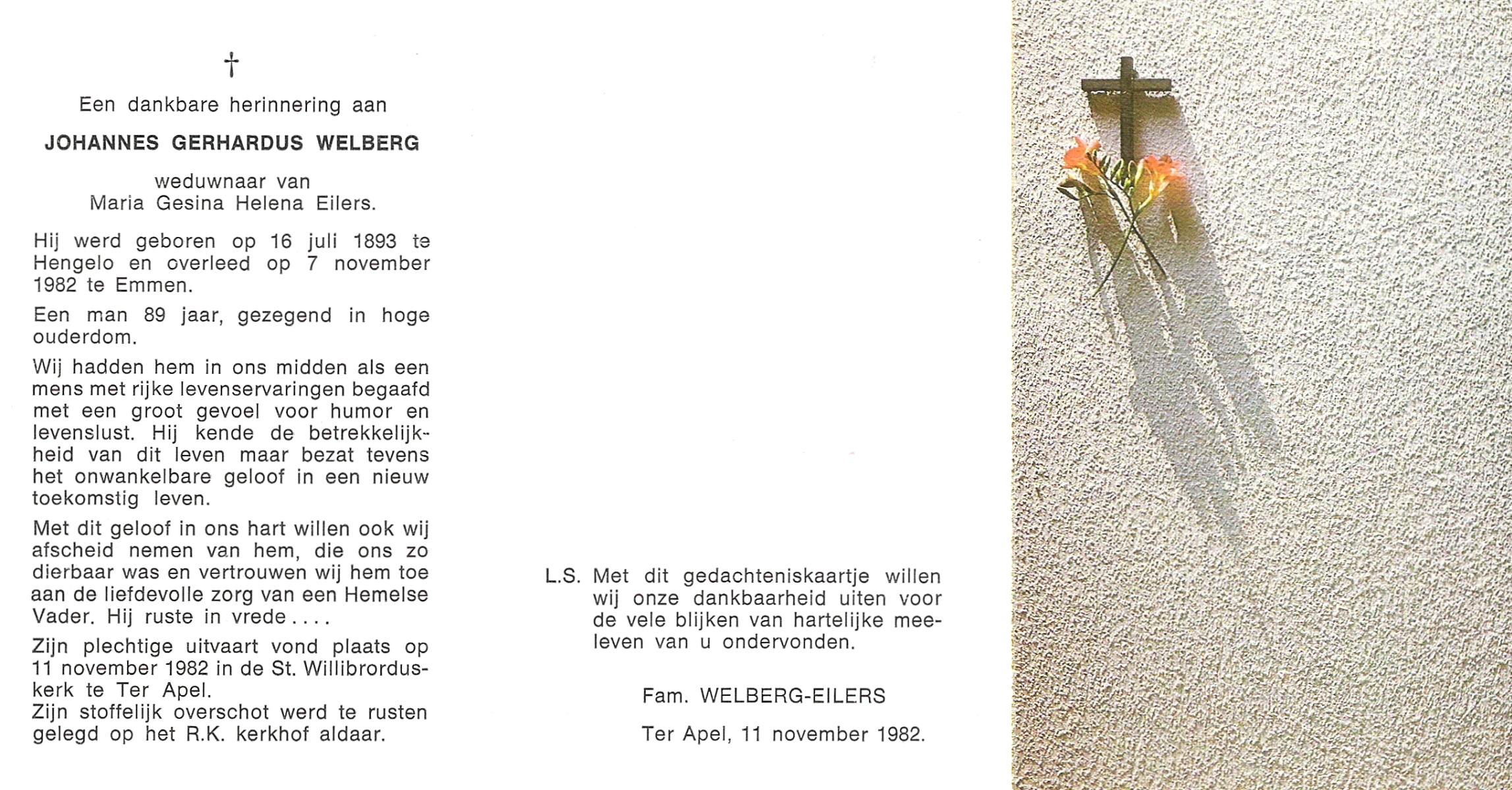 WELBERG, Johannes Hendrikus, geboren op 03-06-1894 te Lonneker, overleden op 18-11-1962 te Hengelo (Ov.) op 68-jarige leeftijd, begraven op 22-11-1962 te Hengelo (Ov.).