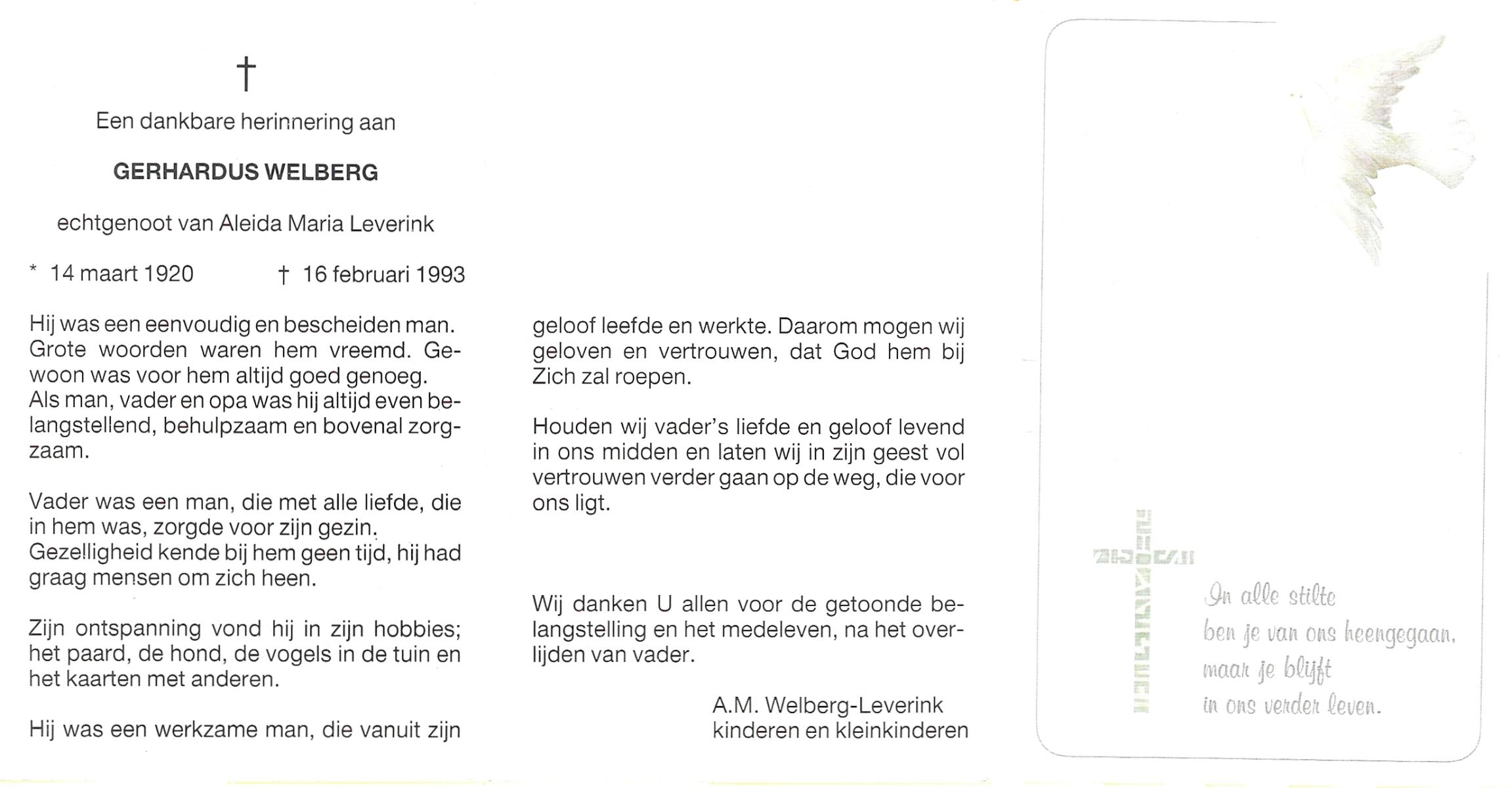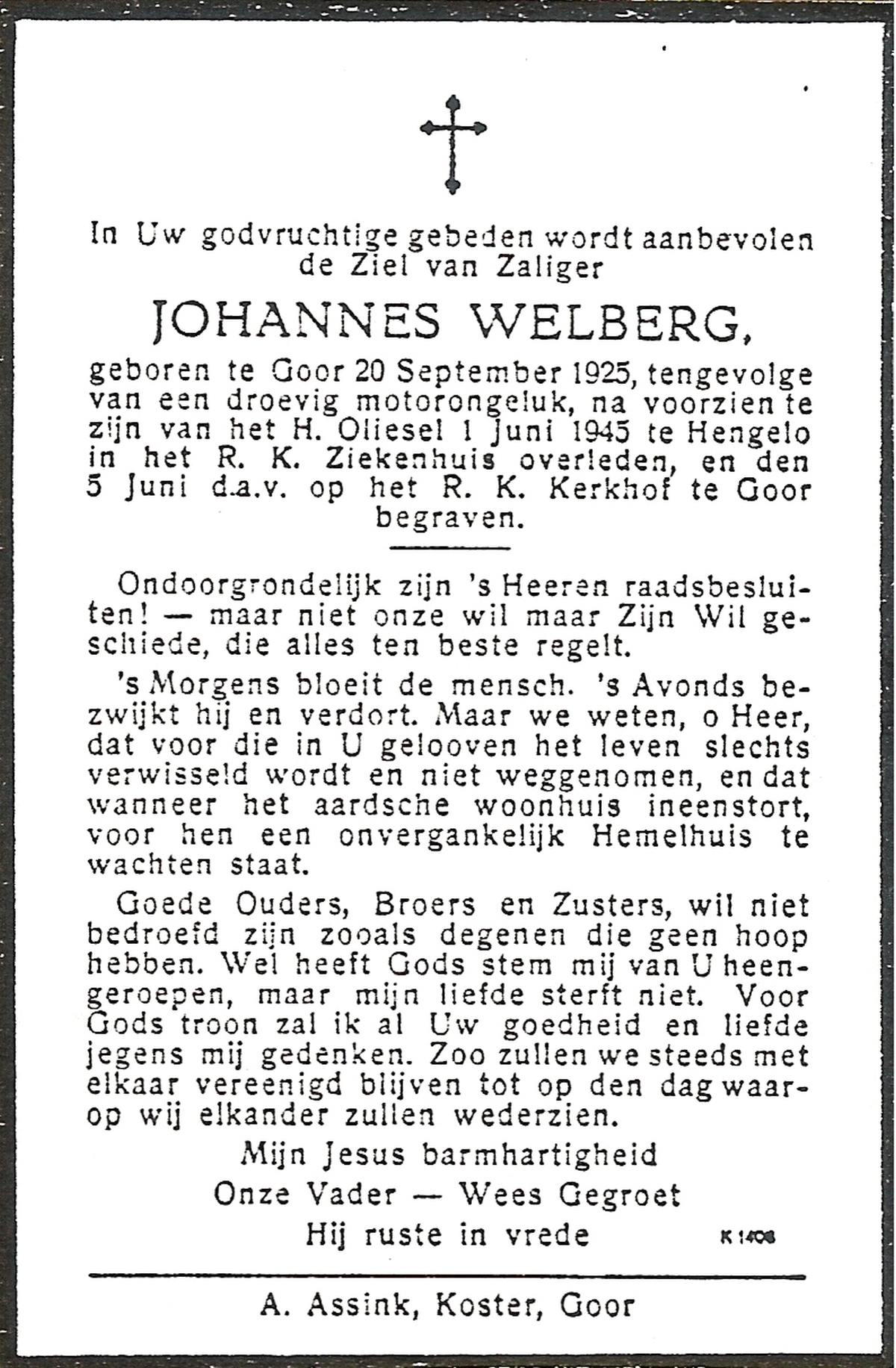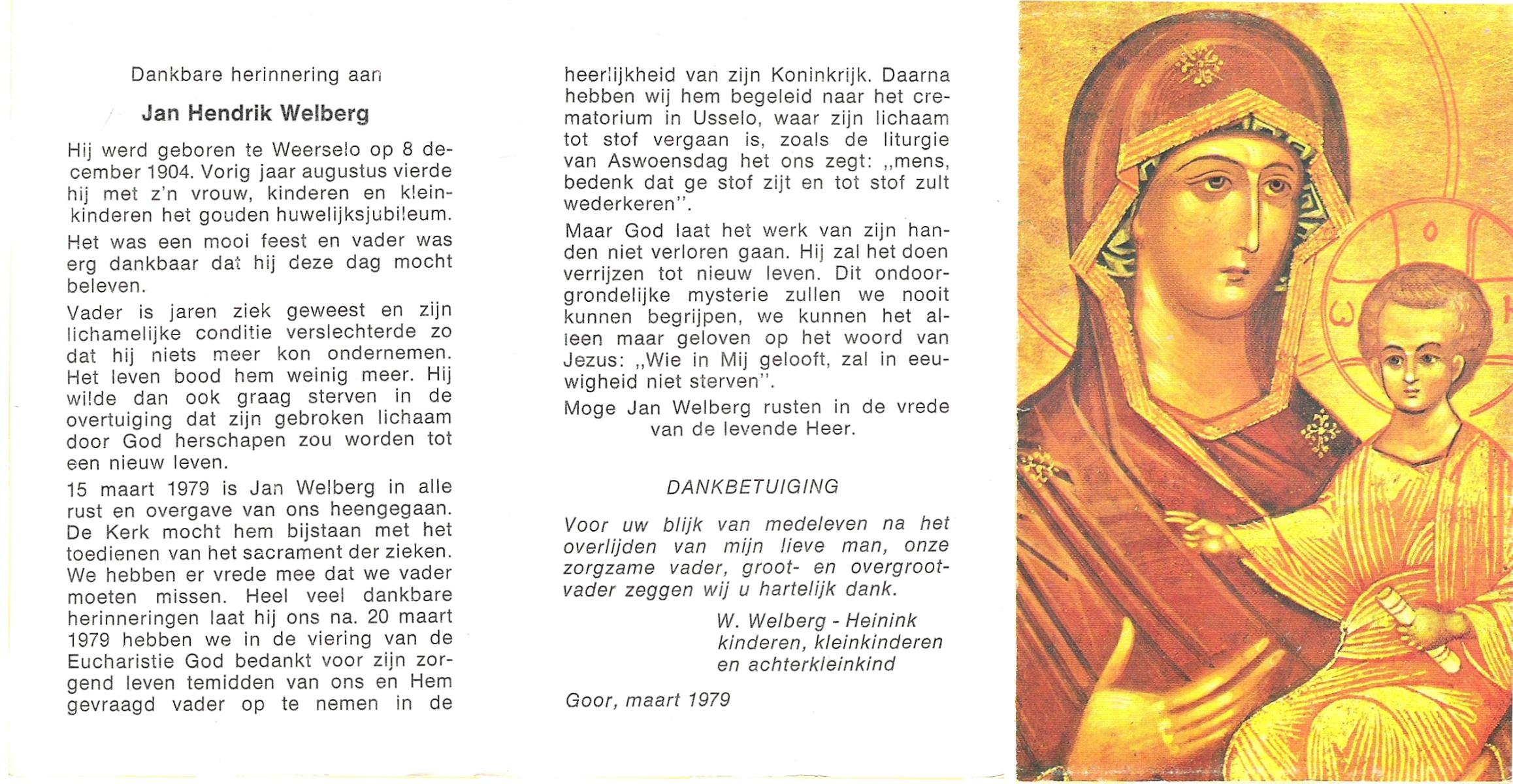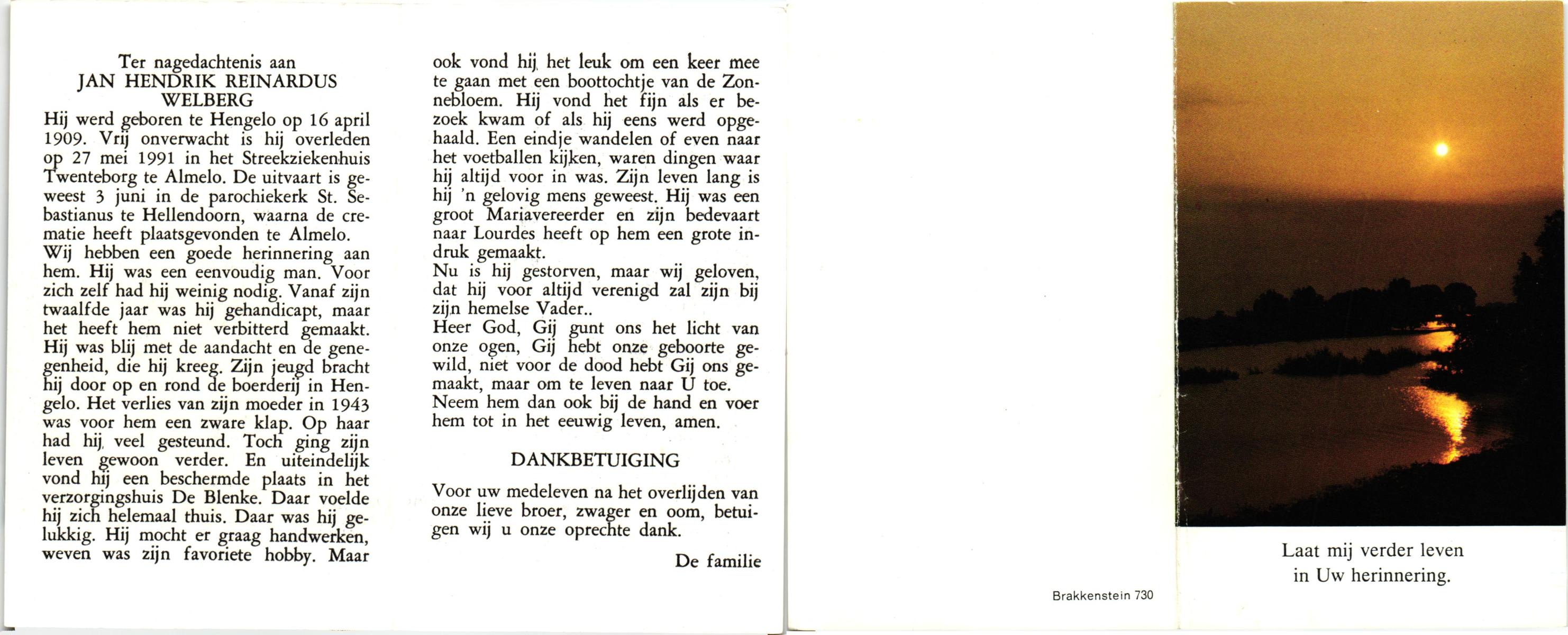WELBERG, Johannes Hendrikus, geboren op 03-06-1894 te Lonneker, overleden op 18-11-1962 te Hengelo (Ov.) op 68-jarige leeftijd, begraven op 22-11-1962 te Hengelo (Ov.).