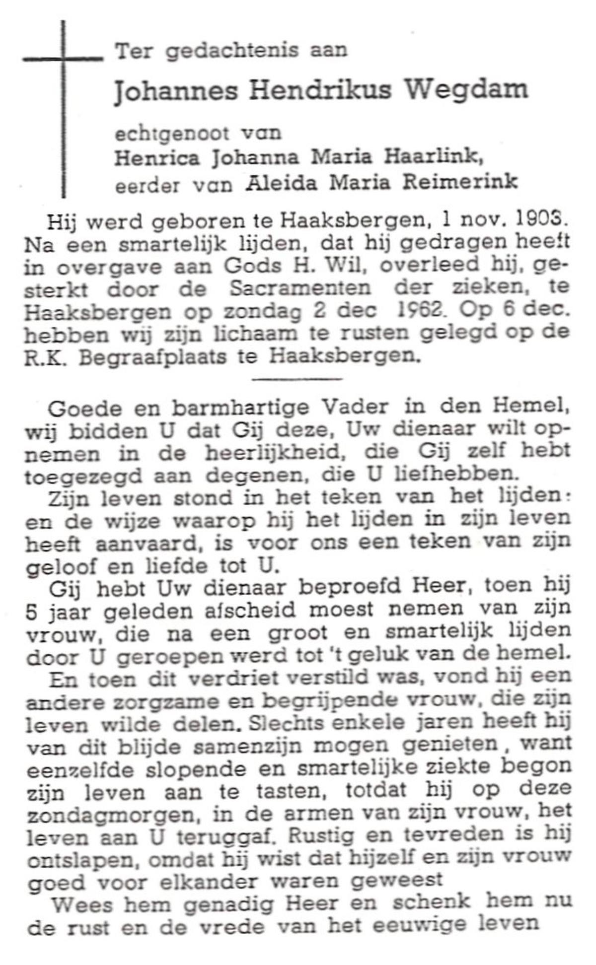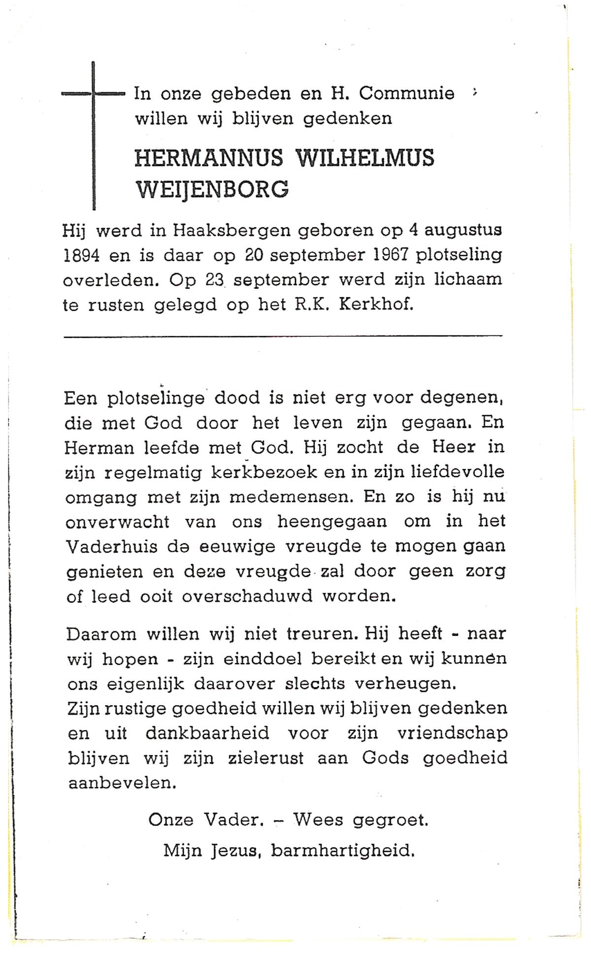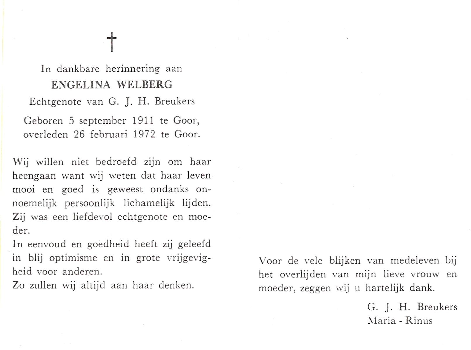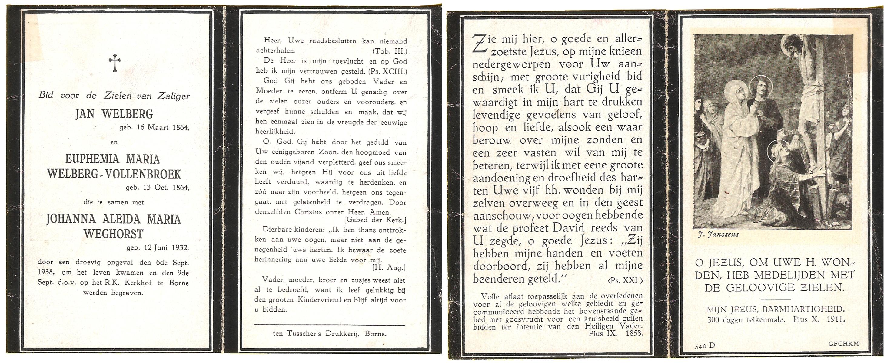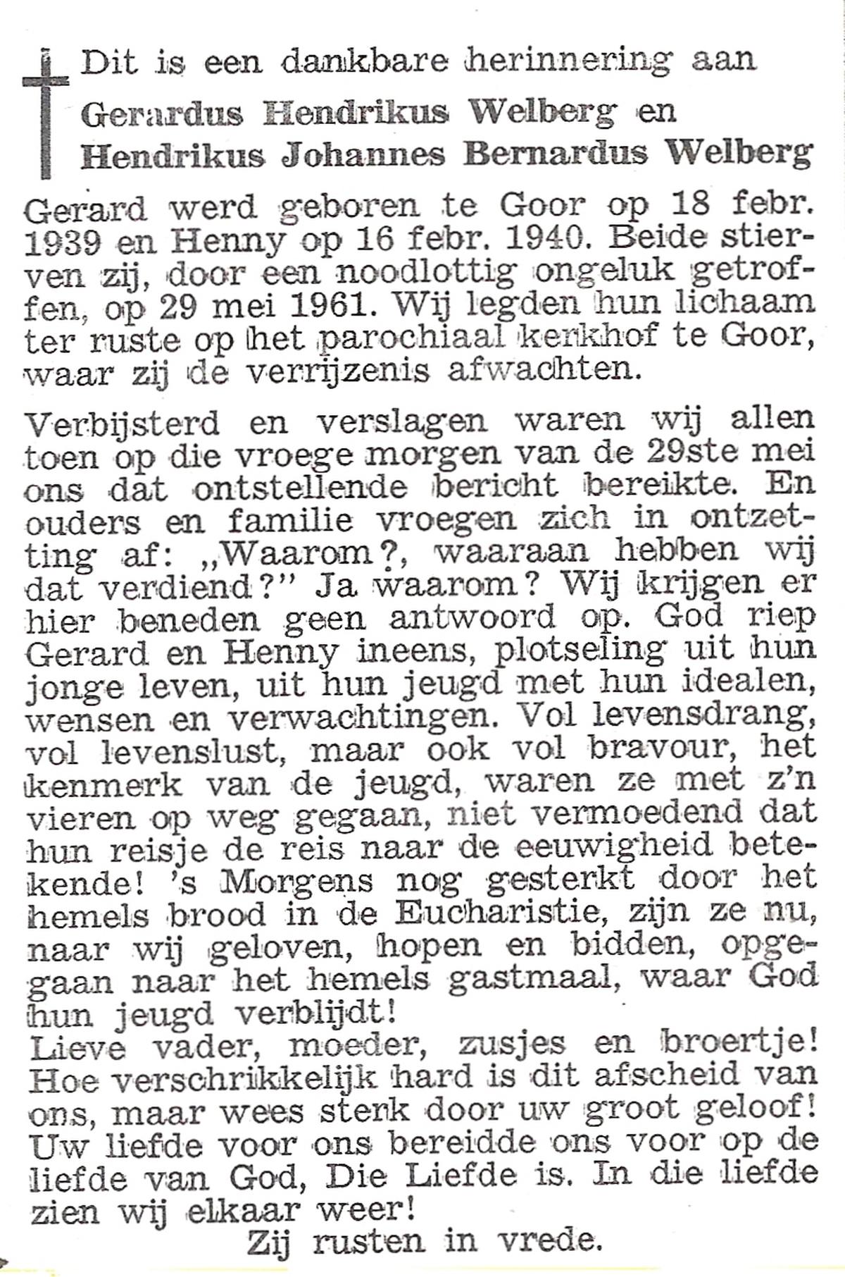 WELBERG, Johannes Hendrikus, geboren op 03-06-1894 te Lonneker, overleden op 18-11-1962 te Hengelo (Ov.) op 68-jarige leeftijd, begraven op 22-11-1962 te Hengelo (Ov.).