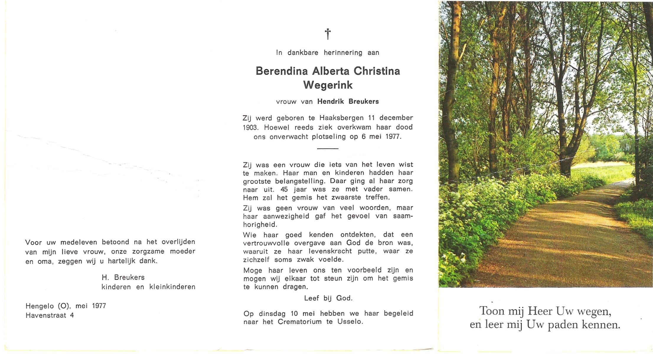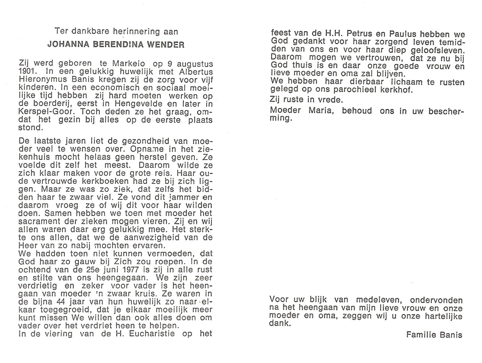 WENDER, Johanna Berendina, geboren op 9-8-1901 te Markelo, overleden op 25-6-1977 op 75-jarige leeftijd.