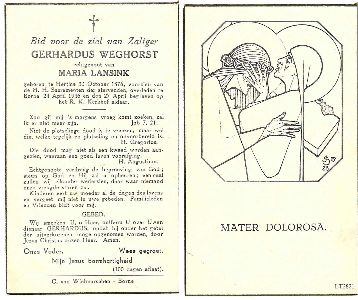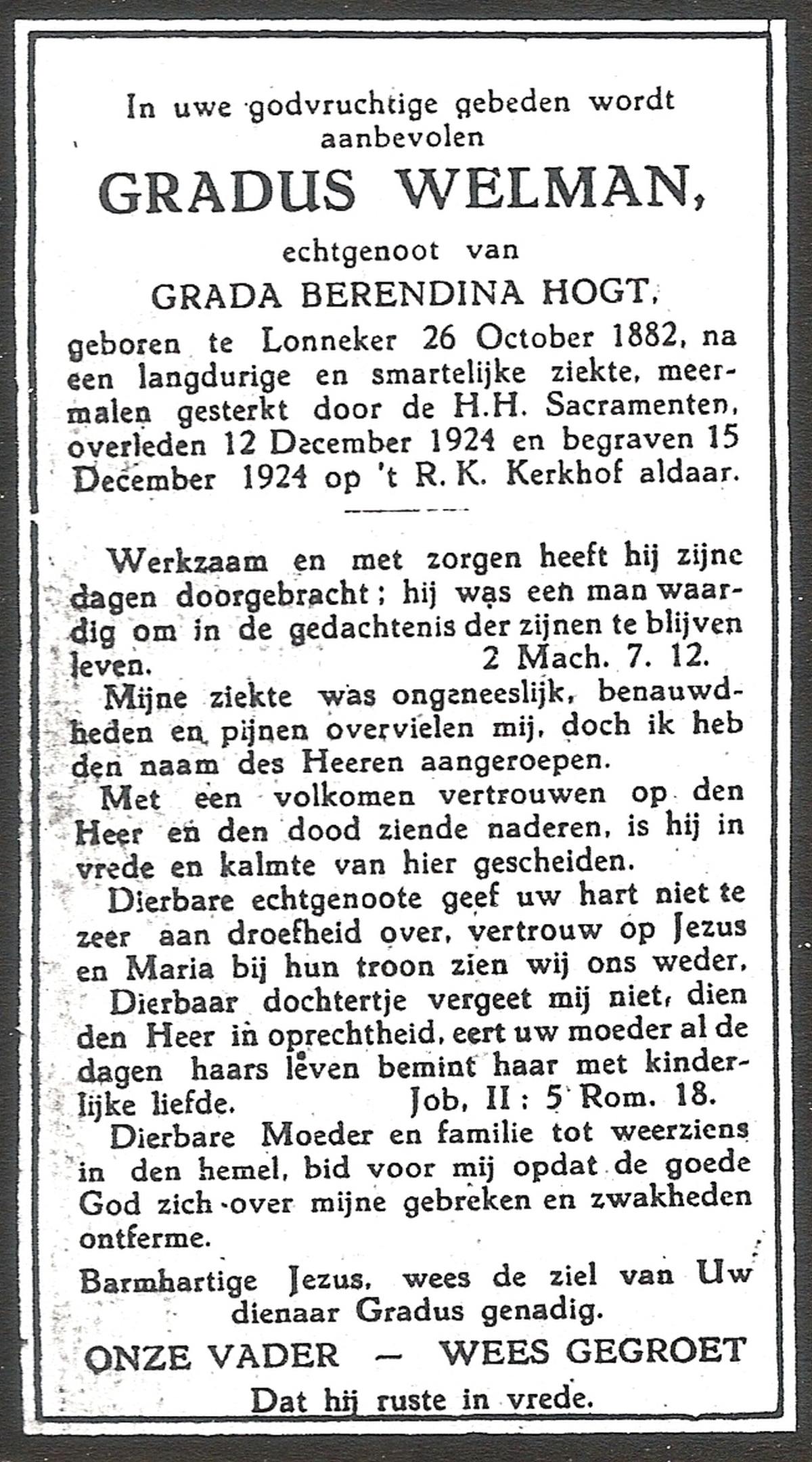 WELMAN, Gradus, geboren op 26-10-1882 te Lonneker, overleden op 12-12-1924 te Lonneker op 42-jarige leeftijd, begraven op 15-12-1924 te Lonneker R.K.Kerkhof.