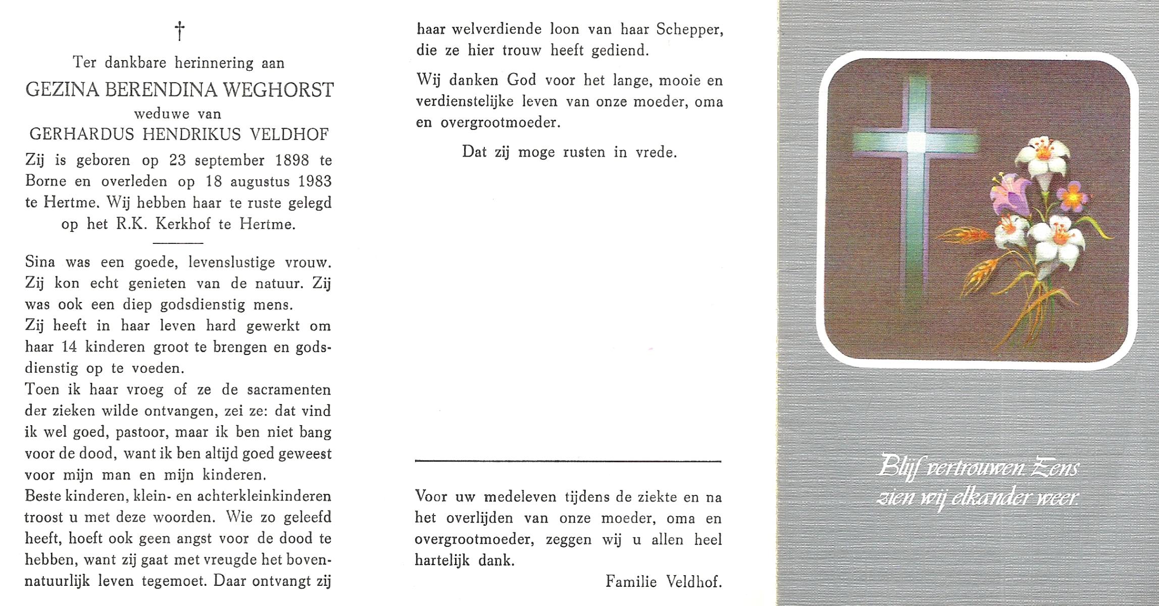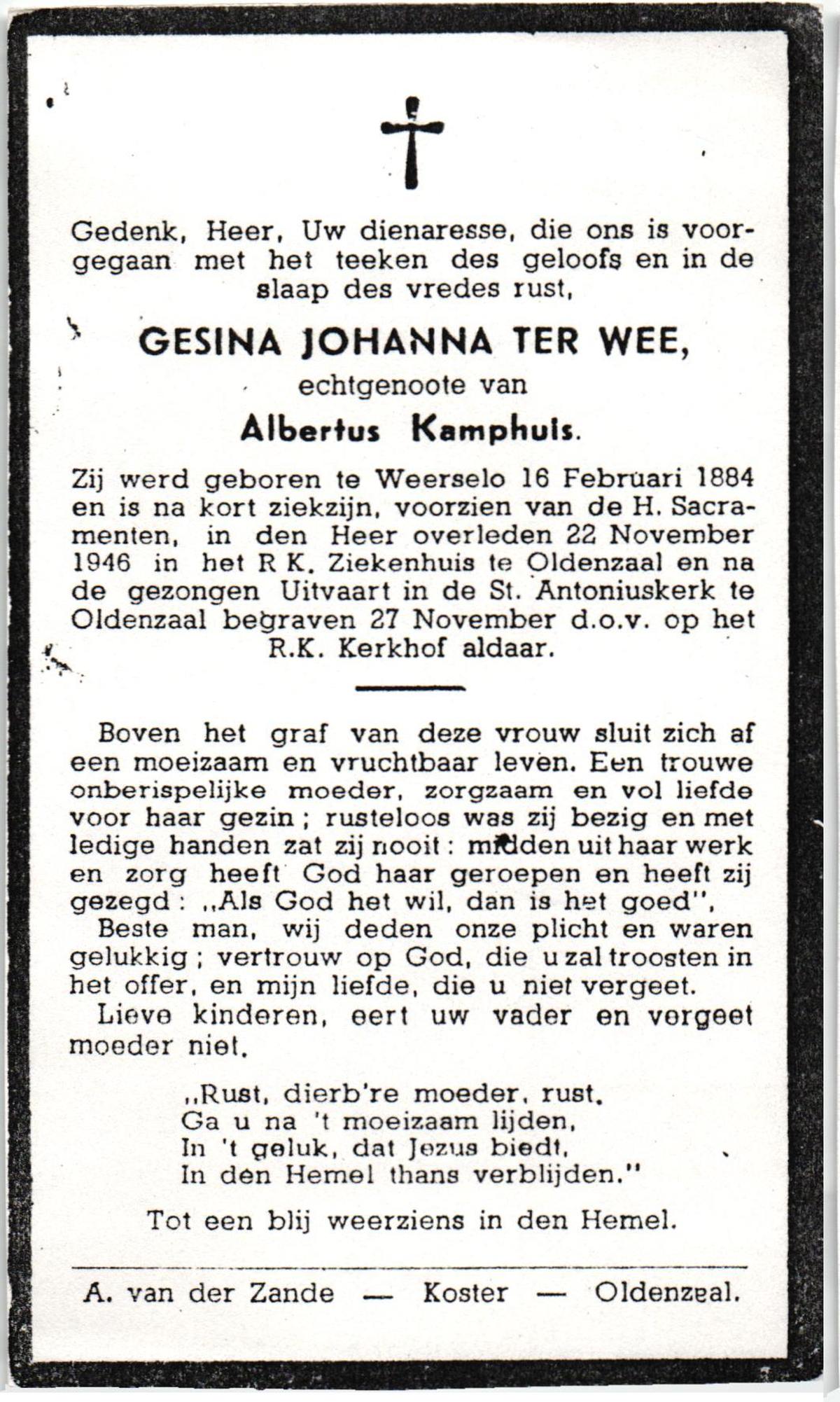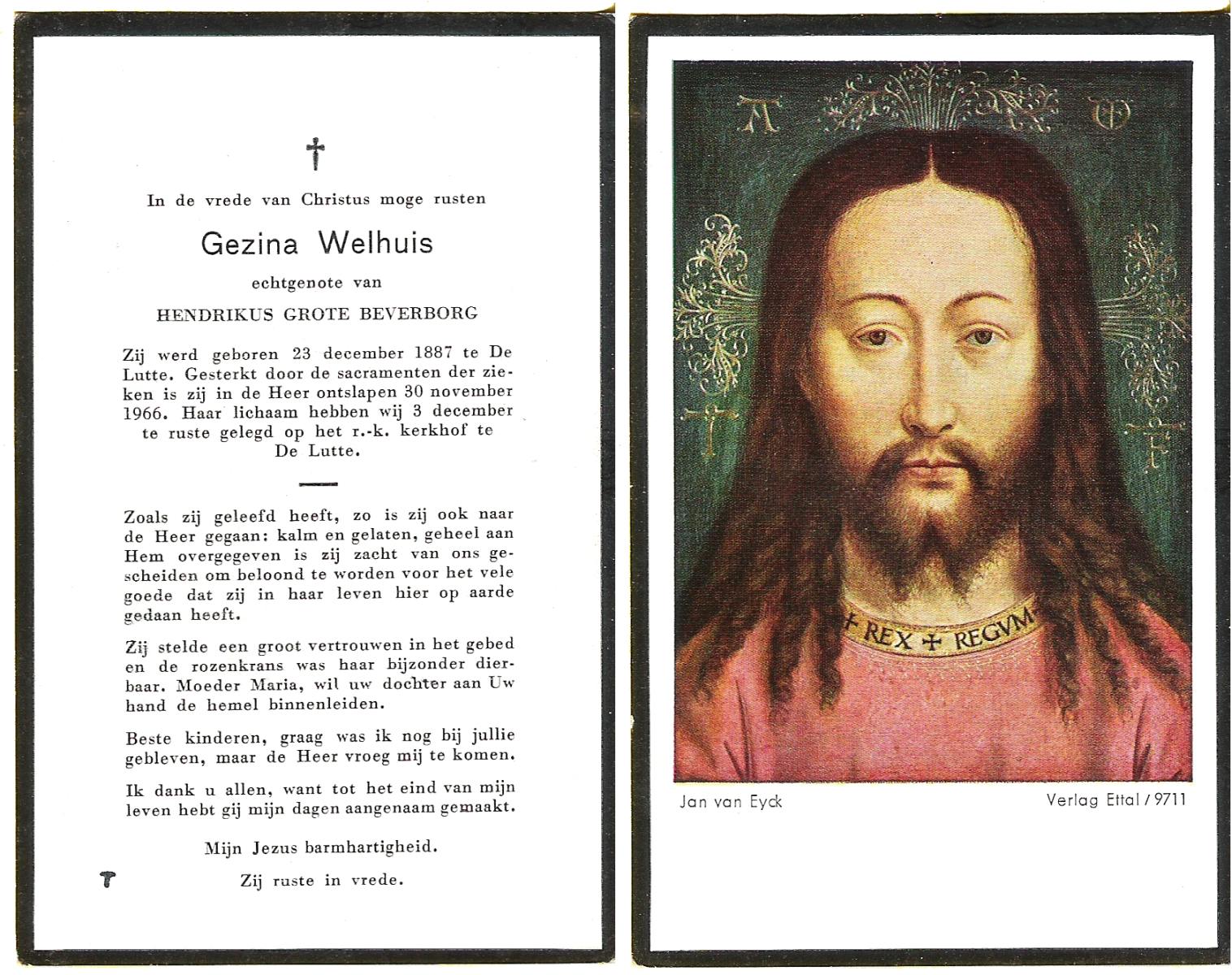 WELHUIS, Gezina, geboren op 23-12-1887 te De Lutte, overleden op 30-11-1966 op 78-jarige leeftijd, begraven op 3-12-1966 te De Lutte.