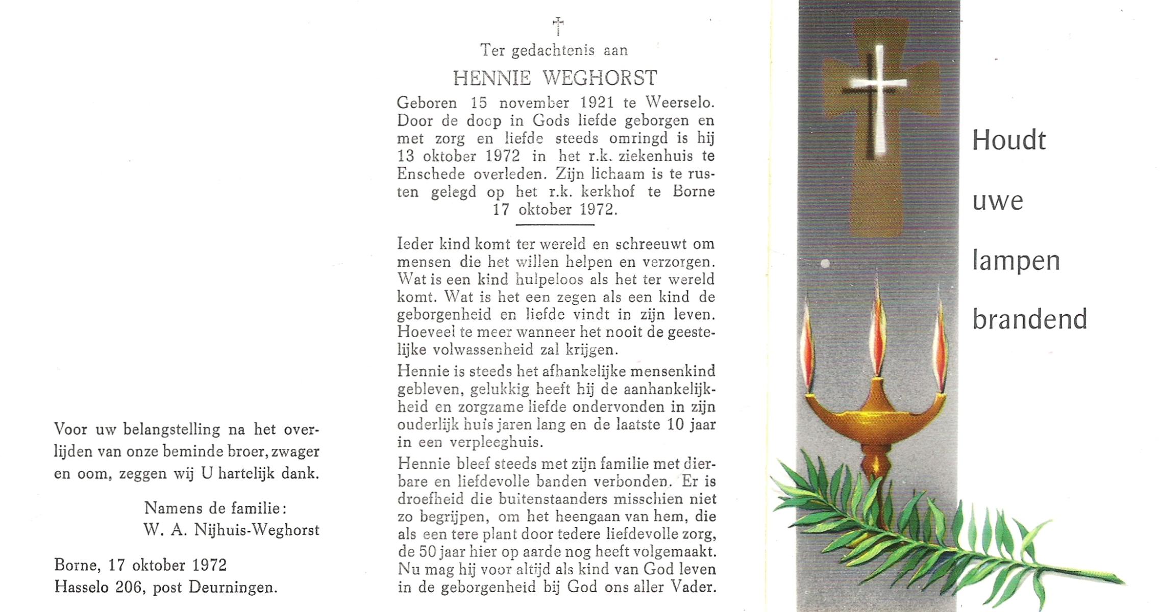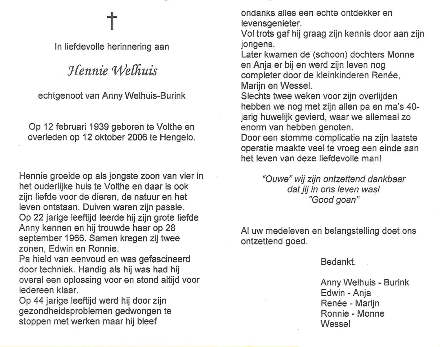WELHUIS, Hennie, geboren op 12-2-1939 te Volthe, overleden op 12-10-2006 te Hengelo (Ov.) op 67-jarige leeftijd.