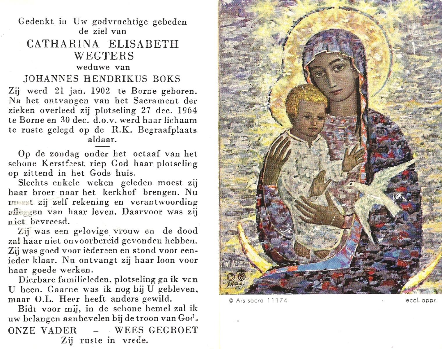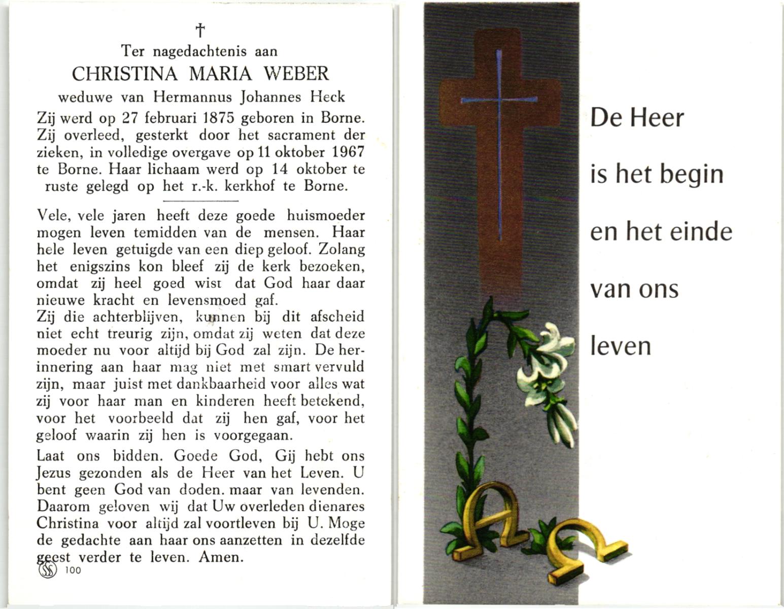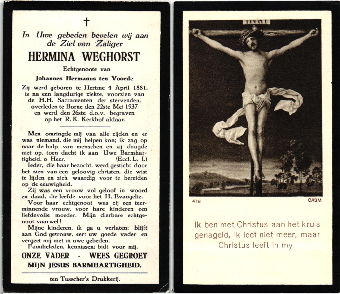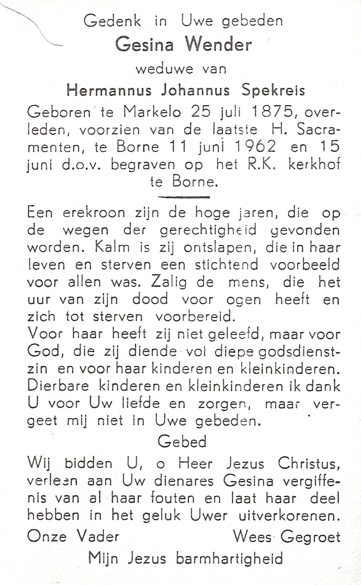 WENDER, Gesina, geboren op 25-07-1875 te Markelo, overleden op 11-6-1962 te Borne op 86-jarige leeftijd, begraven op 15-6-1962 te Borne.