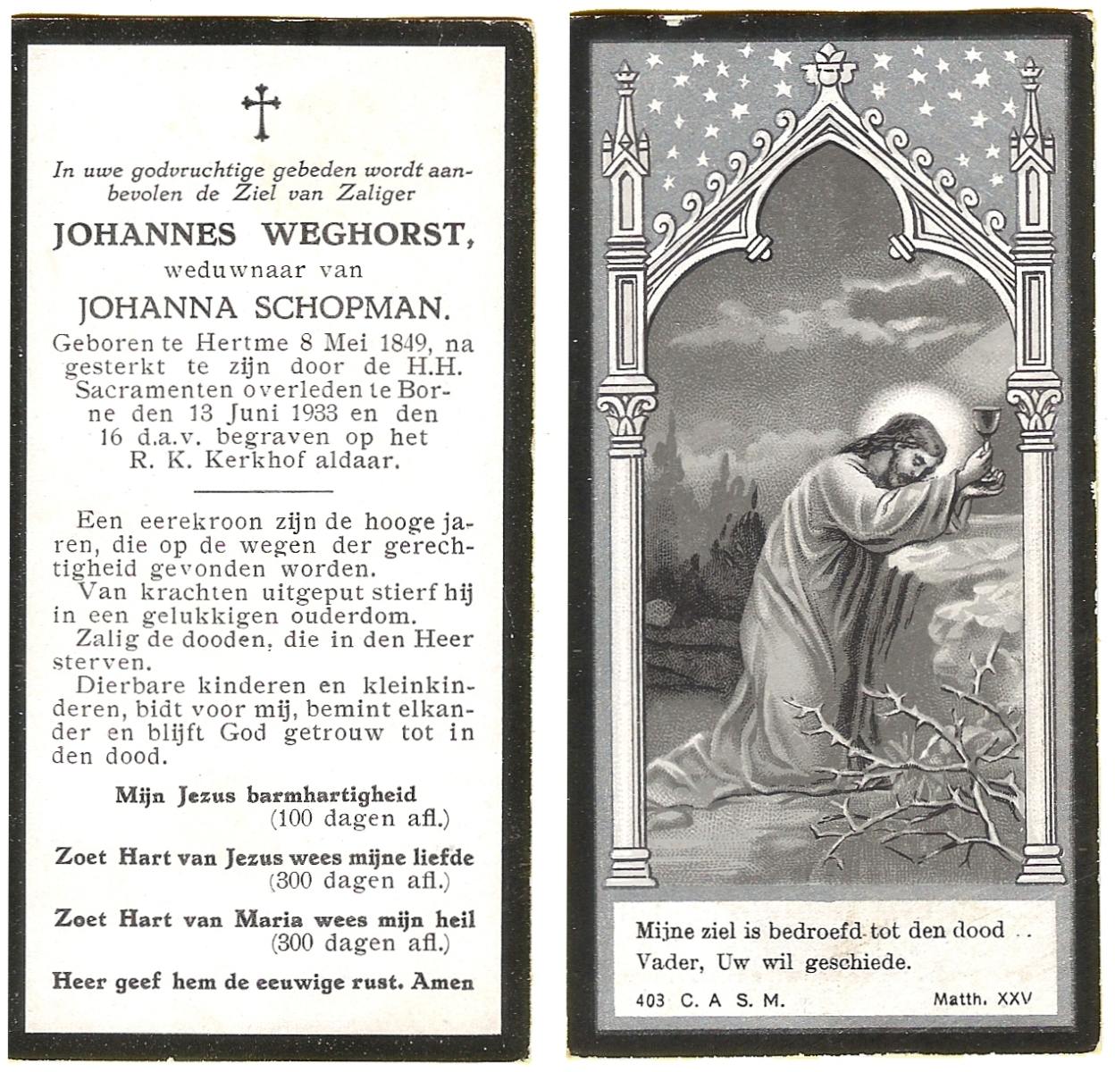 WELMAN, Johannes, geboren op 19-02-1875 te Lonneker, overleden op 29-4-1938 te Enschede, ziekenhuis op 62-jarige leeftijd, begraven op 3-5-1938 te Enschede.