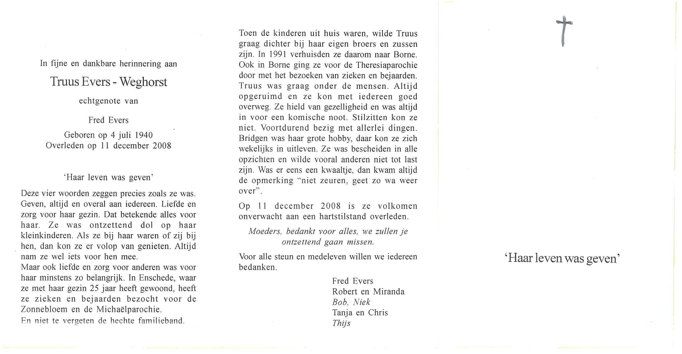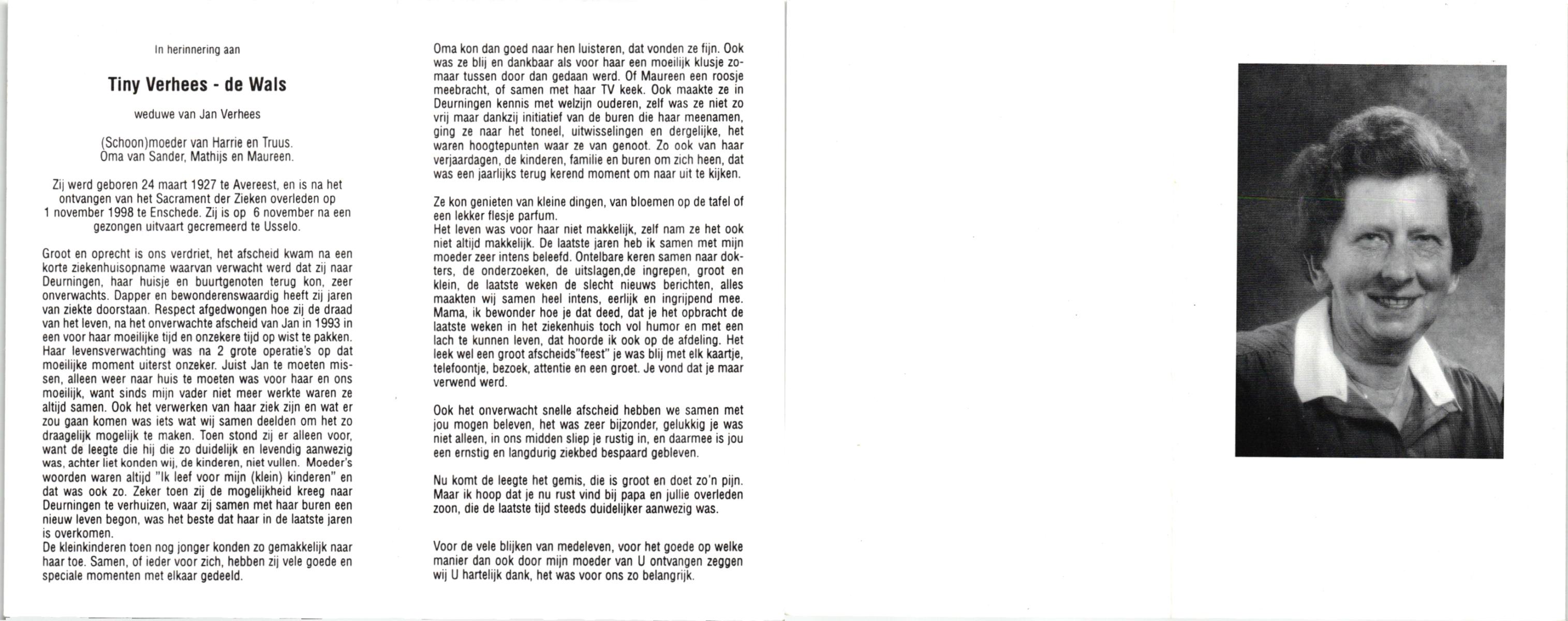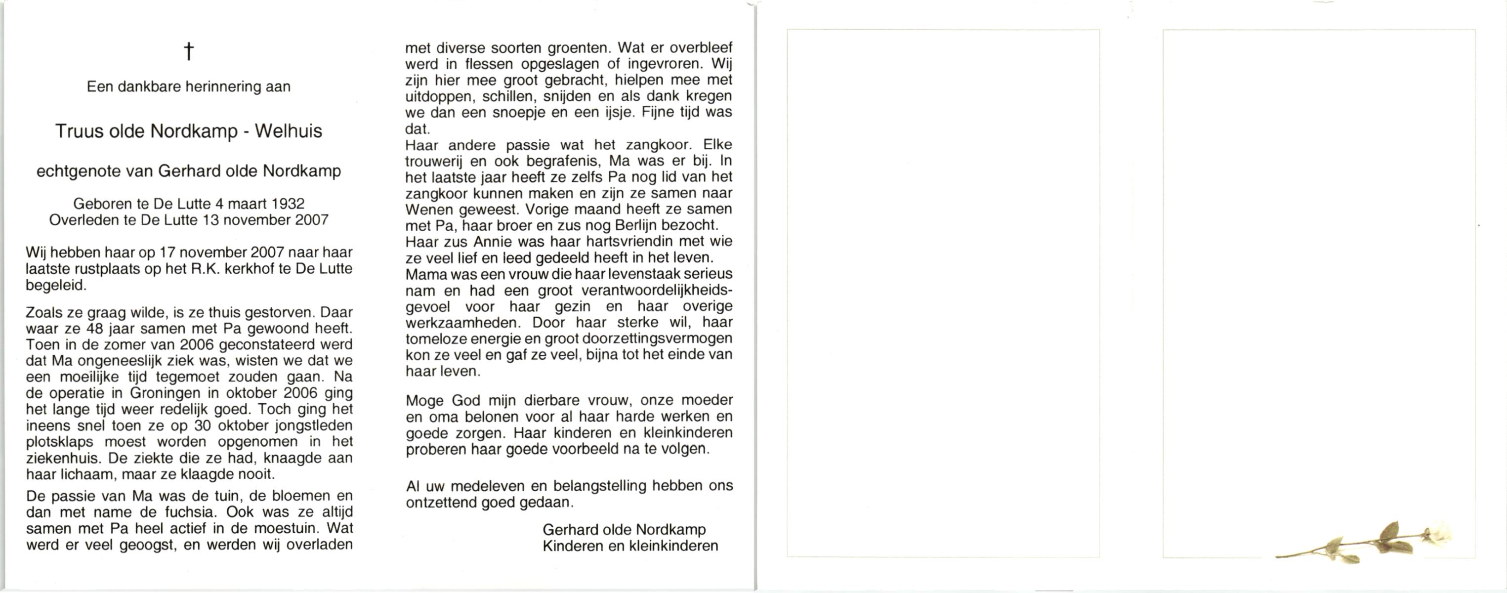 WELHUIS, , Truus, geboren op 4-3-1932 te De Lutte, overleden op 13-11-2007 te De Lutte op 75-jarige leeftijd.