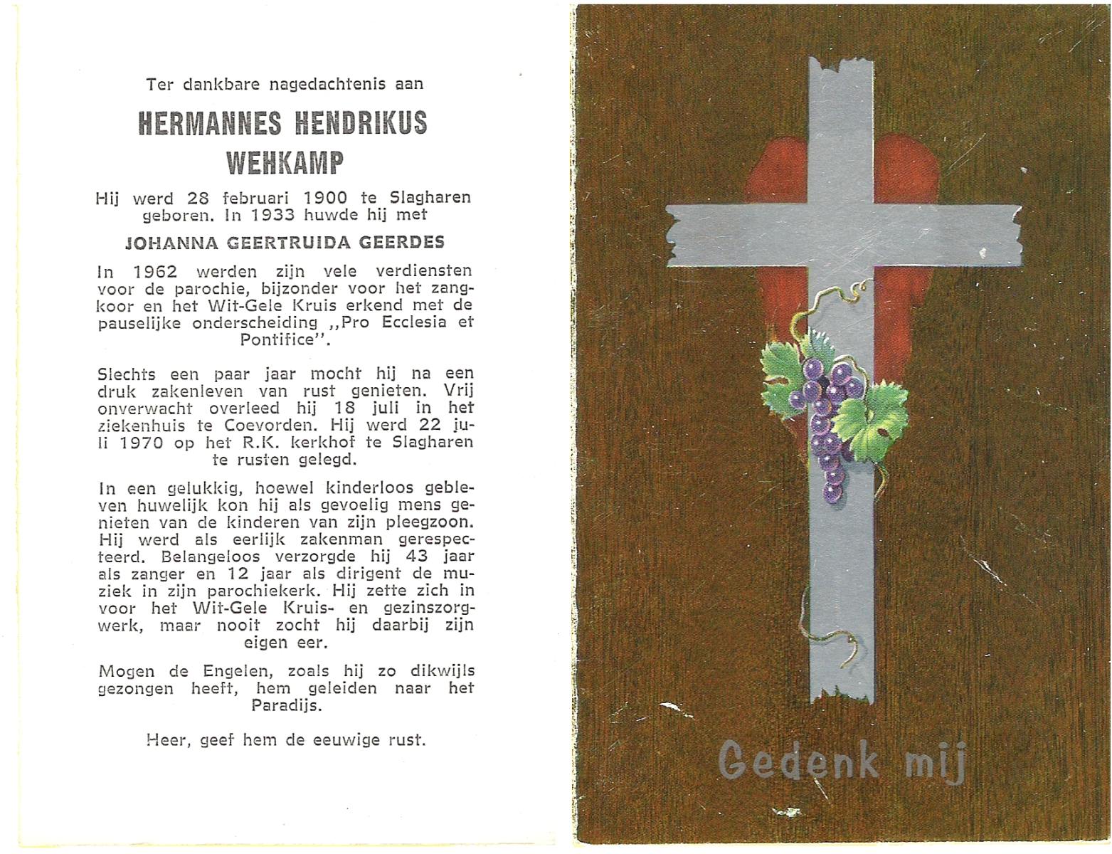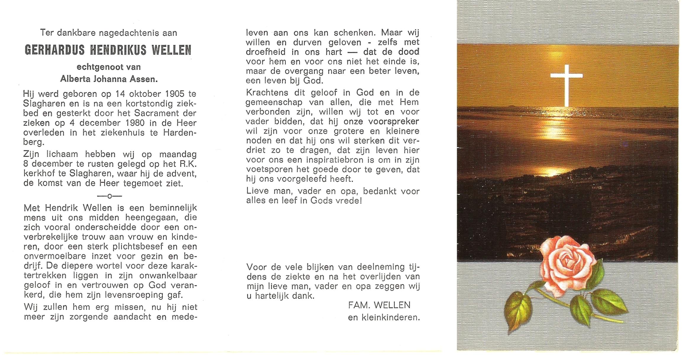 WELLEN, Gerhardus Hendrikus, geboren op 14-10-1905 te Slagharen, overleden op 4-12-1980 te Hardenberg op 75-jarige leeftijd, begraven op 8-12-1980 te Slagharen.