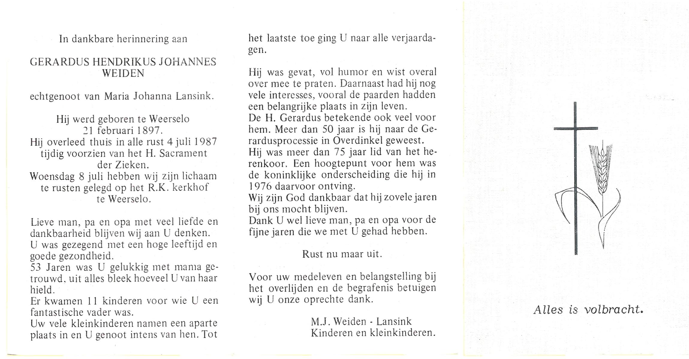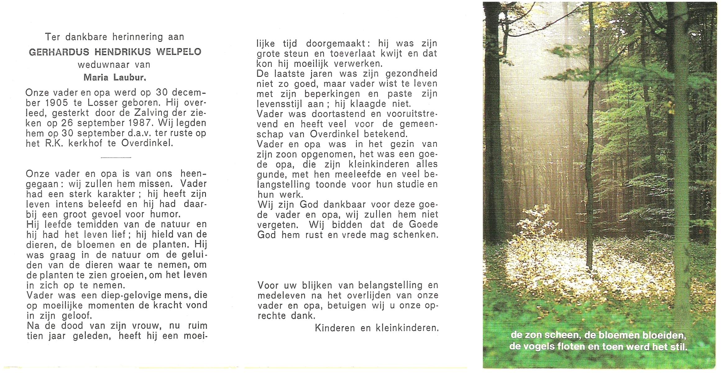 WELPELO, Gerhardus Hendrikus, geboren op 30-12-1905 te Losser, overleden op 26-9-1987 op 81-jarige leeftijd, begraven op 30-9-1987 te Overdinkel.