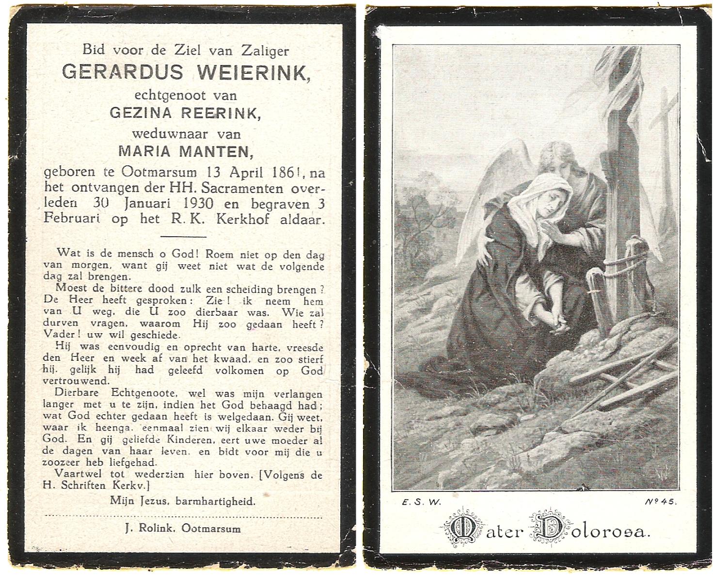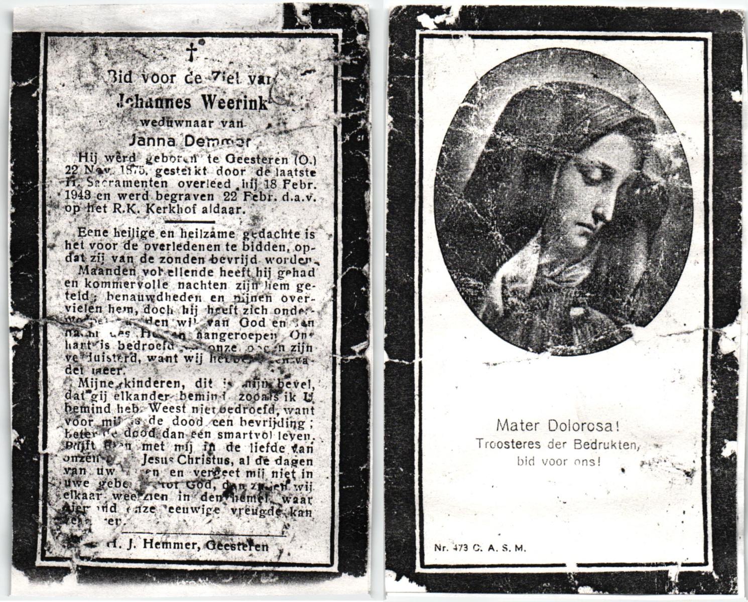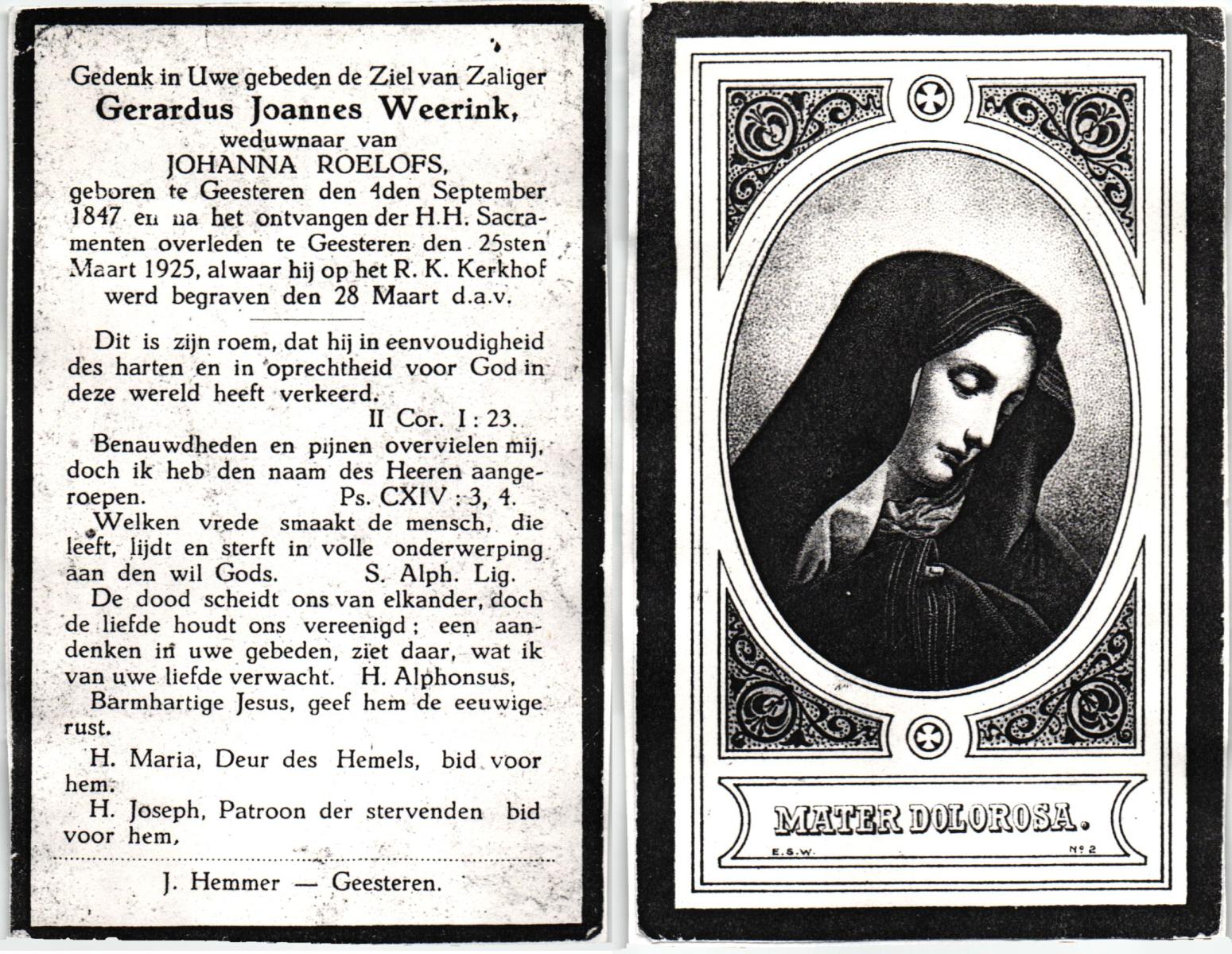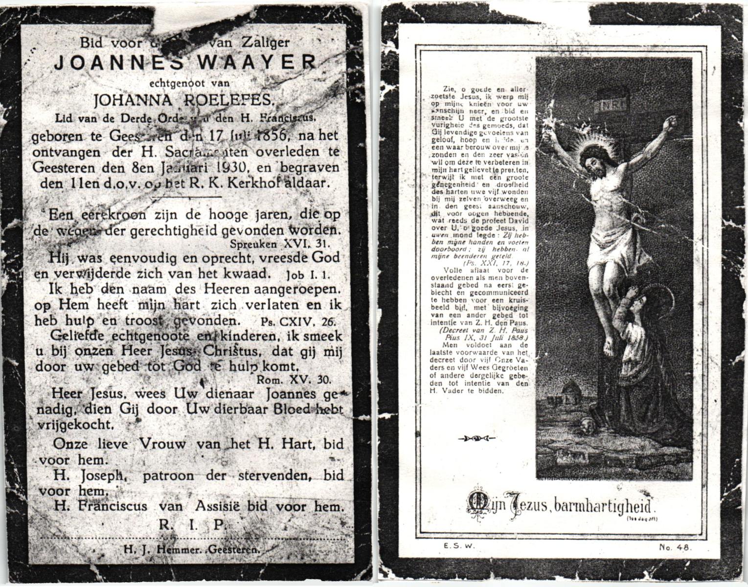 WAAYER, Joannes, geboren op 17-07-1856 te Geesteren, overleden op 8-1-1930 te Geesteren op 73-jarige leeftijd, begraven op 11-1-1930 te Geesteren.