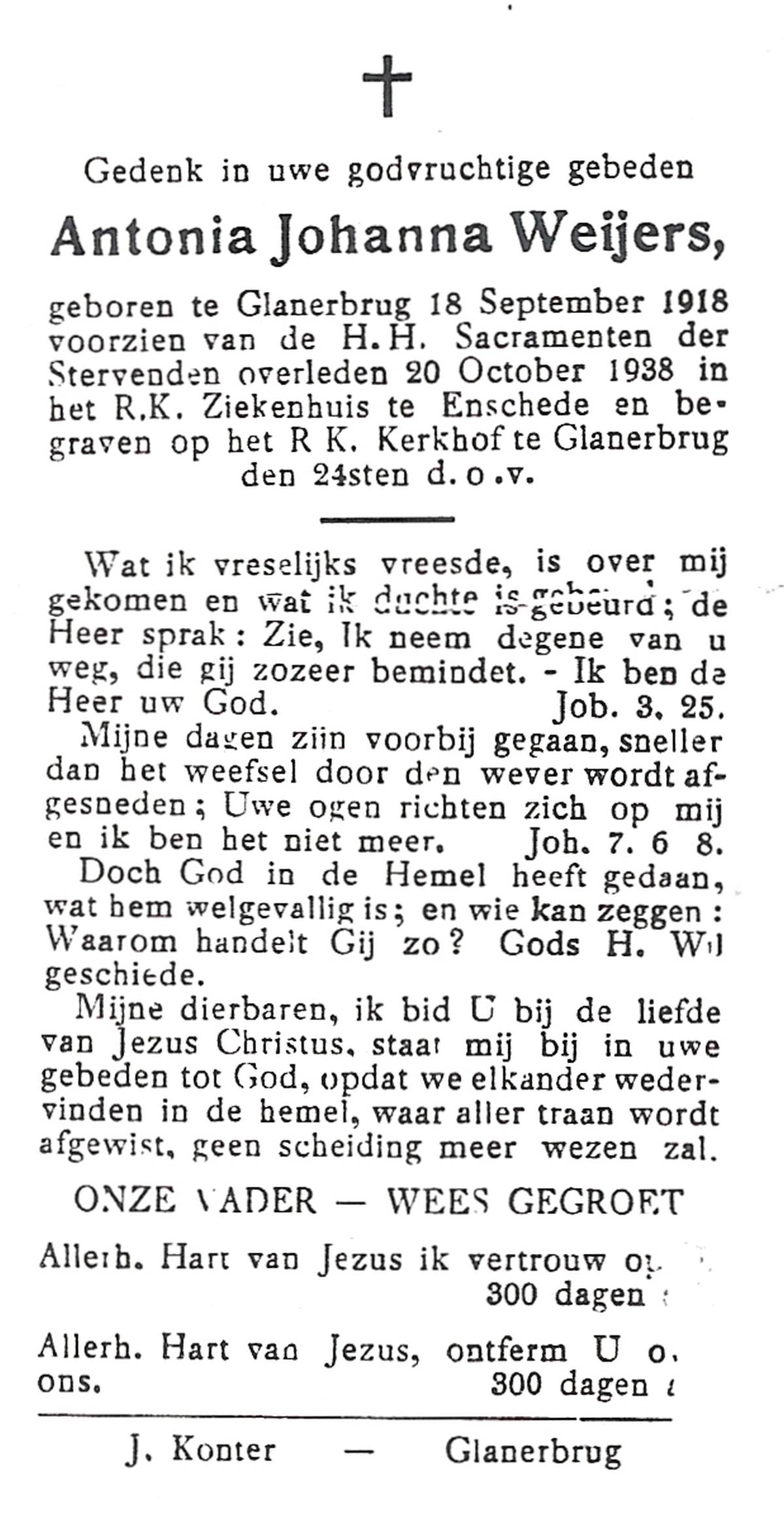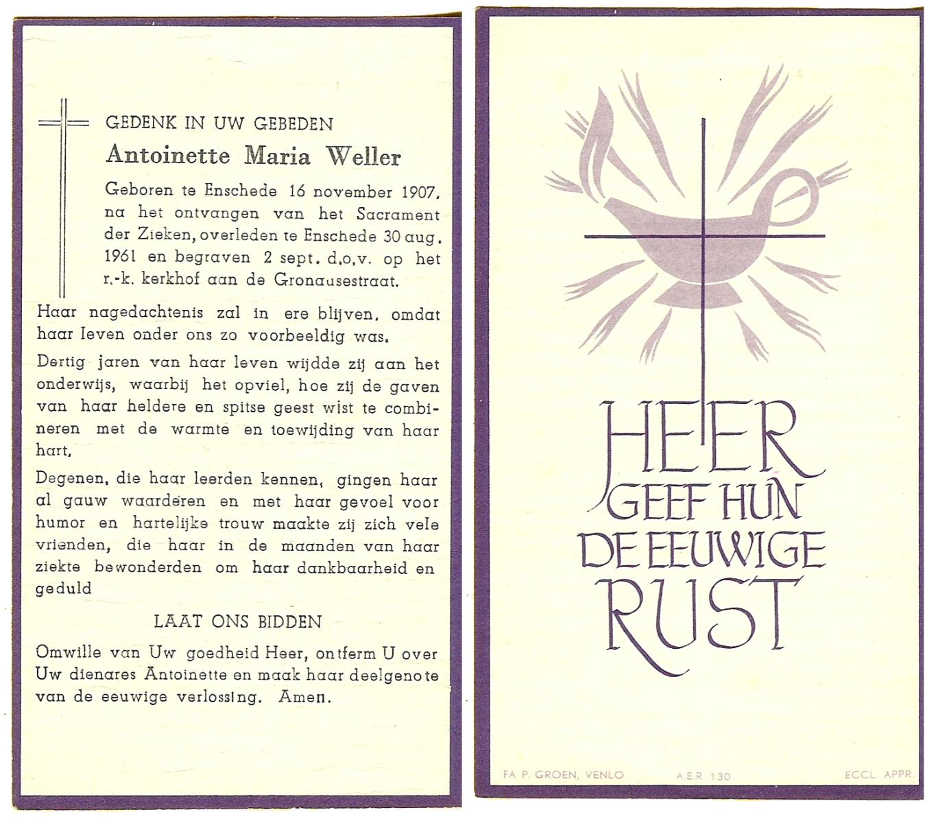 WELLER, Antoinette Maria, geboren op 16-11-1907 te Enschede, overleden op 30-8-1961 te Enschede op 53-jarige leeftijd, begraven op 2-9-1961 te Enschede.