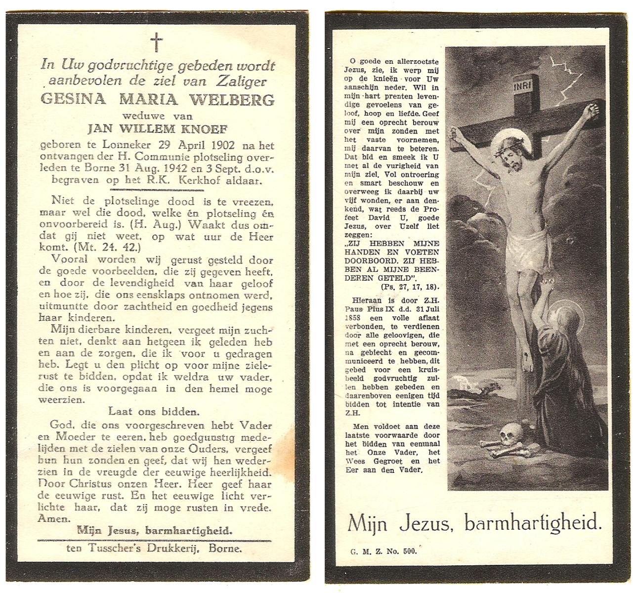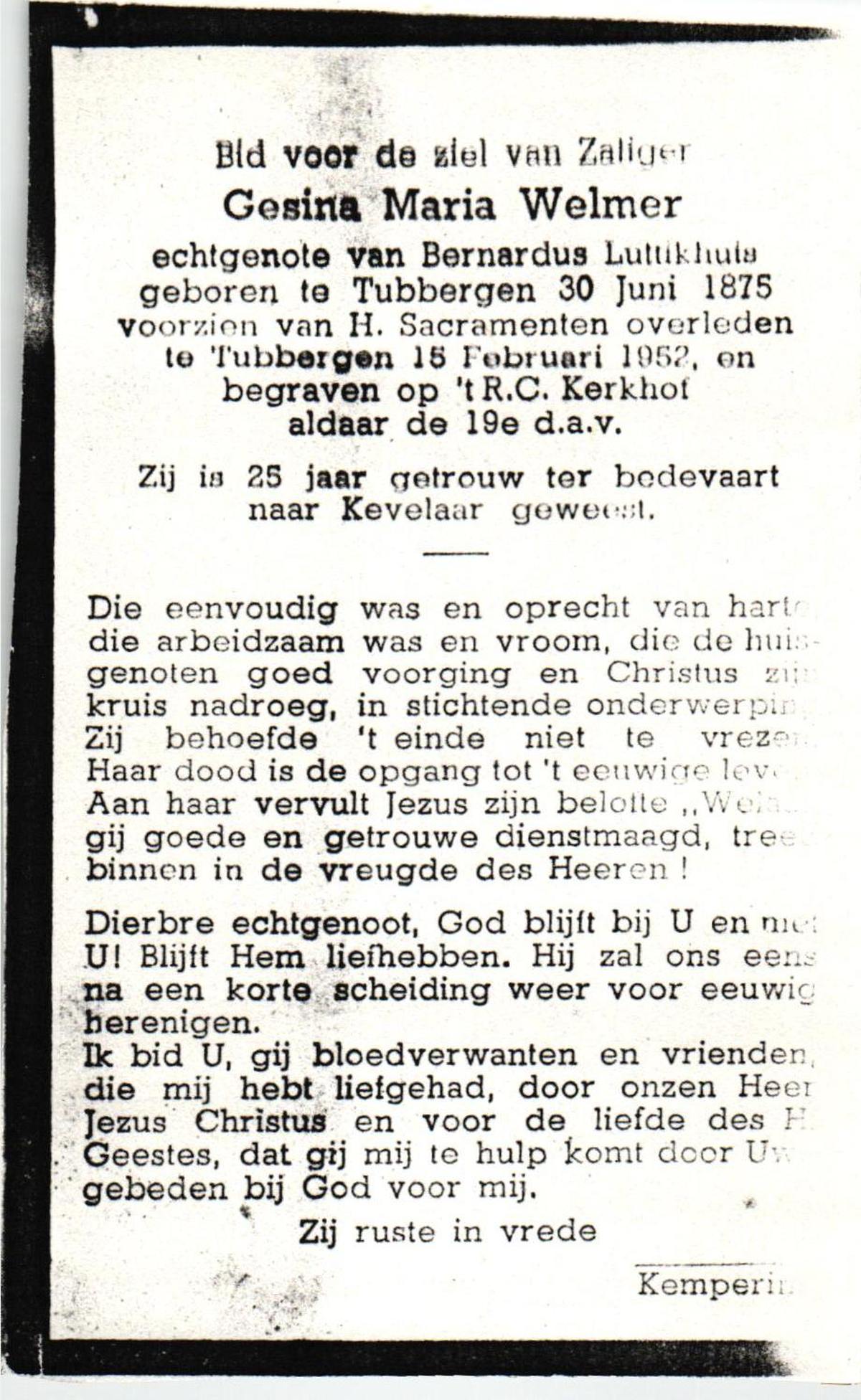 WELMER, Gesina Maria, geboren op 30-06-1875 te Tubbergen, overleden op 15-2-1952 te Tubbergen op 76-jarige leeftijd, begraven op 19-2-1952 te Tubbergen.